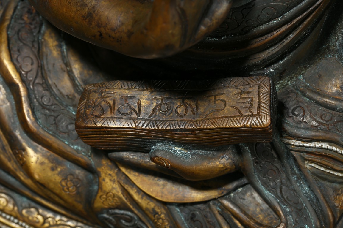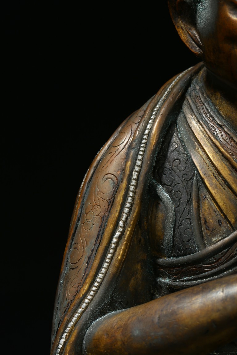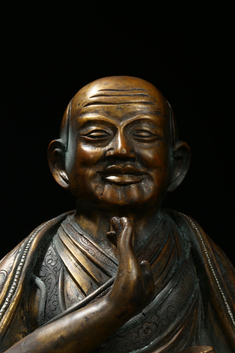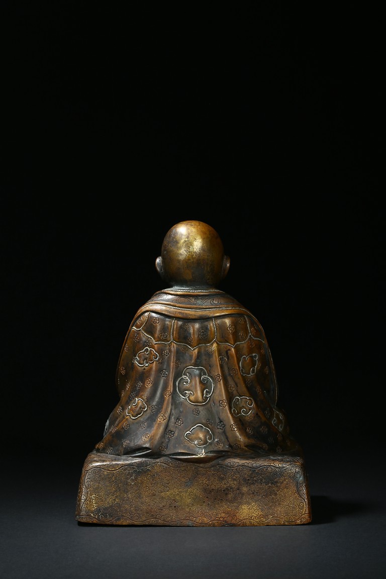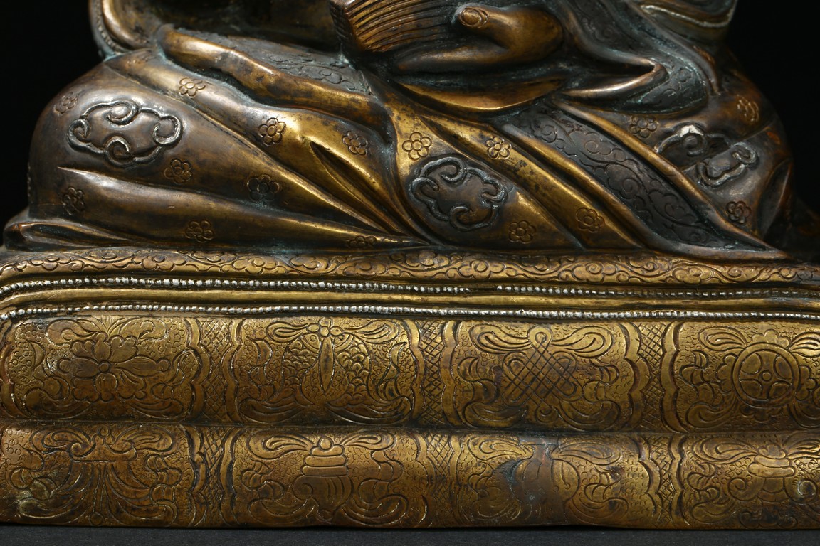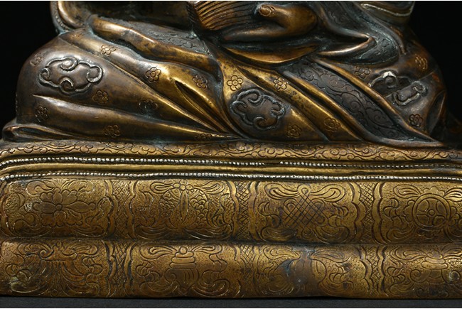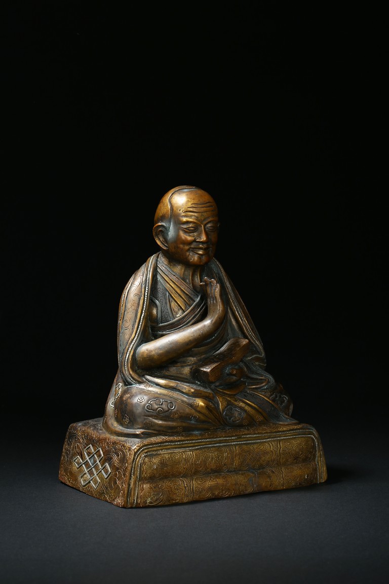 Seated on a double cushion incised in wire with eight auspicious emblems and wearing a patchwork robe underneath a sumptuous outer robe draped across his knees and billowing as it pools around his back,his right hand in the gesture of teaching,his left holding the kalsa,his portrait with a broad nose and steadfast expression. Qing Dynasty period.