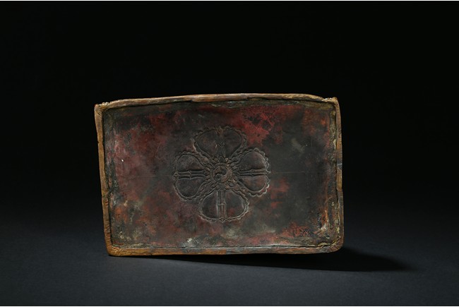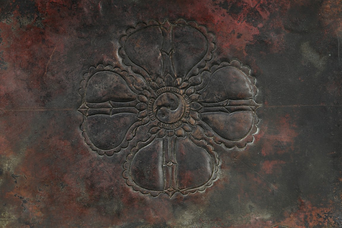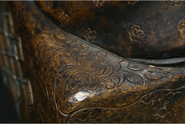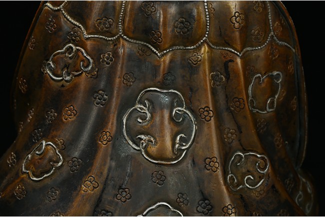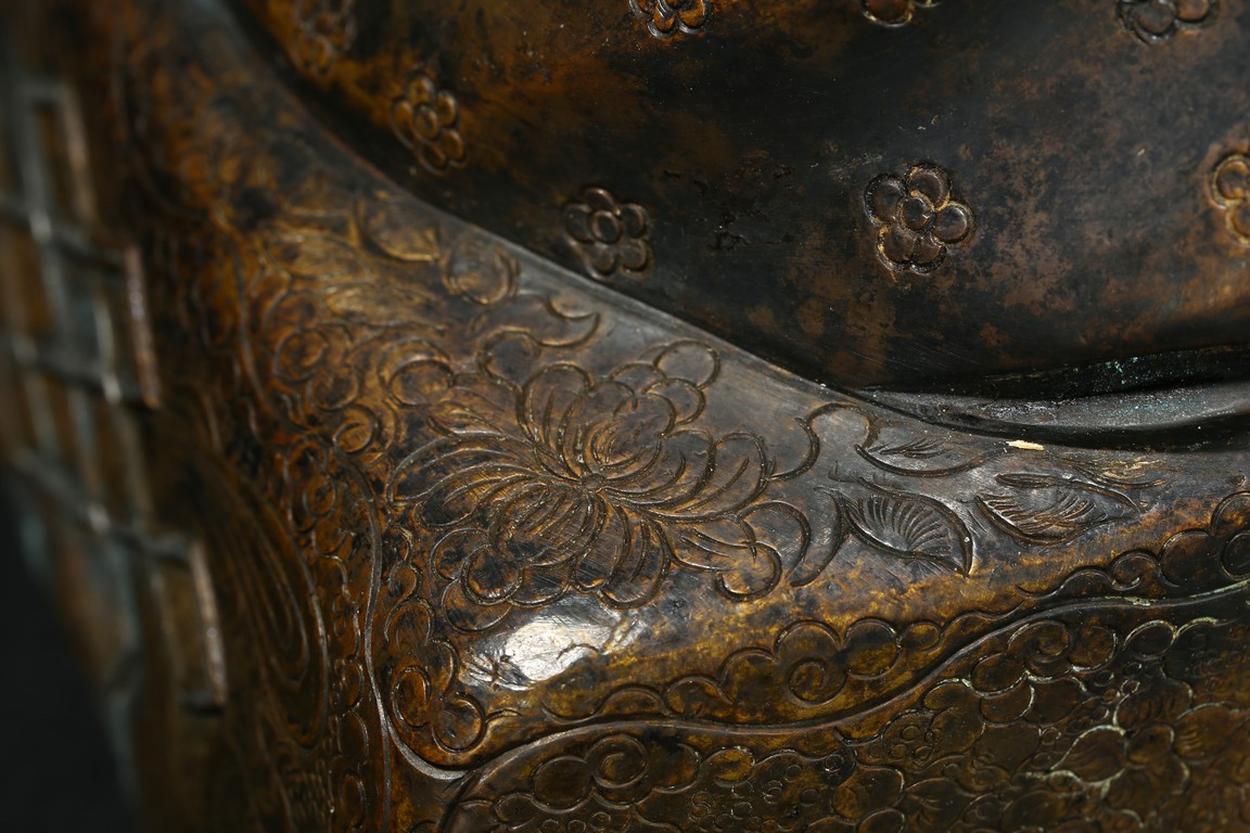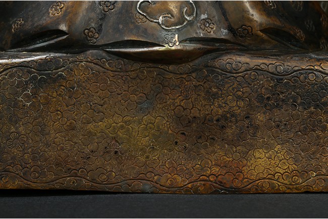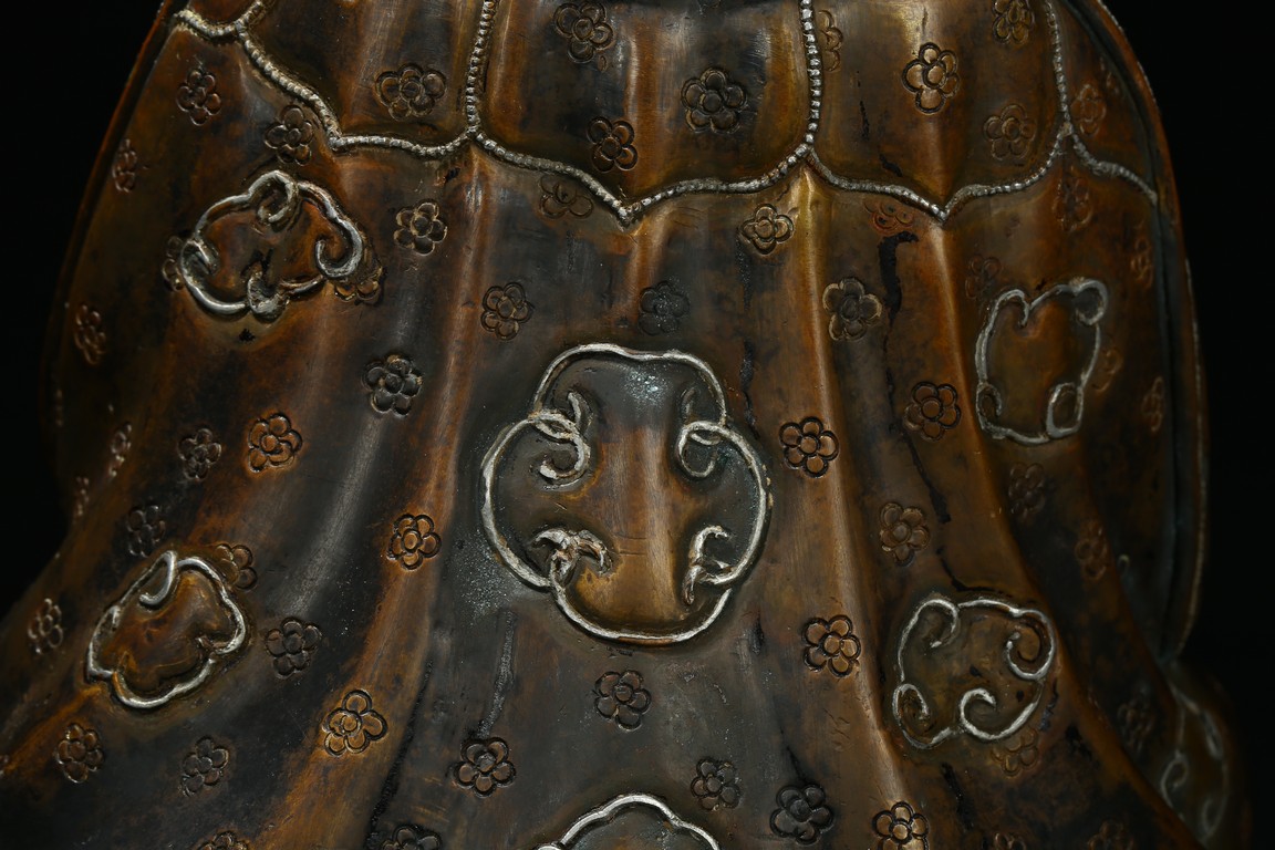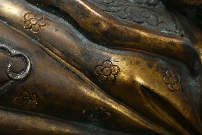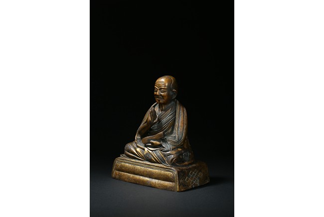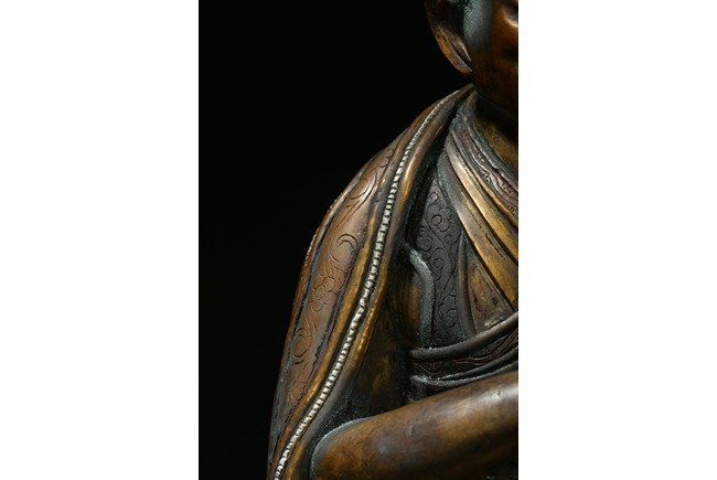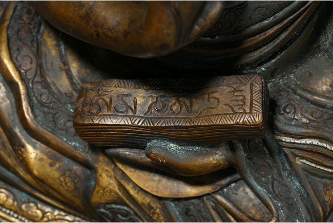 Seated on a double cushion incised in wire with eight auspicious emblems and wearing a patchwork robe underneath a sumptuous outer robe draped across his knees and billowing as it pools around his back,his right hand in the gesture of teaching,his left holding the kalsa,his portrait with a broad nose and steadfast expression. Qing Dynasty period.