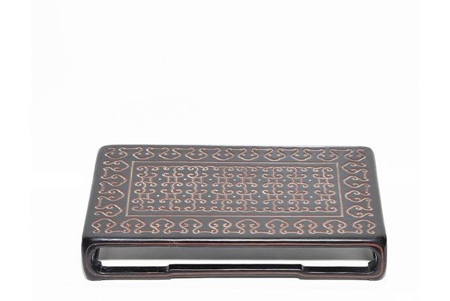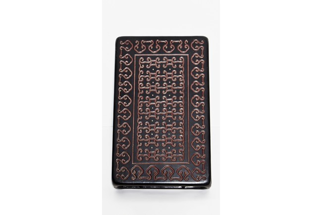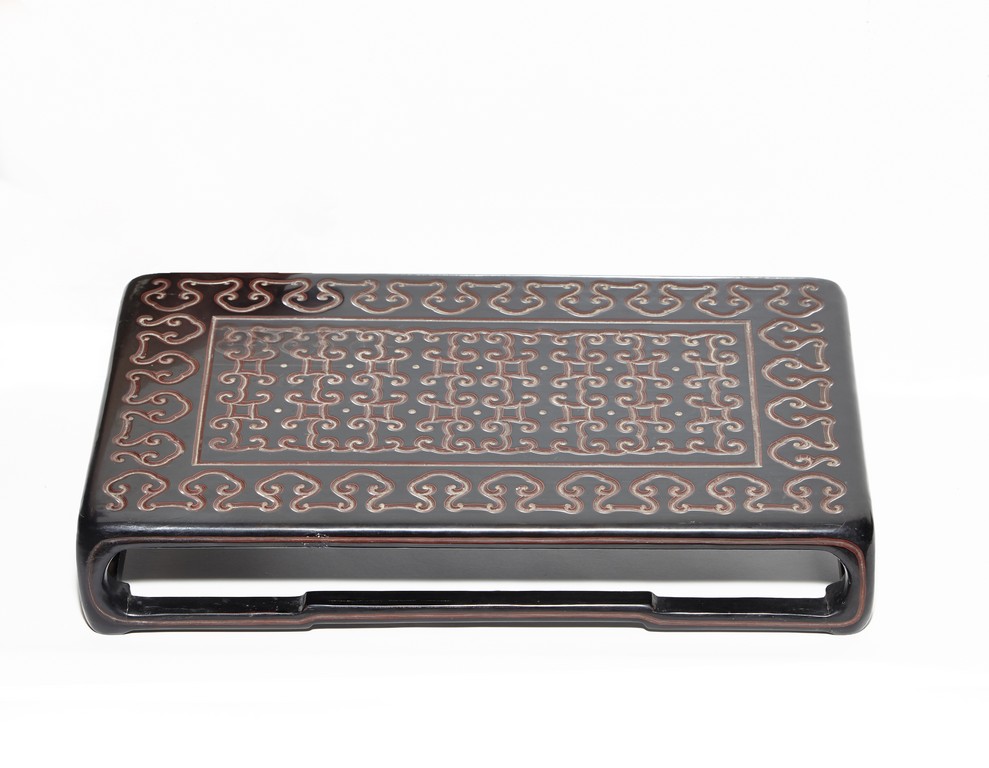 The top panel is carved through lacquer with three rows of repeated ruyi-shaped heads connected together outlined with a rectangular panel,the exterior encircled further with a band of ruyi motifs,all supported on four foot linked by humped stretchers. Qing Dynasty period.