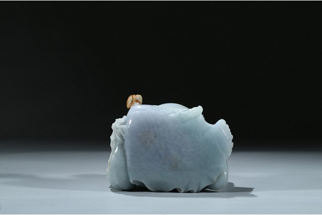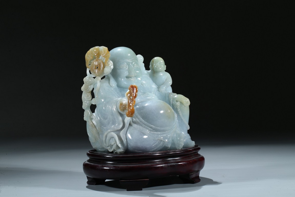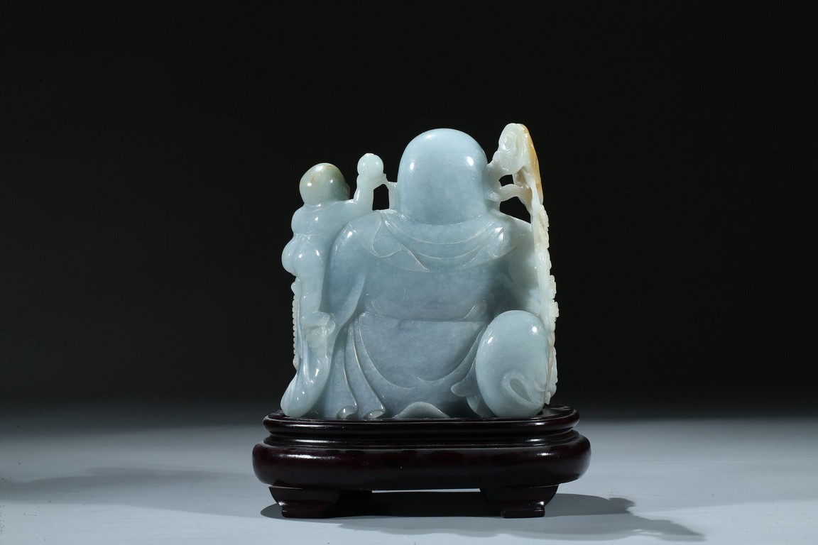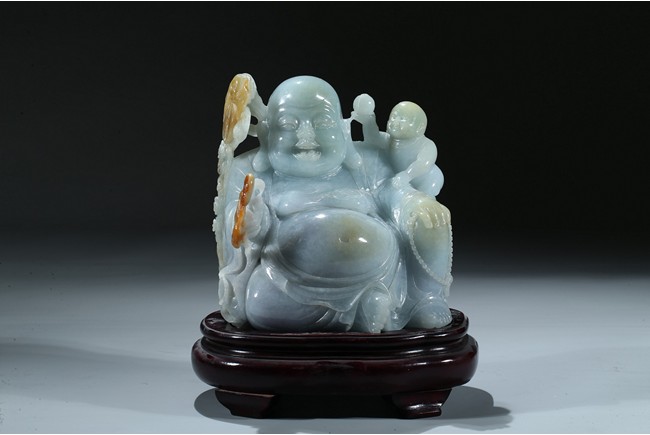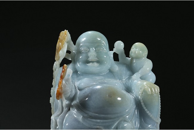 Carved a seated budai figure with large bare belly exposed, right hand resting on the knee with rosary on his wrist, left hand holding a lingzhi branch, mouth open with joyful expression, flanked by a boy and a bat on both sides, the stone is of semi translucent light purplish blue tone with russet inclusions.