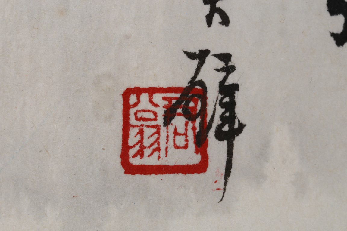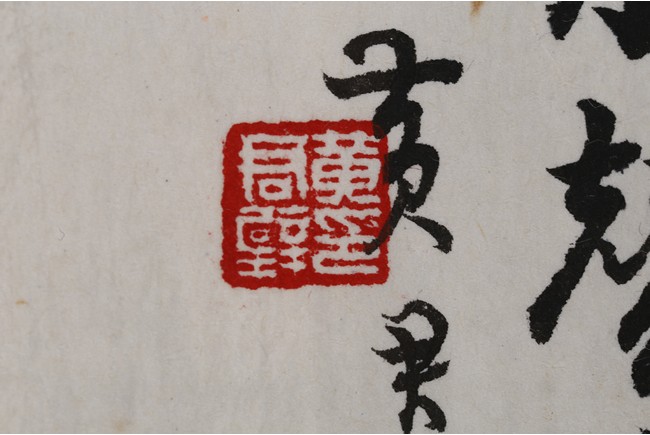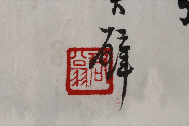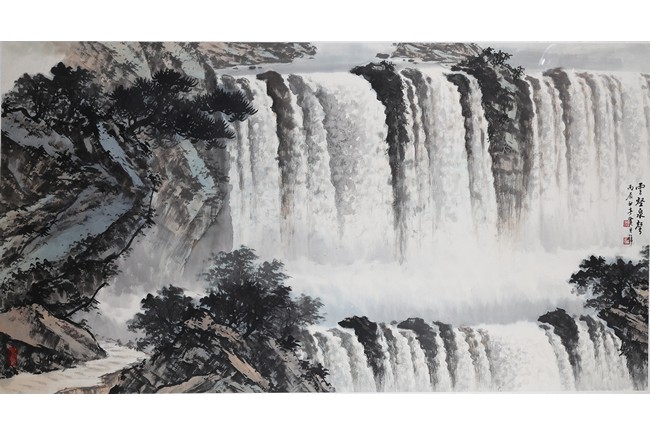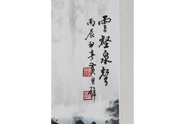 Color and ink on paper. Waterfall. Framed. Inscribed and signed Huang Junbi,with three seals of the artist.