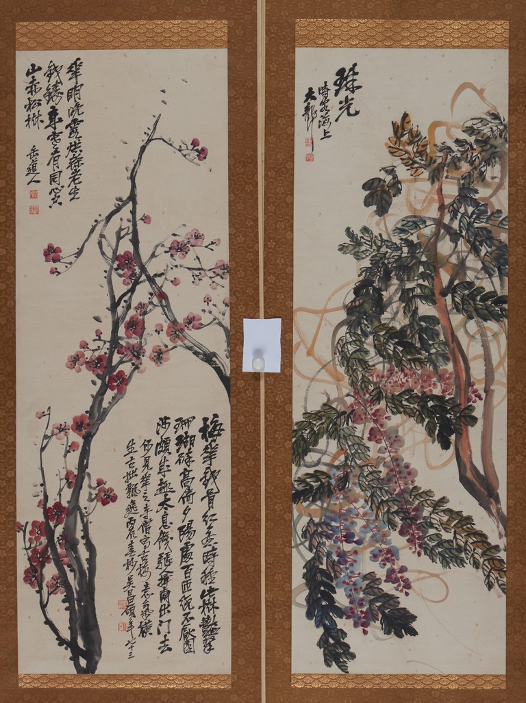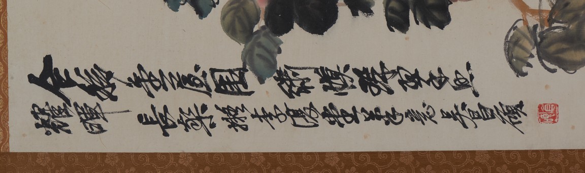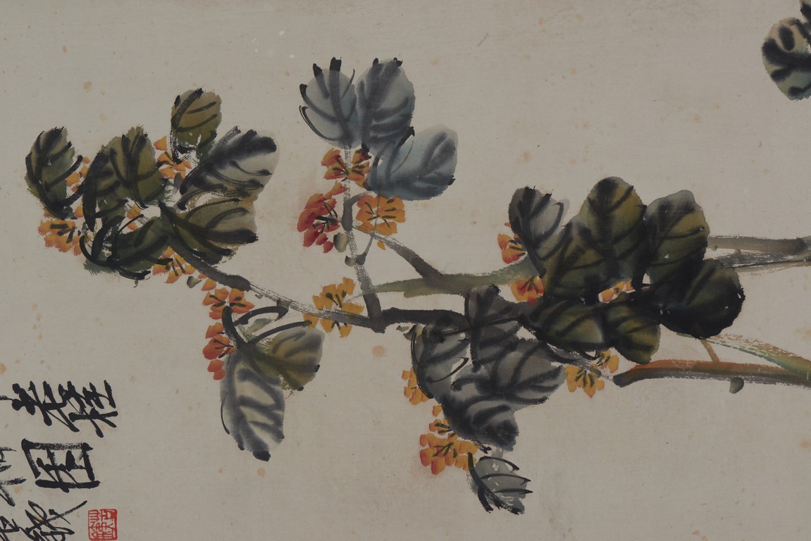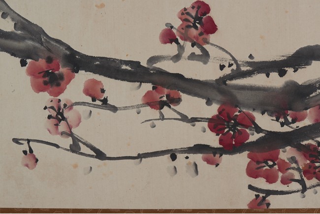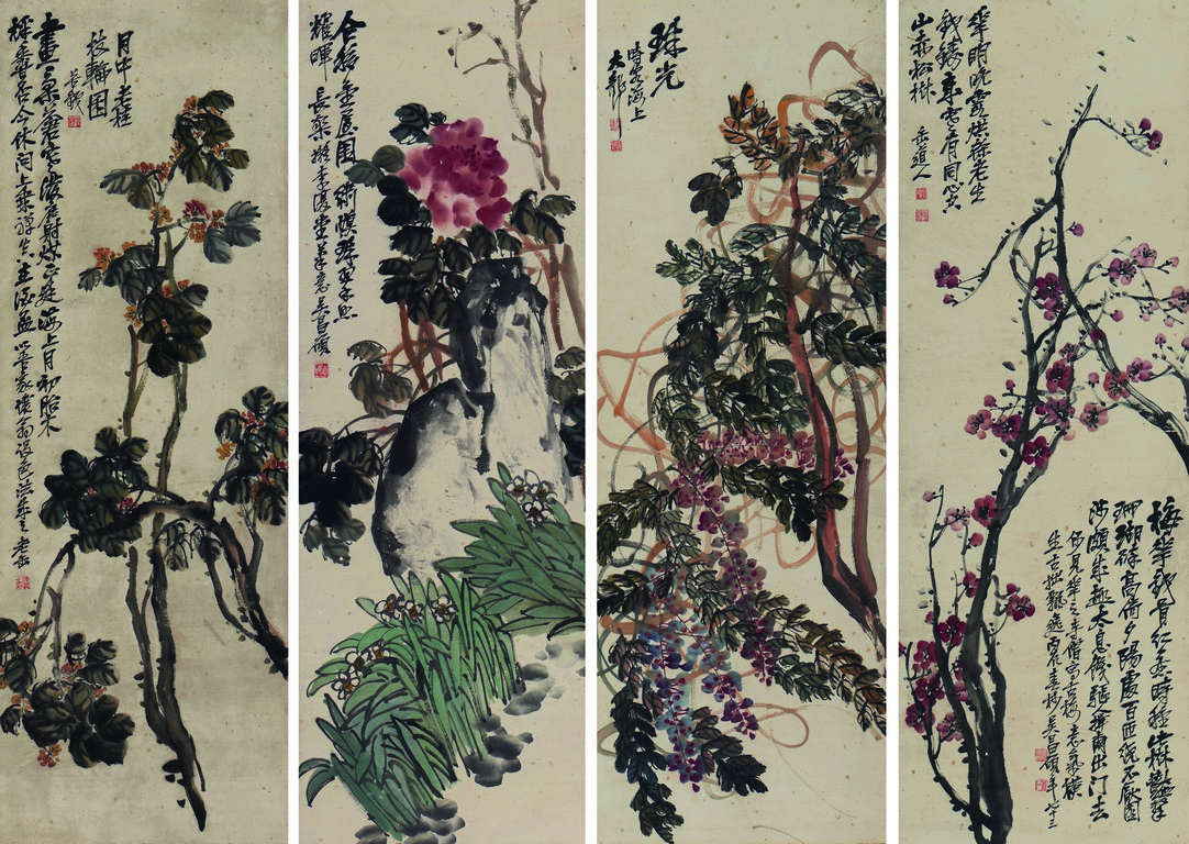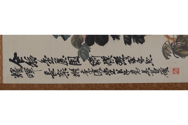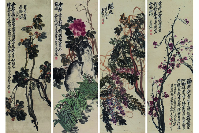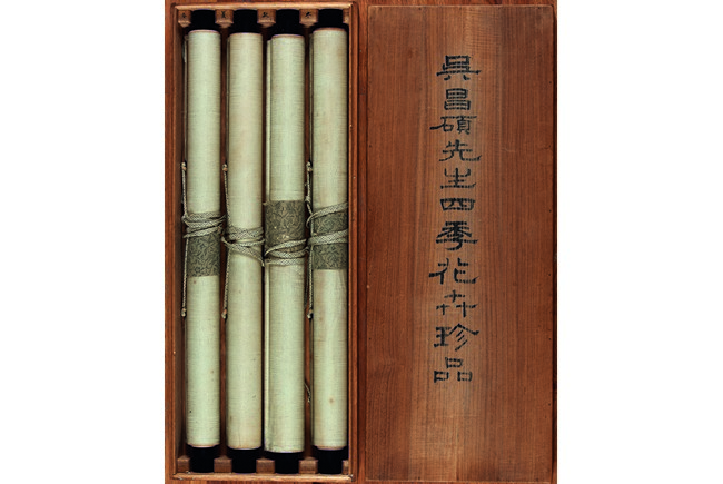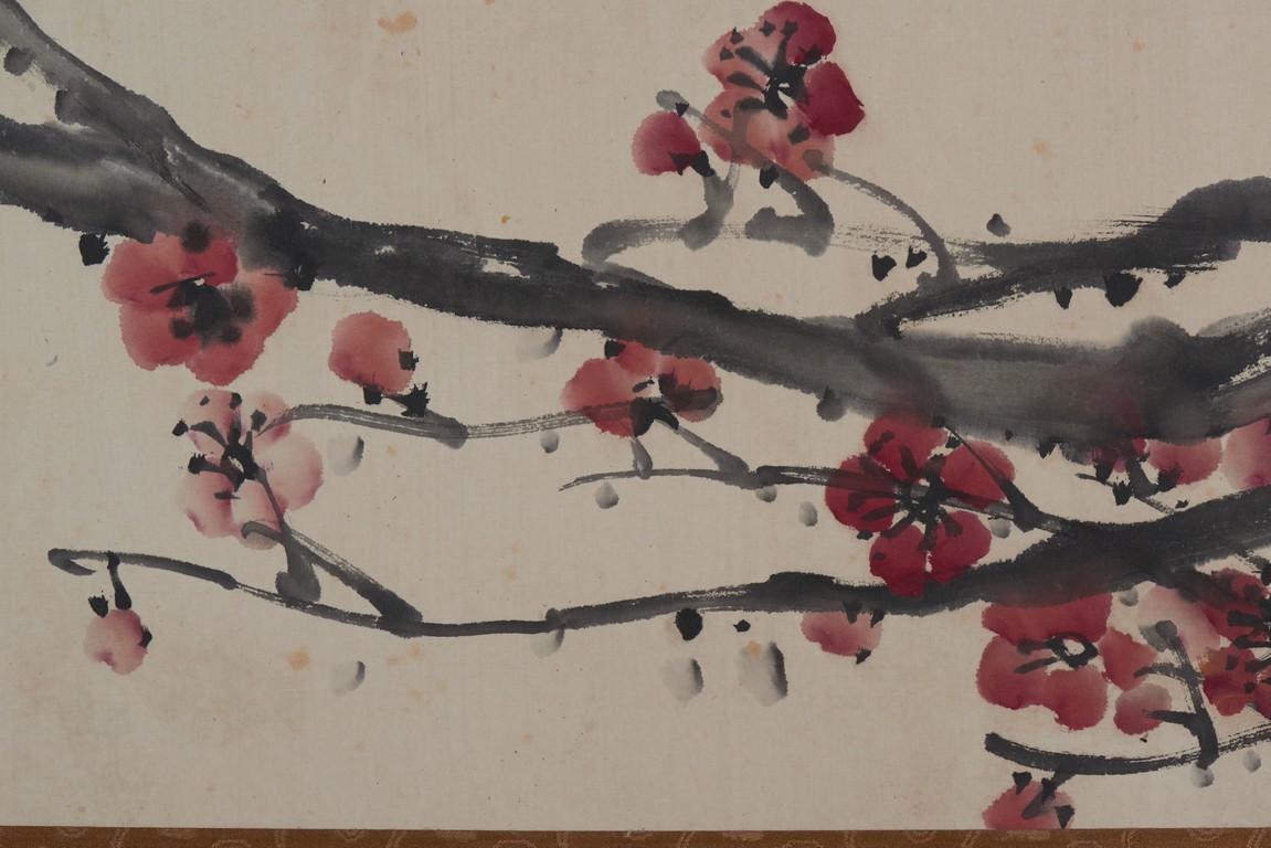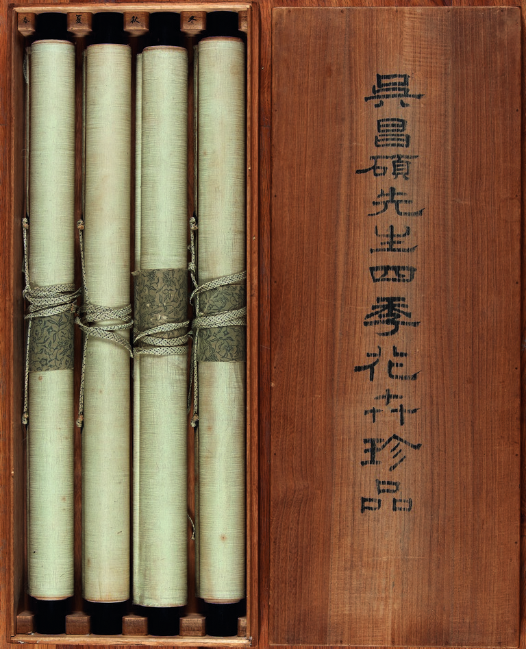 Color and ink on paper. Set of four flowers painting. Hanging scroll, signed and various seals of the artist. Accompanied with original Japanese wood box.