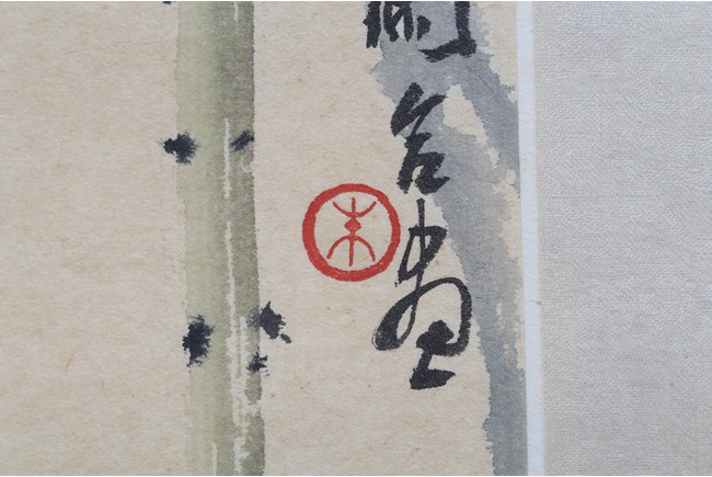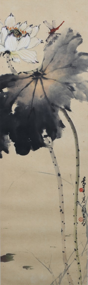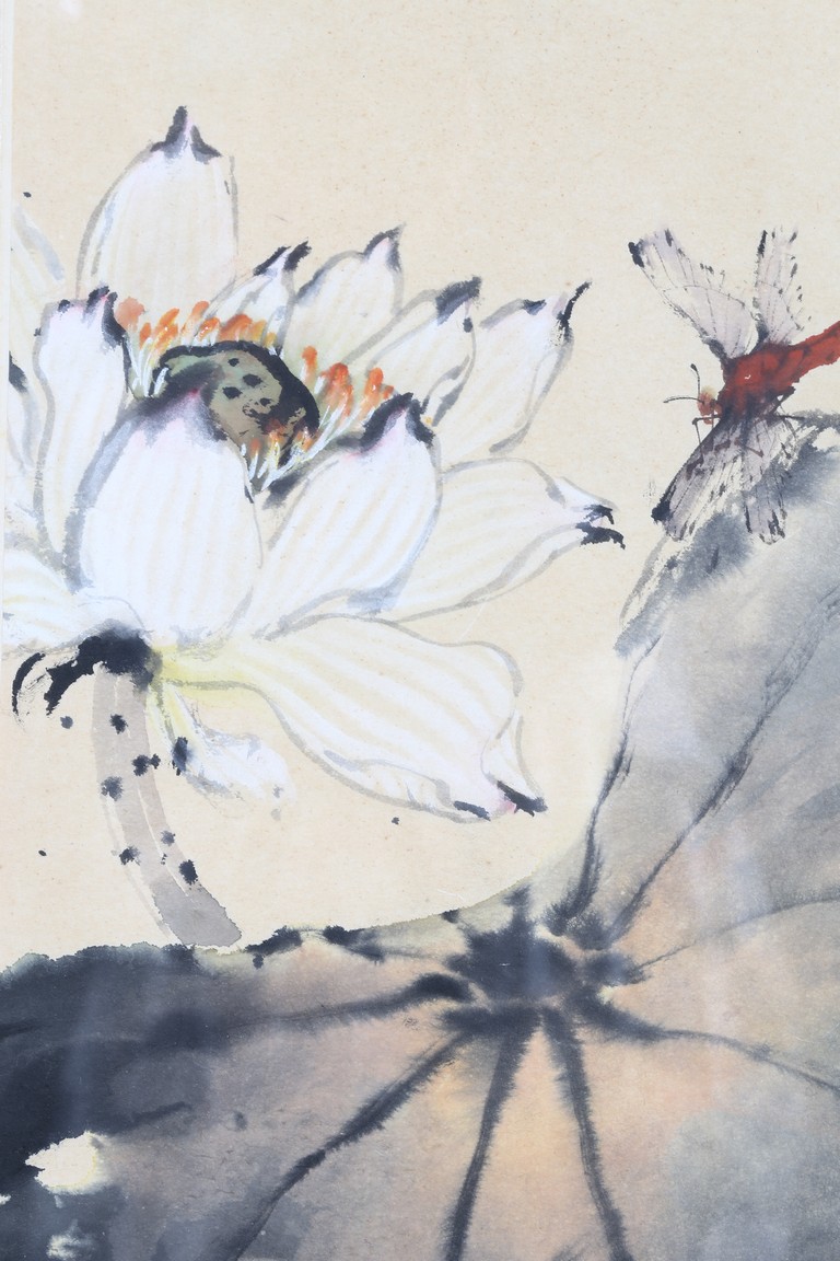 Color and ink on paper. Lotus. Framed. Inscribed and signed Hao Nian,with two seals of the artist.