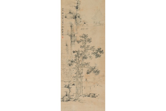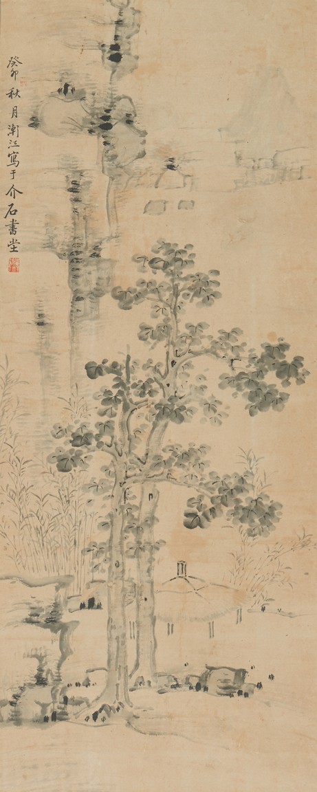 Color and ink on paper. Landscape. Hanging scroll.Inscribed and signed, with two seals of the artist.
