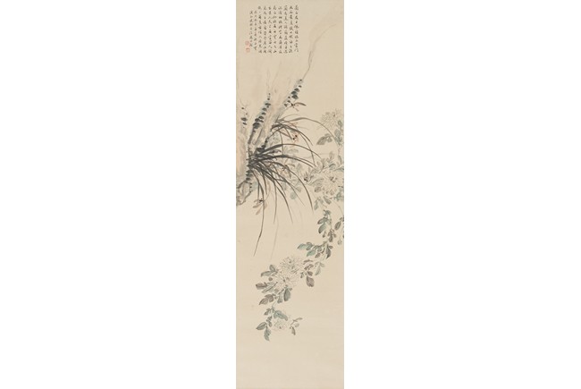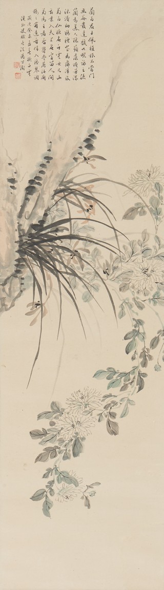Color and ink on paper. orchid. Hanging scroll. Inscribed and signed, with two seals of the artist.