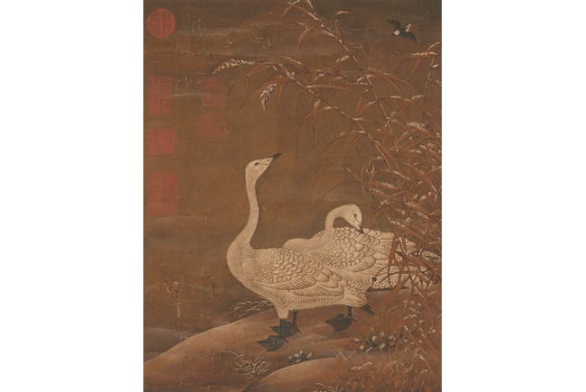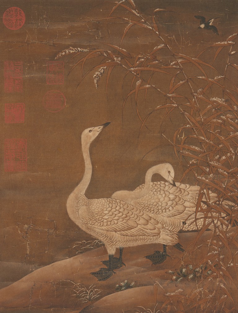 Color and ink on silk. wild goose. Hanging scroll. with six seal marks.