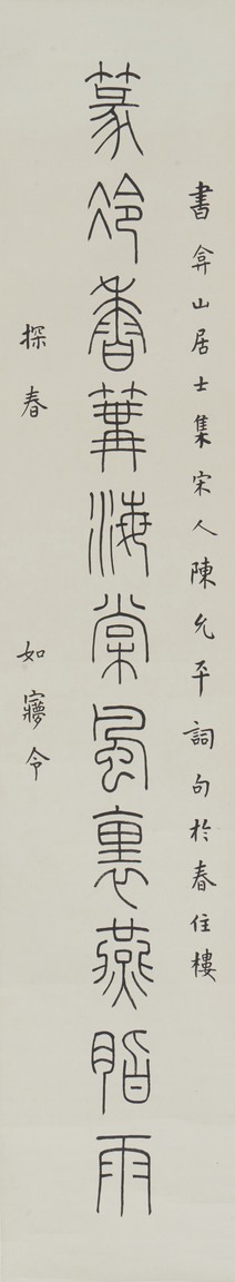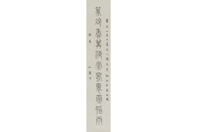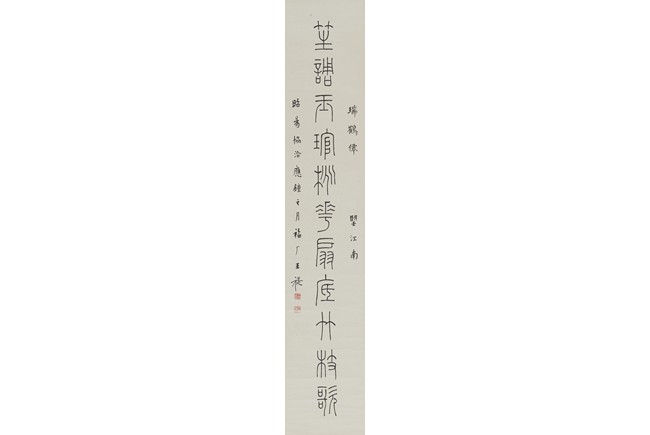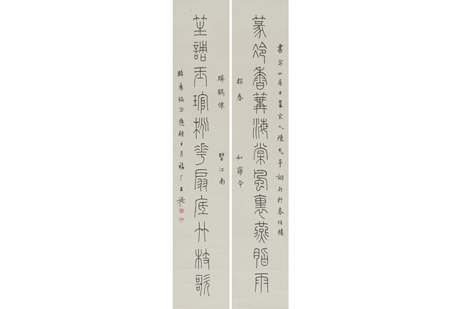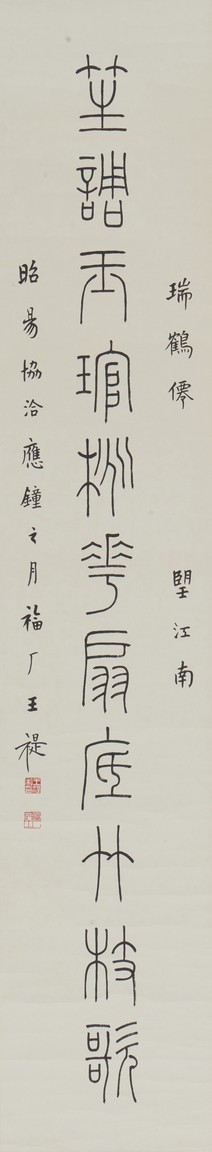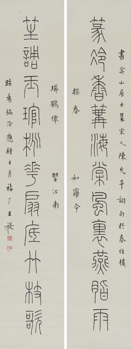 Ink on paper. Eleven characters calligraphy couplet. Hanging scroll. Inscribed and Signed Wang Ti , with two seals of the artist.