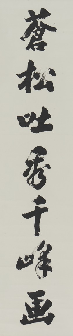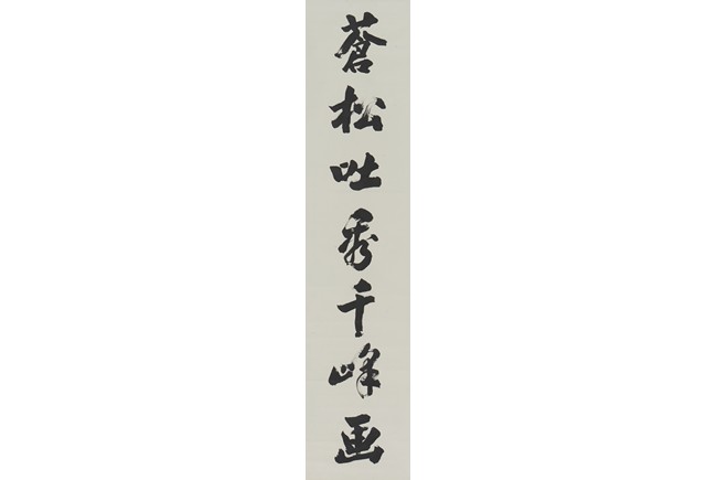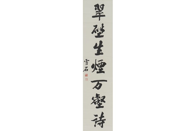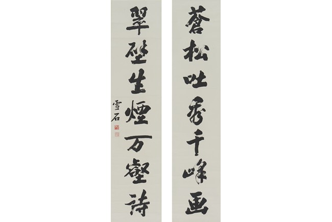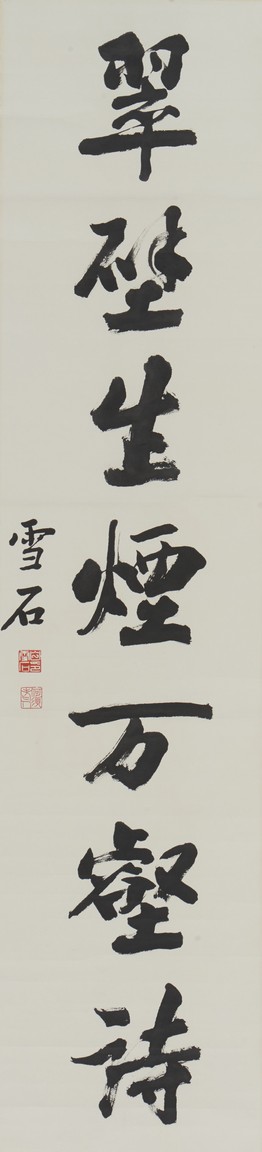 Ink on paper. Seven characters calligraphy couplet. Hanging scroll. Signed Xue Shi, with two seals of the artist.