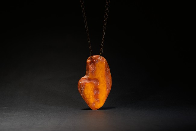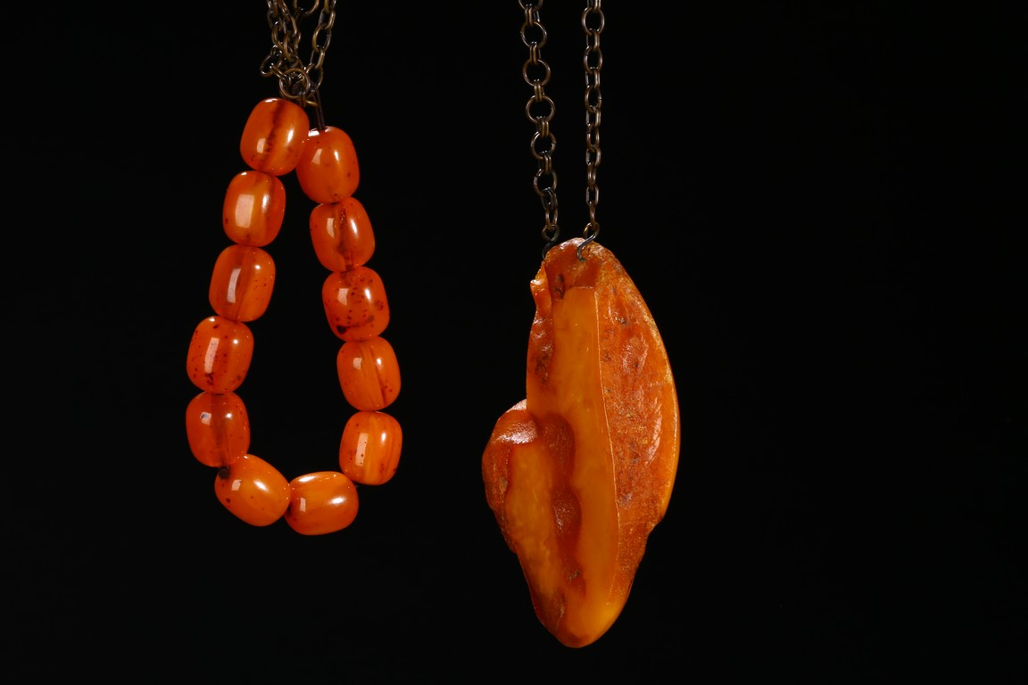 The large amber pendant is of translucent rich caramel tone and naturalistic shape. The bracelet is comprising of twelve amber beads,each of oblong shape with orange caramel tone.