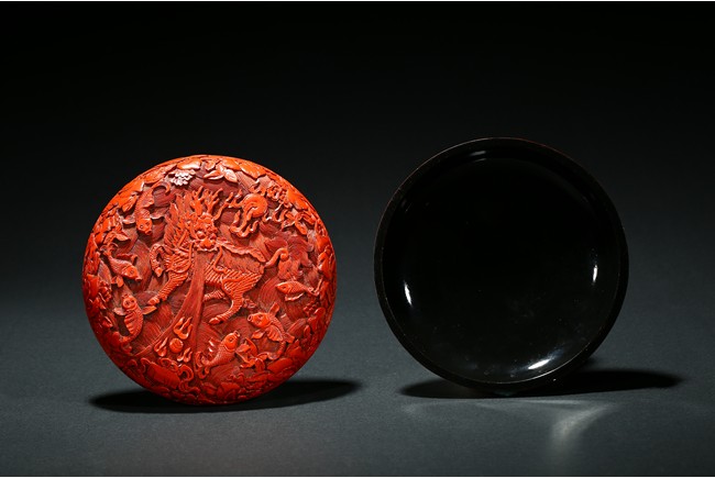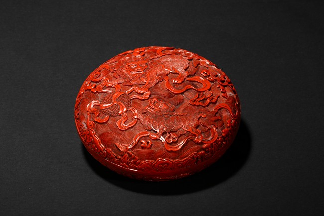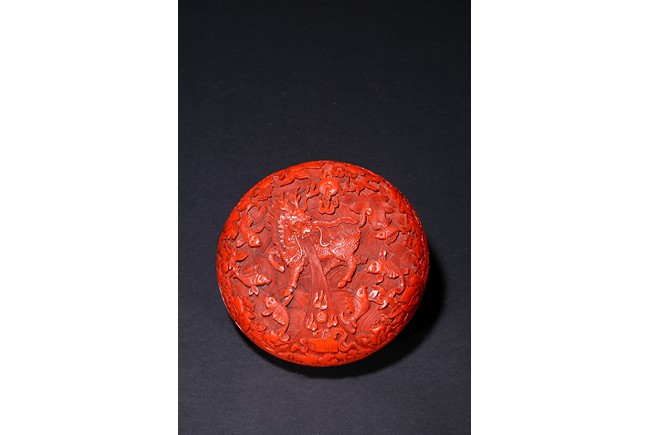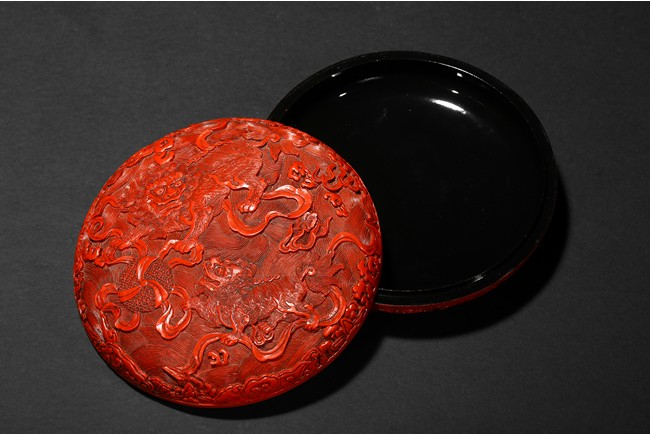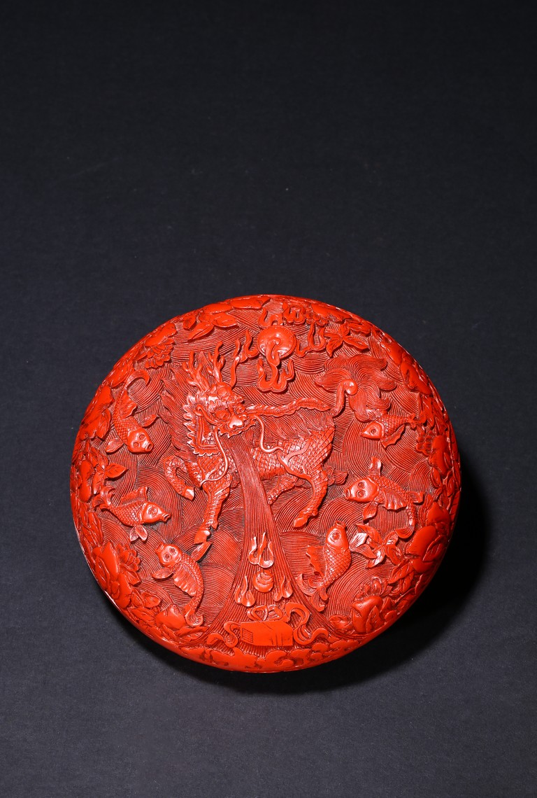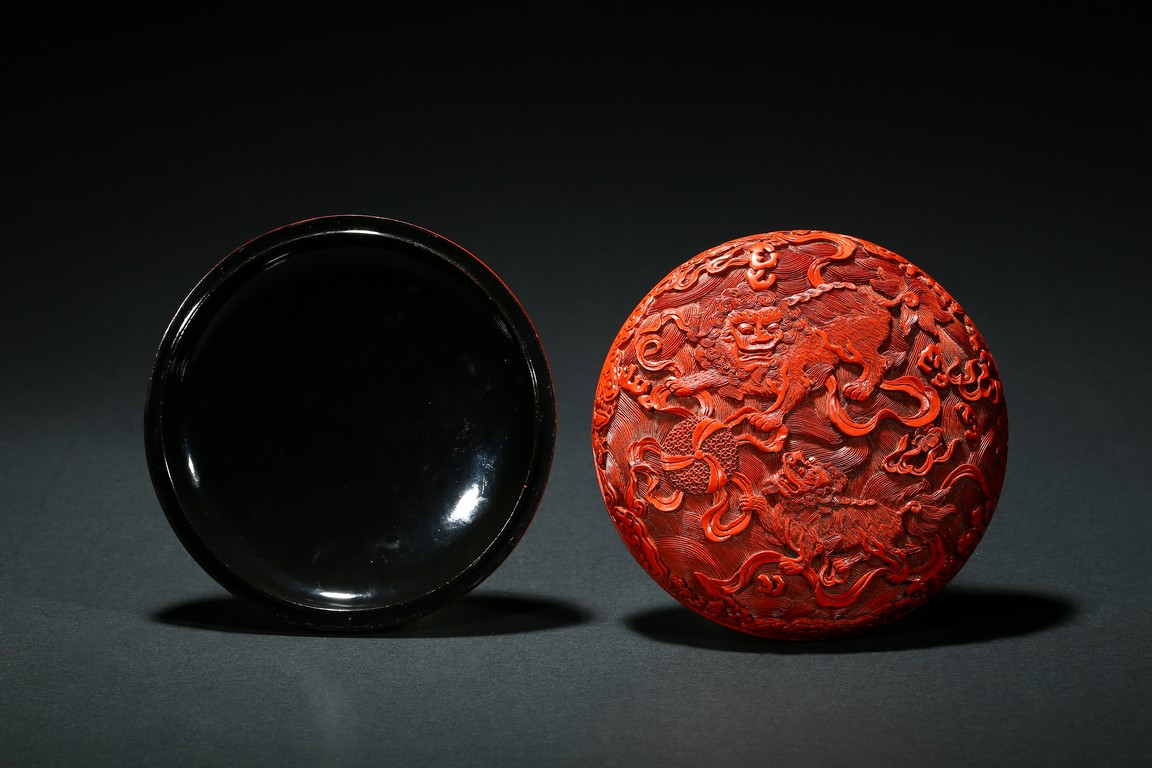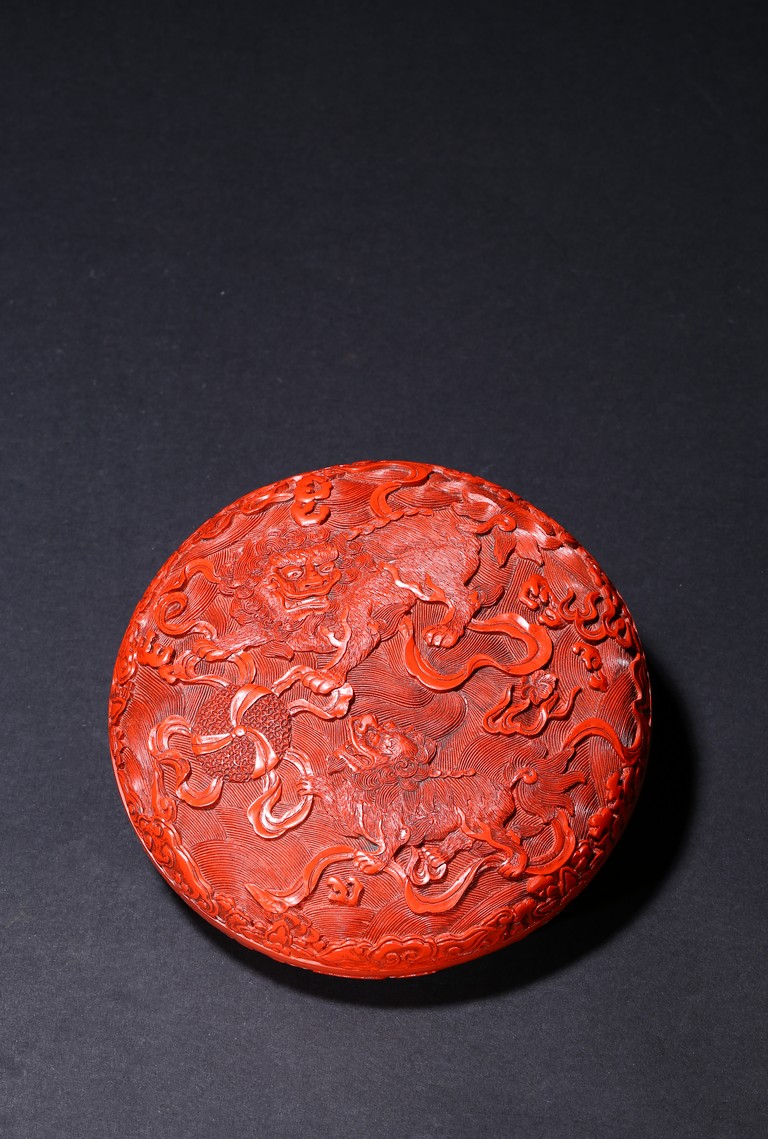 Of compressed circular form,the cover depicted with two buddhist lions playing with a brocade ball,the base carved with a standing qilin with water coming out of its mouth,all reserved on ground finely incised to represent ocean waves.