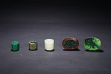 A GROUP OF FIVE JADEITE RINGS AND BUCKLES