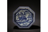 AN OCTAGONAL BLUE AND WHITE LANDSCAPE DISH