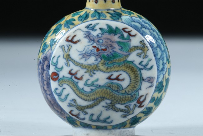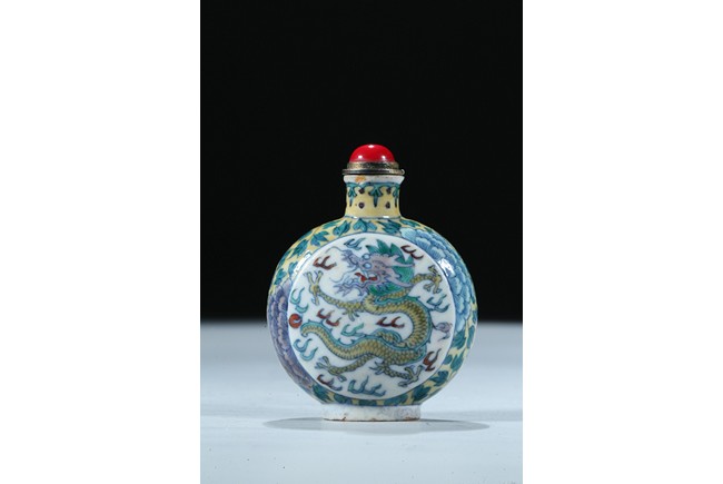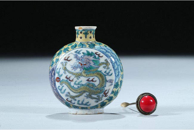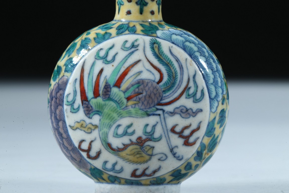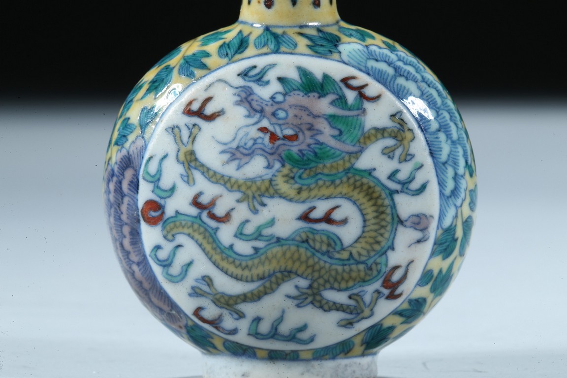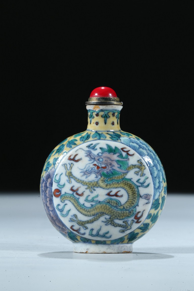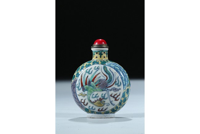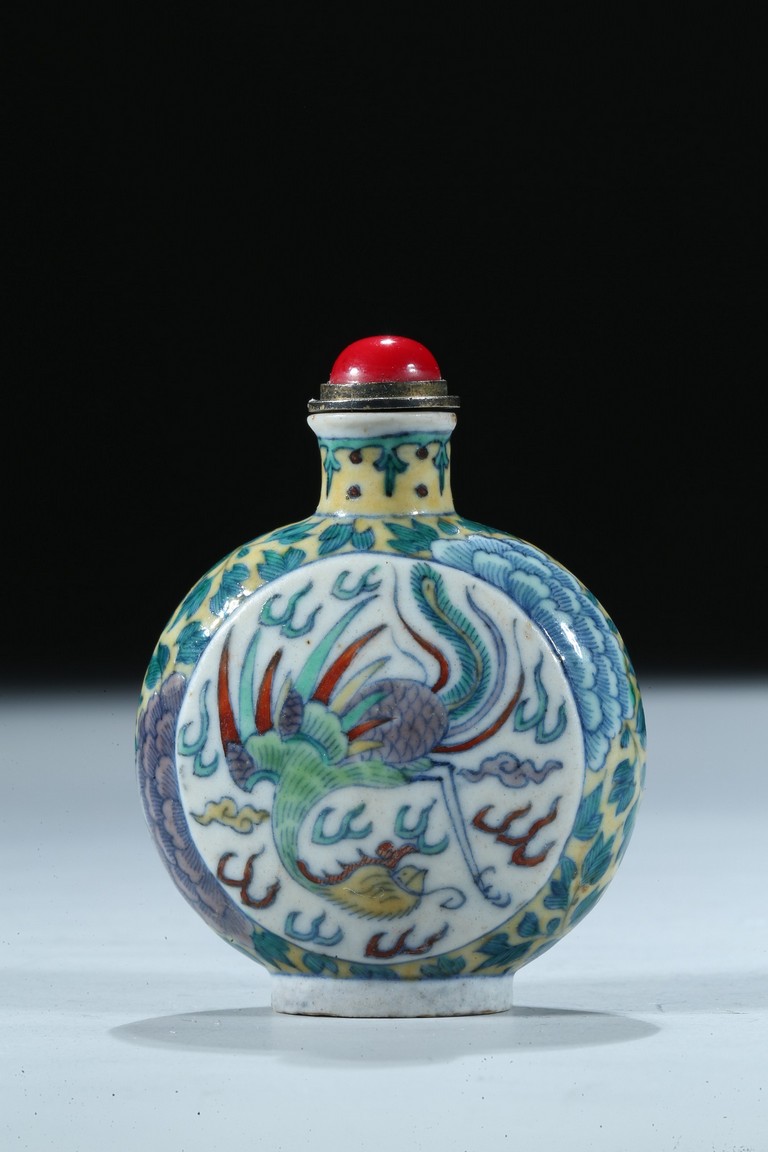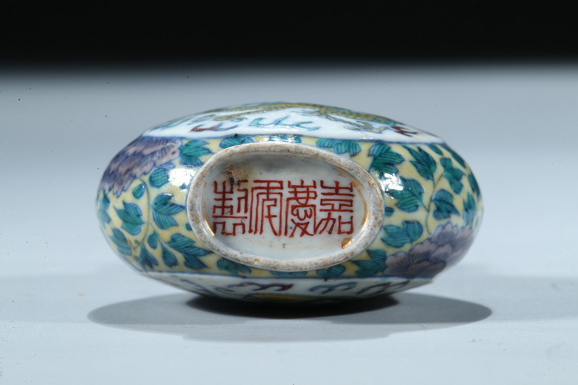 Of rounded shape, the exterior finely painted in bright enamels with a 'three-clawed' sinuous dragon in multicolor on one side, the reverse painted with a phoenix , the sides with flower and leafy spray decoration. The base with four character 'Jia qing' mark. Qing Dynasty period.