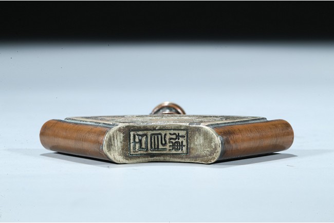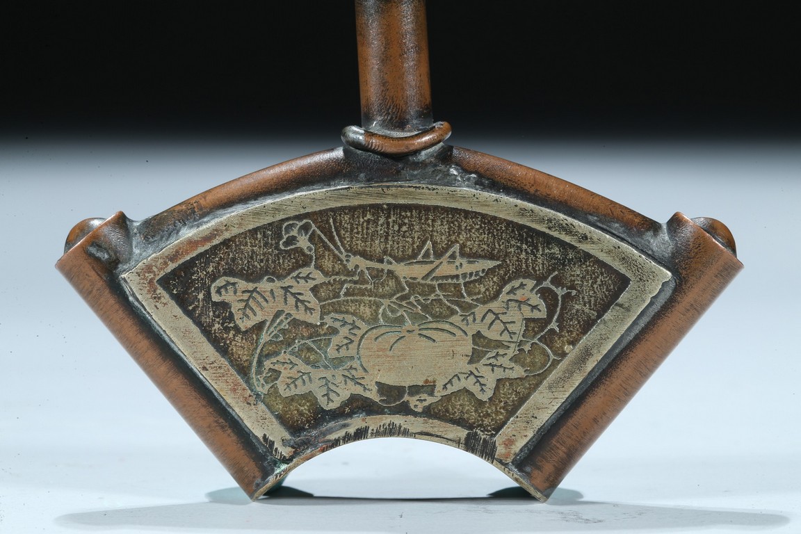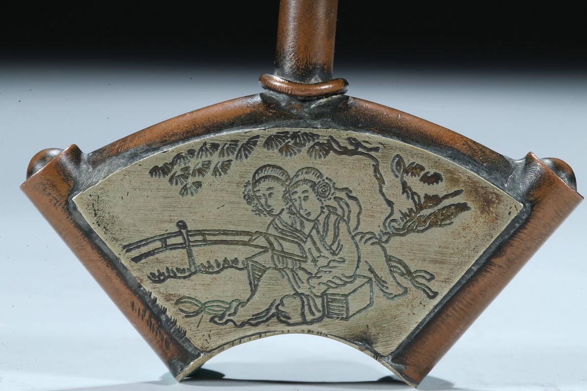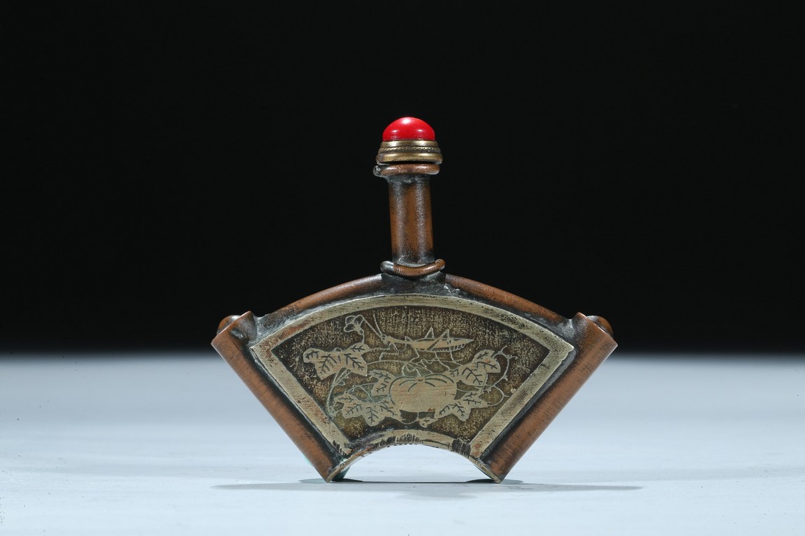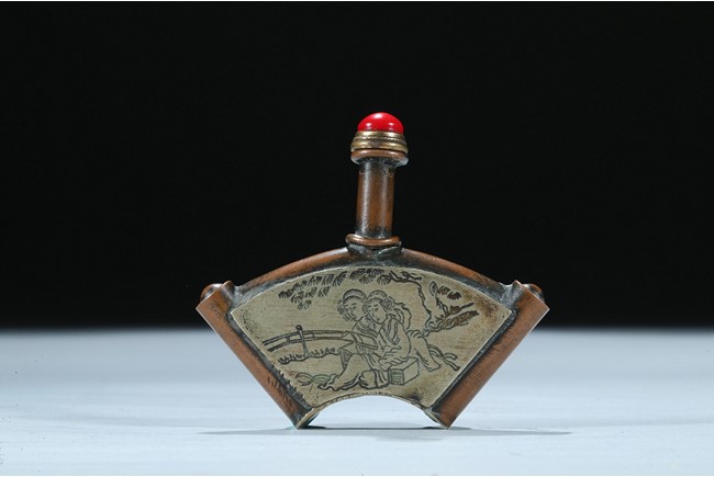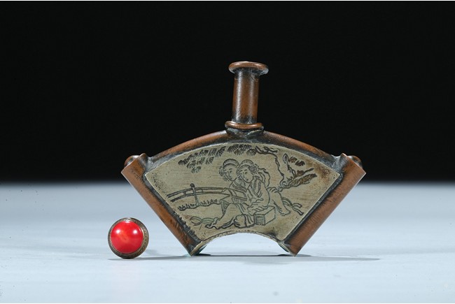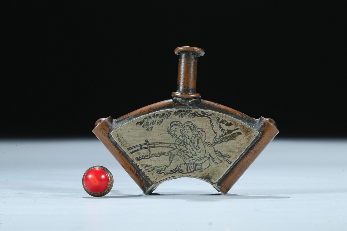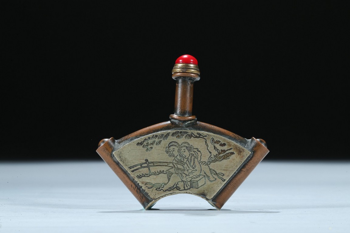 Of fan shaped form, the body etched with two beauties reading underneath a pine in garden setting, the reverse with a mantis and melon, with a tall cylindrical neck, base with three character Gu Yu Xue. Qing Dynasty period.