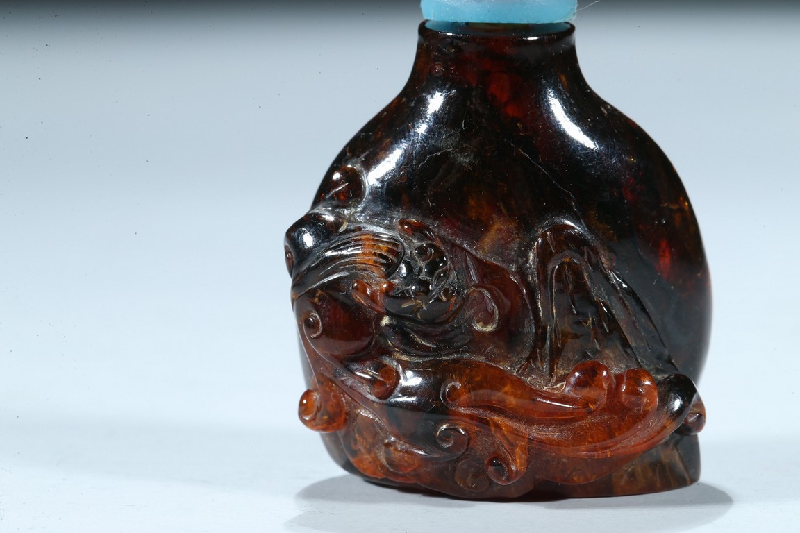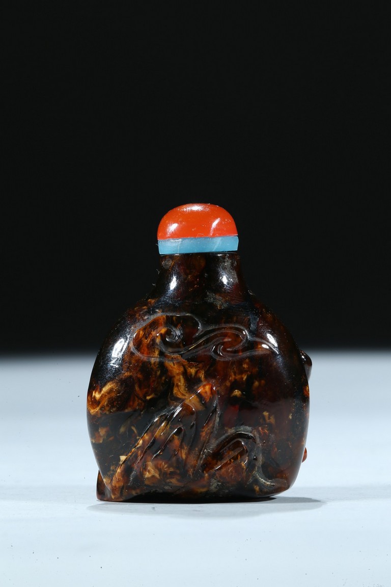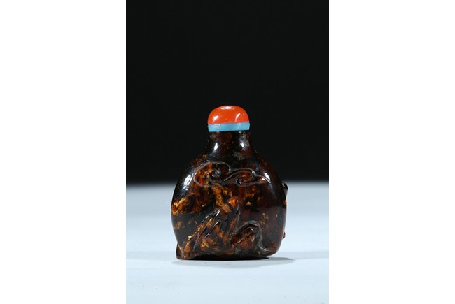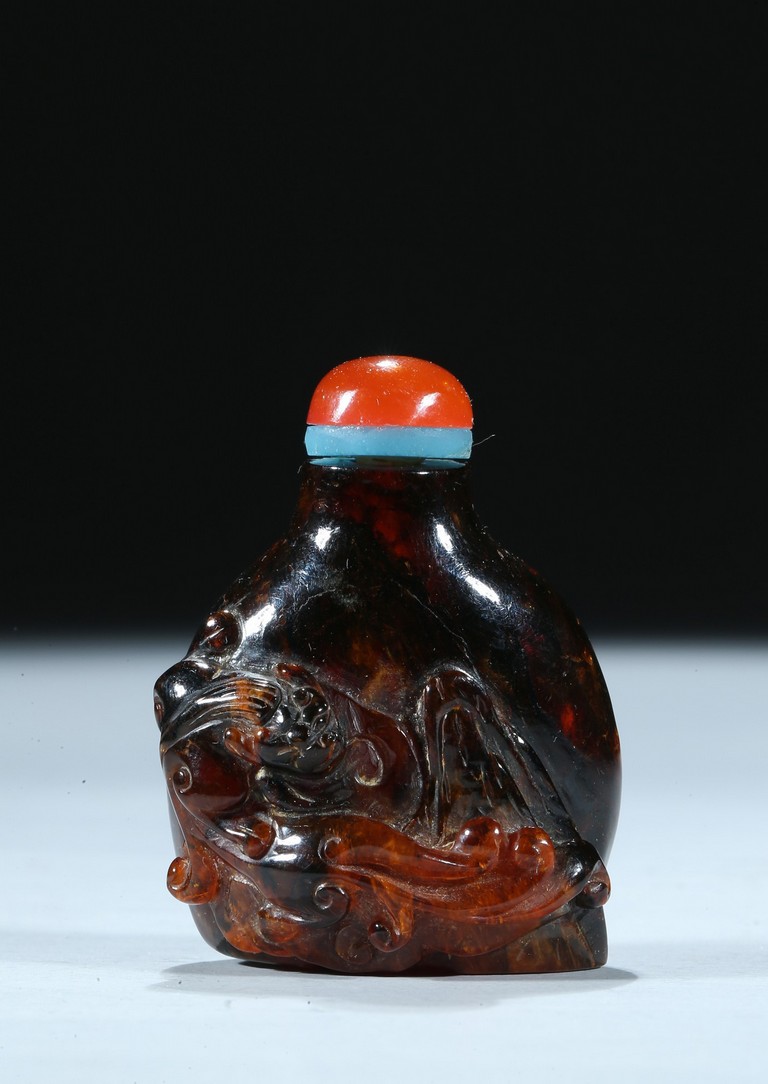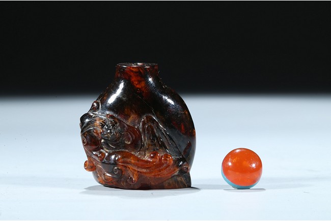 The amber carved with a coiled chilong in relief, the stone is of dark black tone with brown and caramel inclusions. Qing Dynasty period.