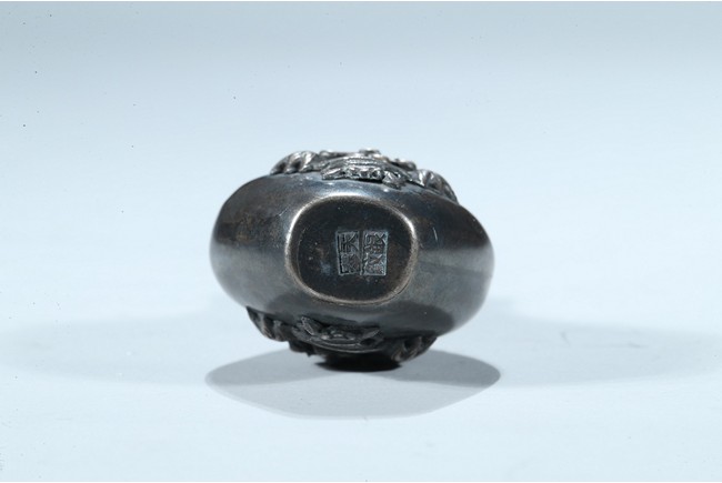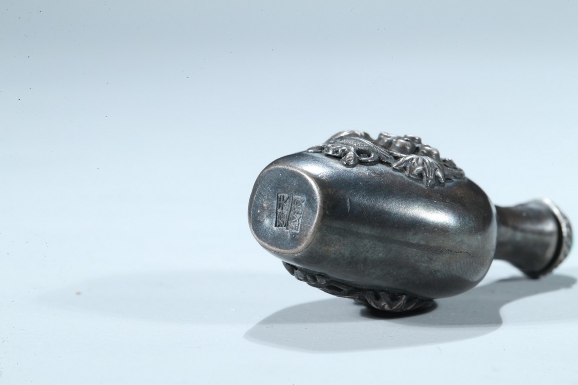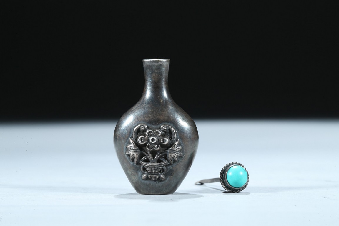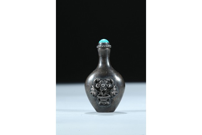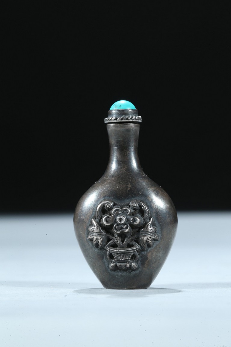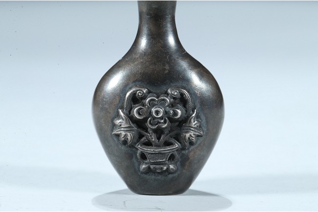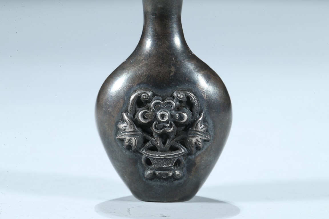 The pear-shaped body rising to a tall neck, decorated with flower basket on both sides. The base with four character mark. Qing Dynasty period.