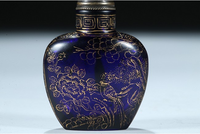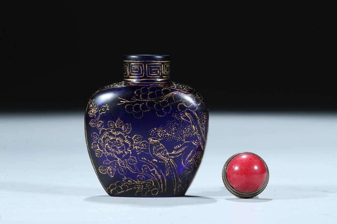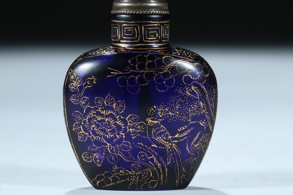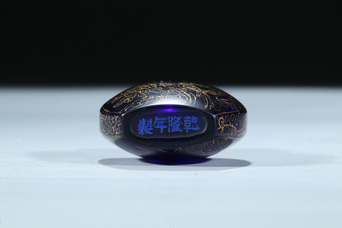 Of compressed globular form rising to a broad shoulder, the exterior gilt painted with birds and flowers on the translucent blue glass,the sides with scrolled decoration. The base with four character 'Qianlong' mark. Qing Dynasty period.