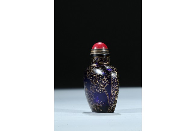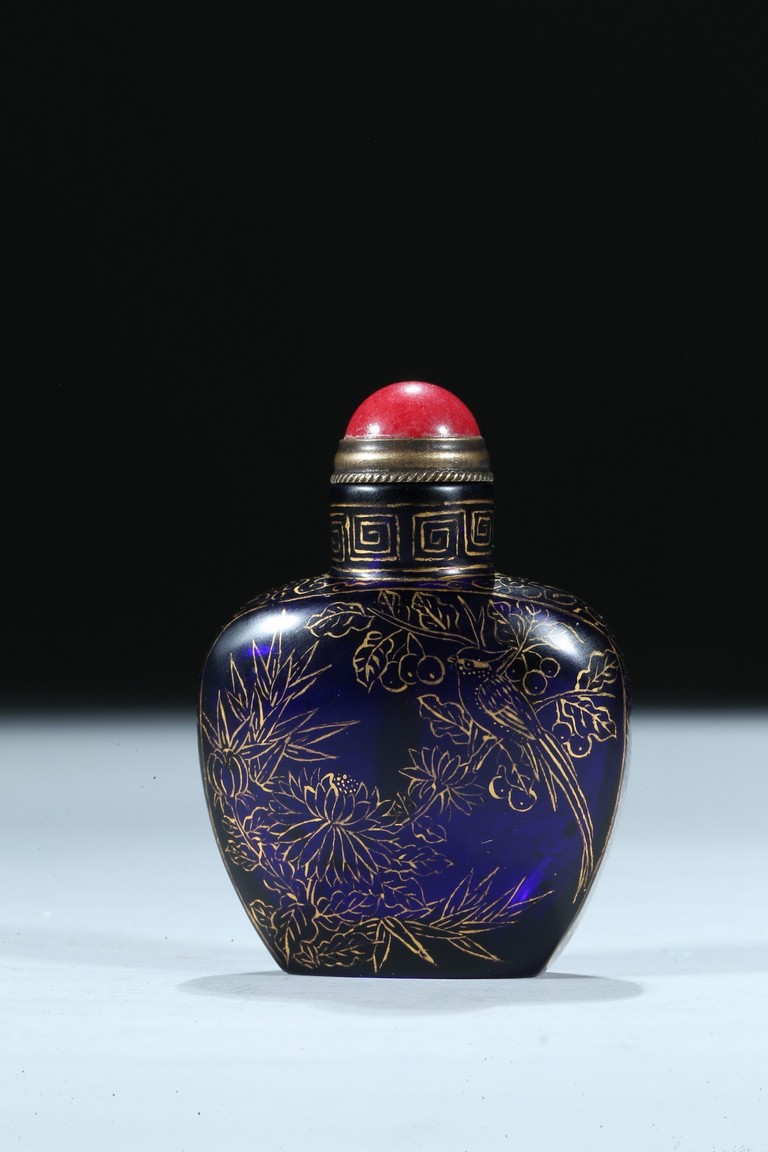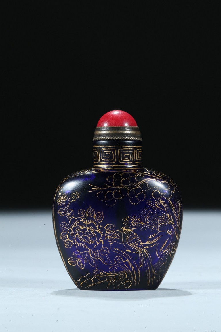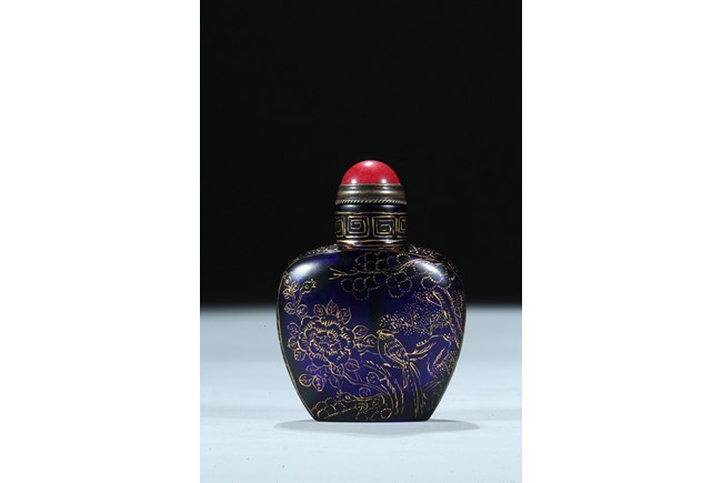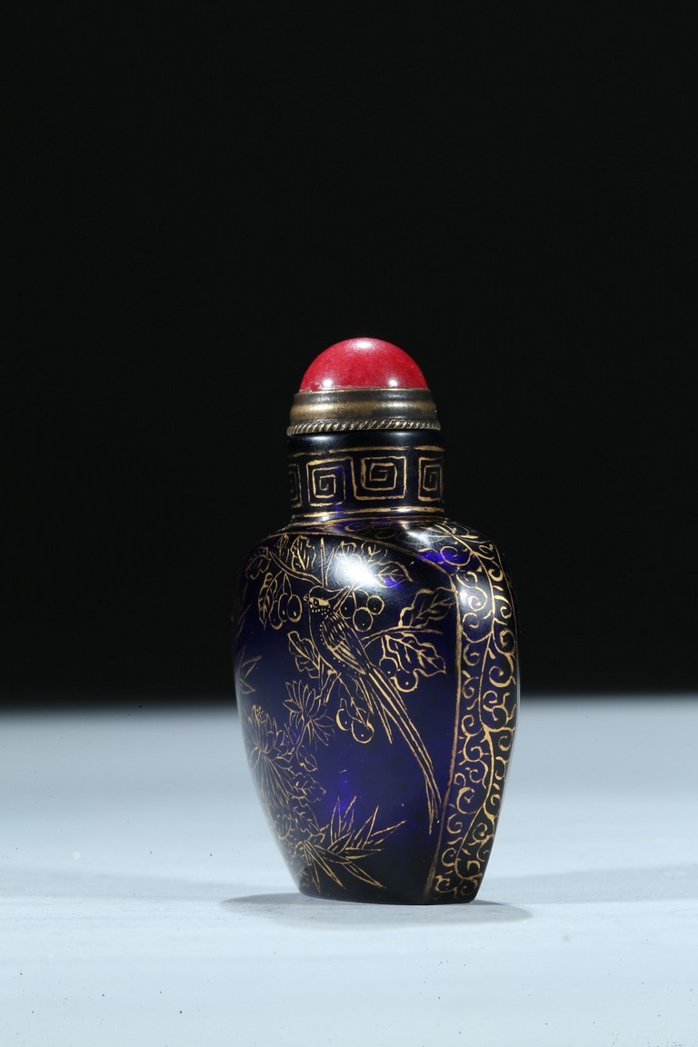 Of compressed globular form rising to a broad shoulder, the exterior gilt painted with birds and flowers on the translucent blue glass,the sides with scrolled decoration. The base with four character 'Qianlong' mark. Qing Dynasty period.