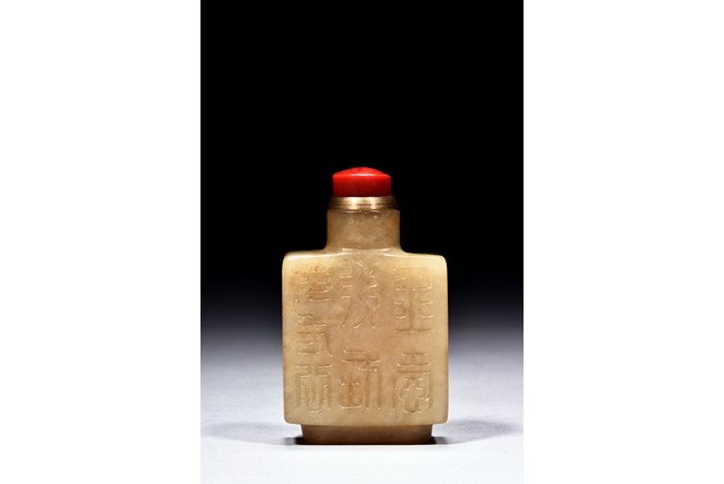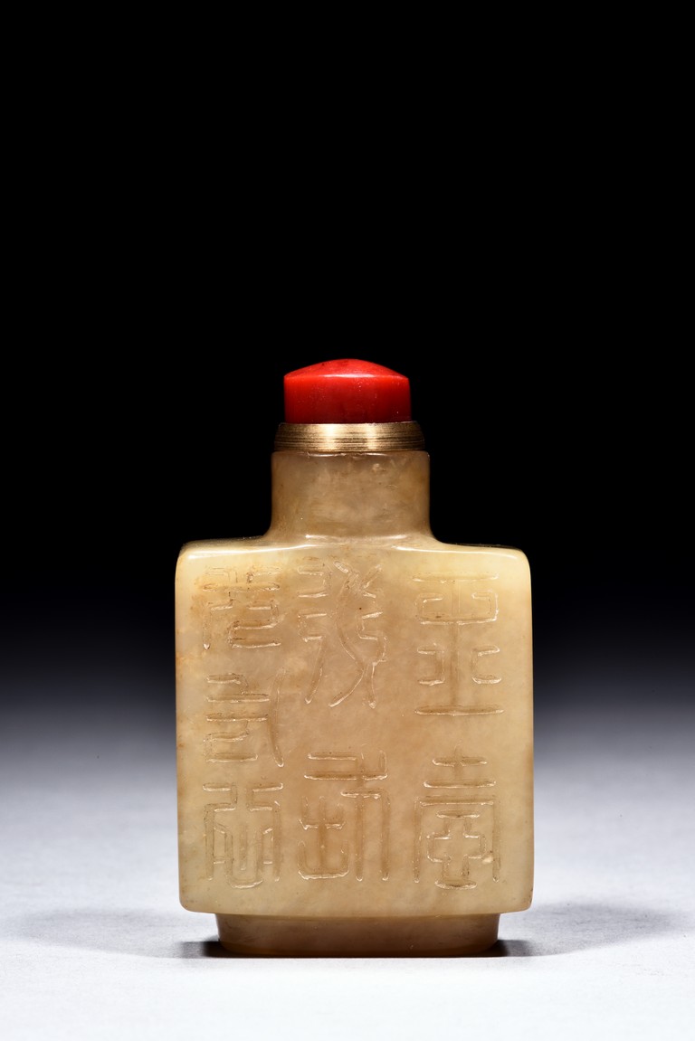 A JADE CARVED 'SEAL SCRIPT' SNUFF BOTTLE    清 玉雕篆文紋鼻煙壺