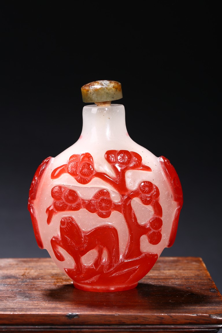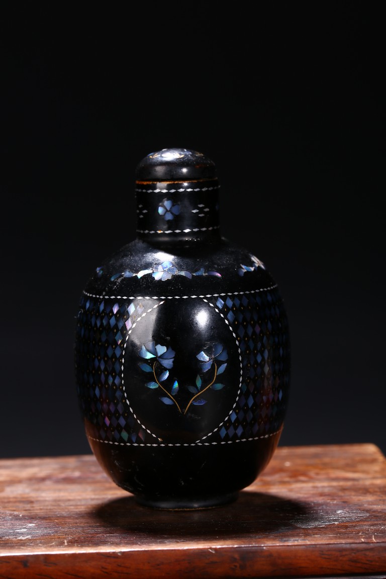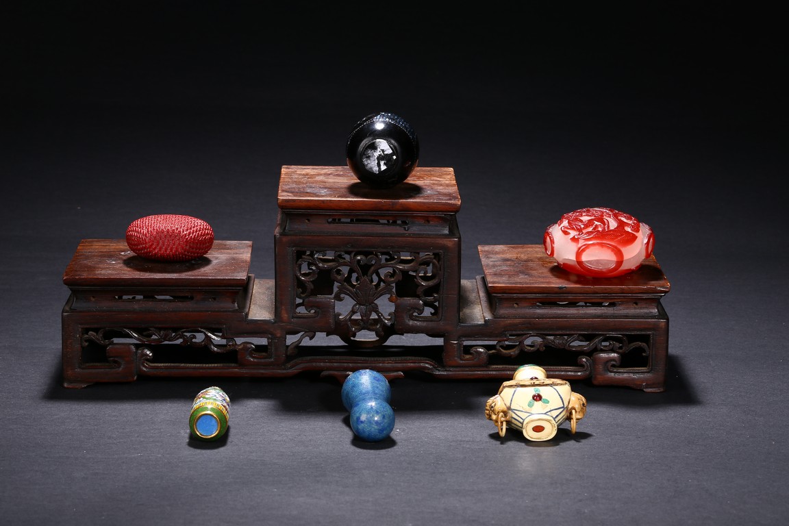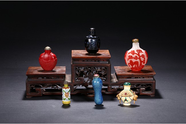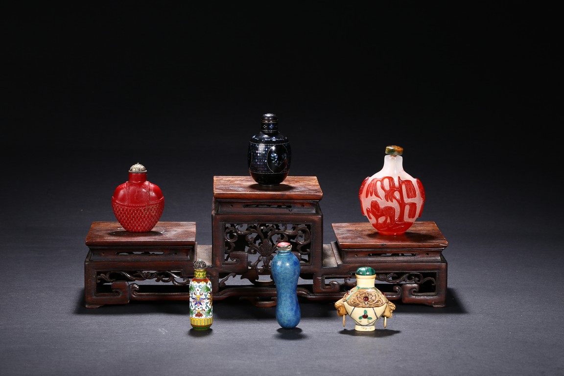 Including a red glass snuff bottle with basket design; a transparent amber glass bottle with lotus decoration; a melon shaped blue glazed snuff bottle; an bone snuff bottle with gems; an red glass overlay 'horse under willow' snuff bottle; a cloisonne enamel 'scroll lotus' snuff bottle; and a black lacquered mother-of-pearl snuff bottle.Qing Dynasty period