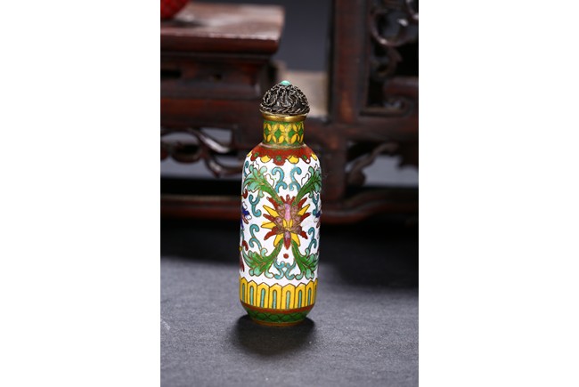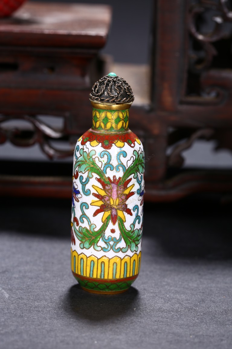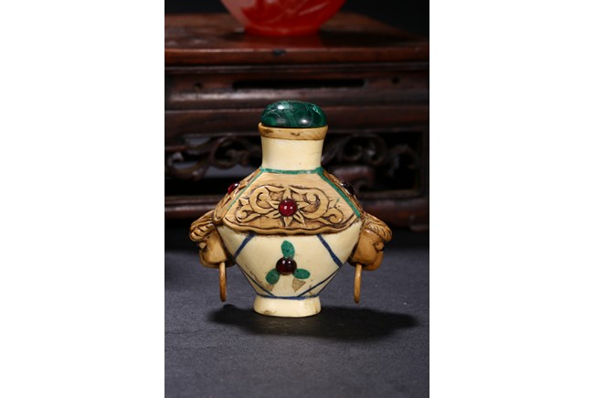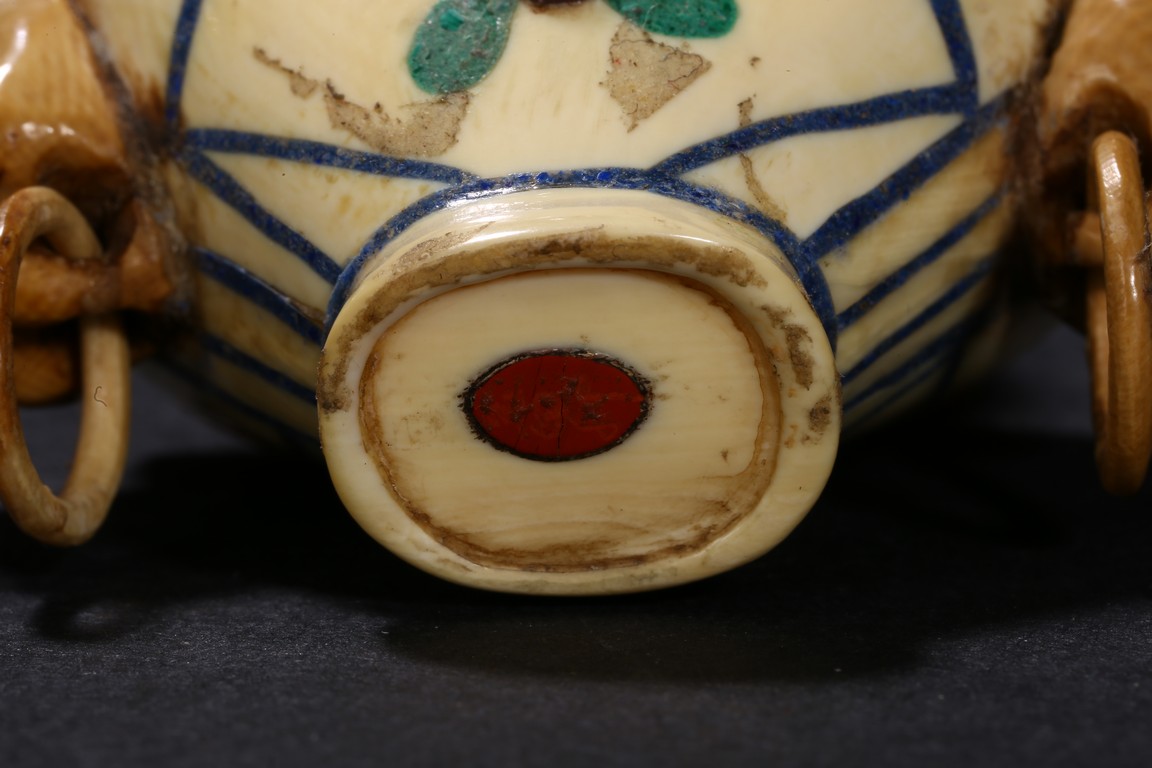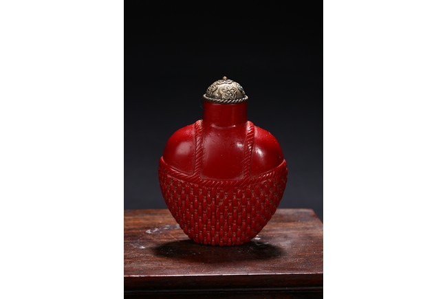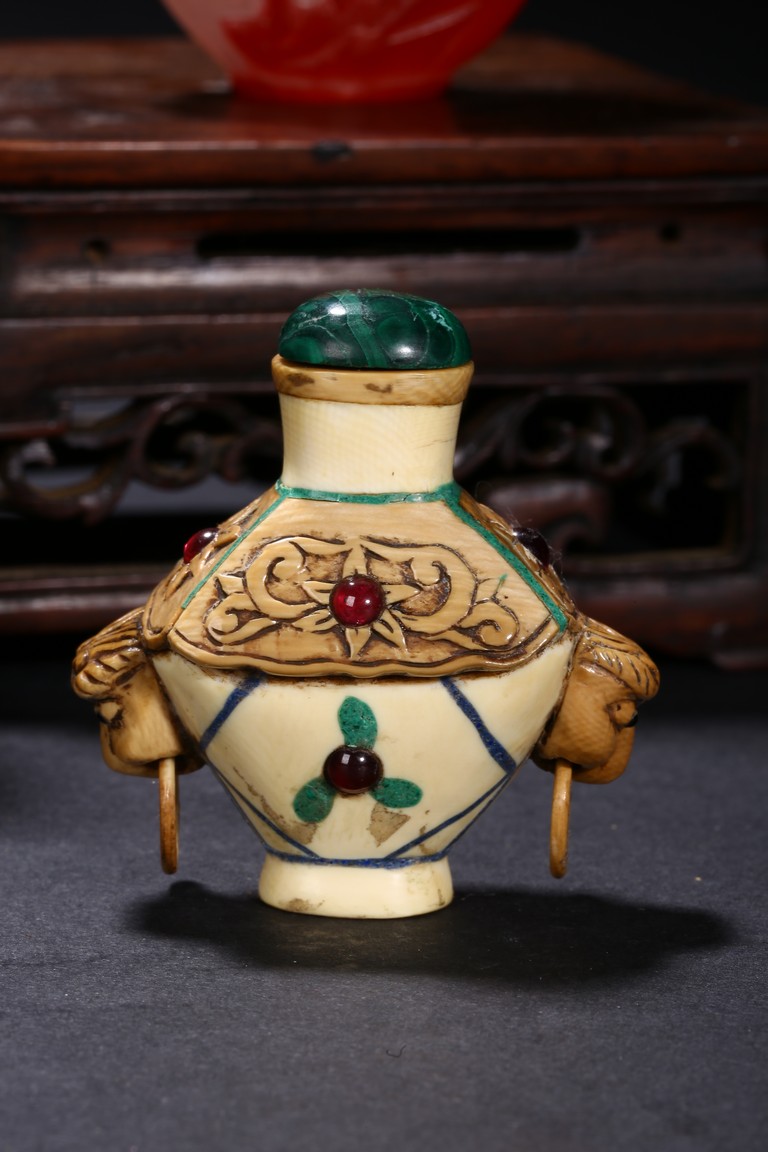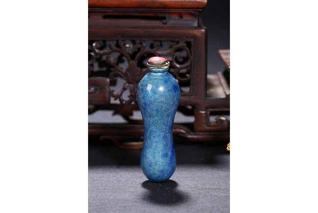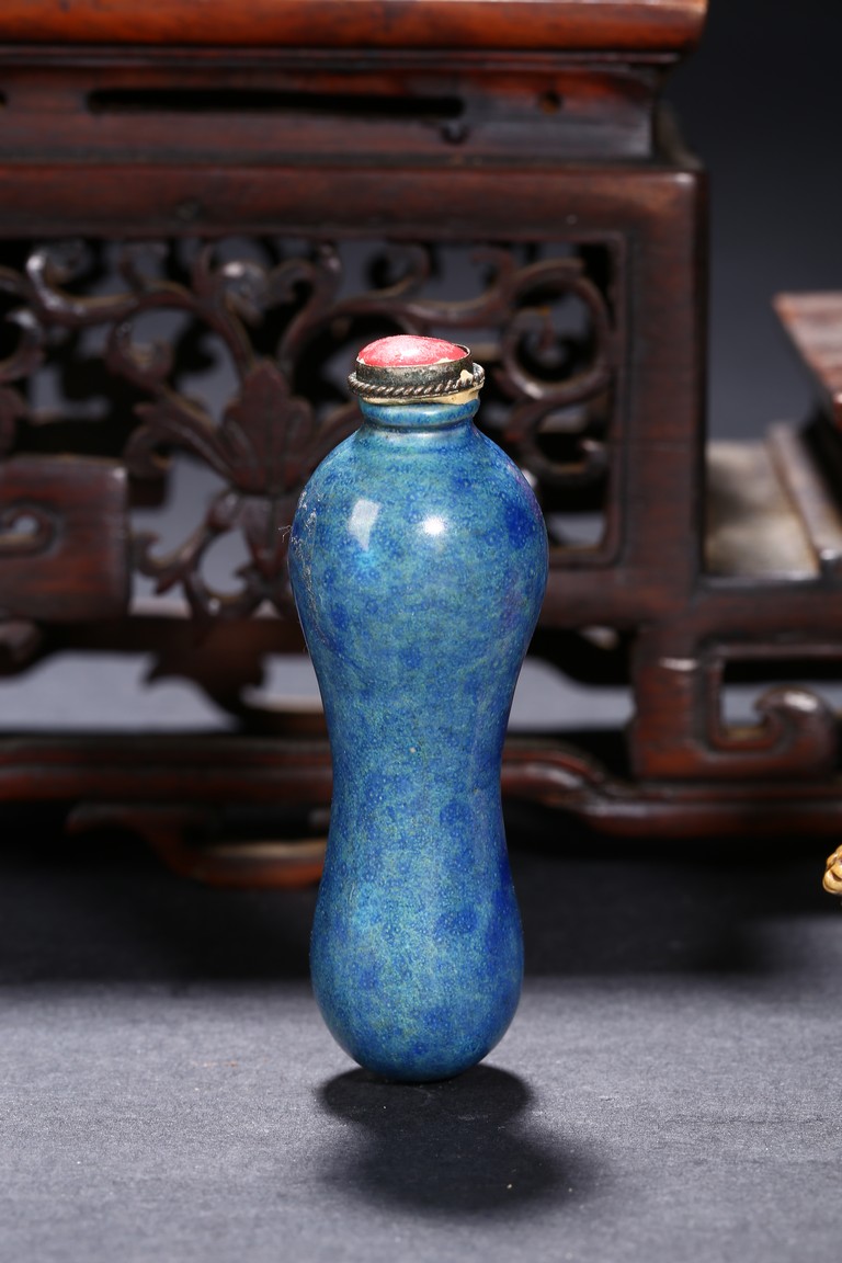 Including a red glass snuff bottle with basket design; a transparent amber glass bottle with lotus decoration; a melon shaped blue glazed snuff bottle; an bone snuff bottle with gems; an red glass overlay 'horse under willow' snuff bottle; a cloisonne enamel 'scroll lotus' snuff bottle; and a black lacquered mother-of-pearl snuff bottle.Qing Dynasty period