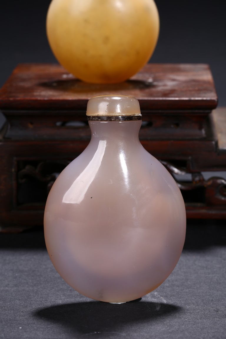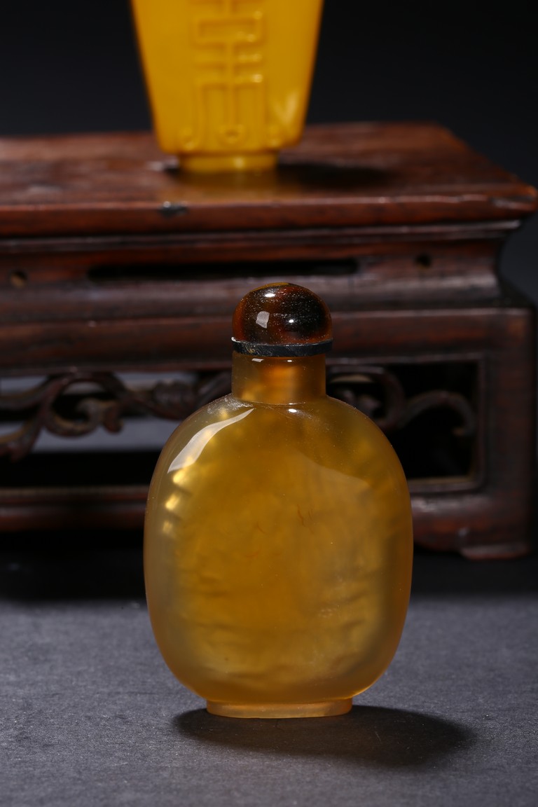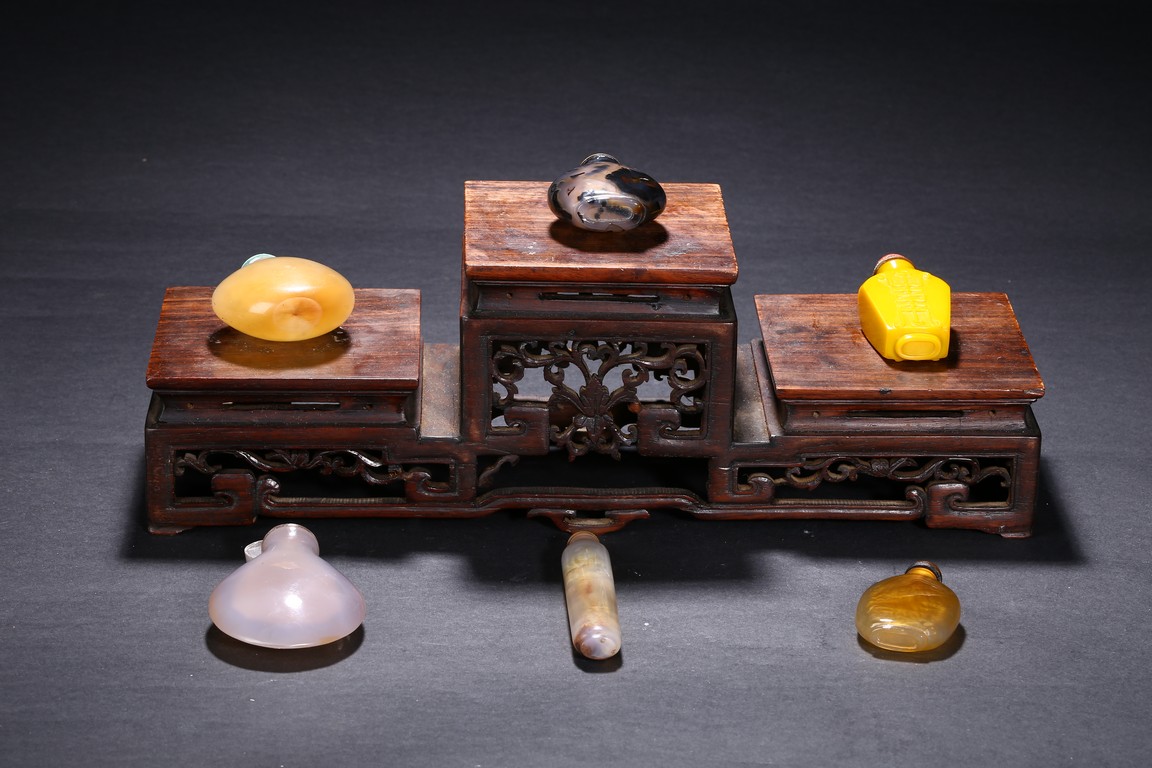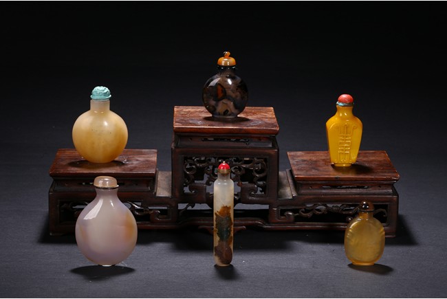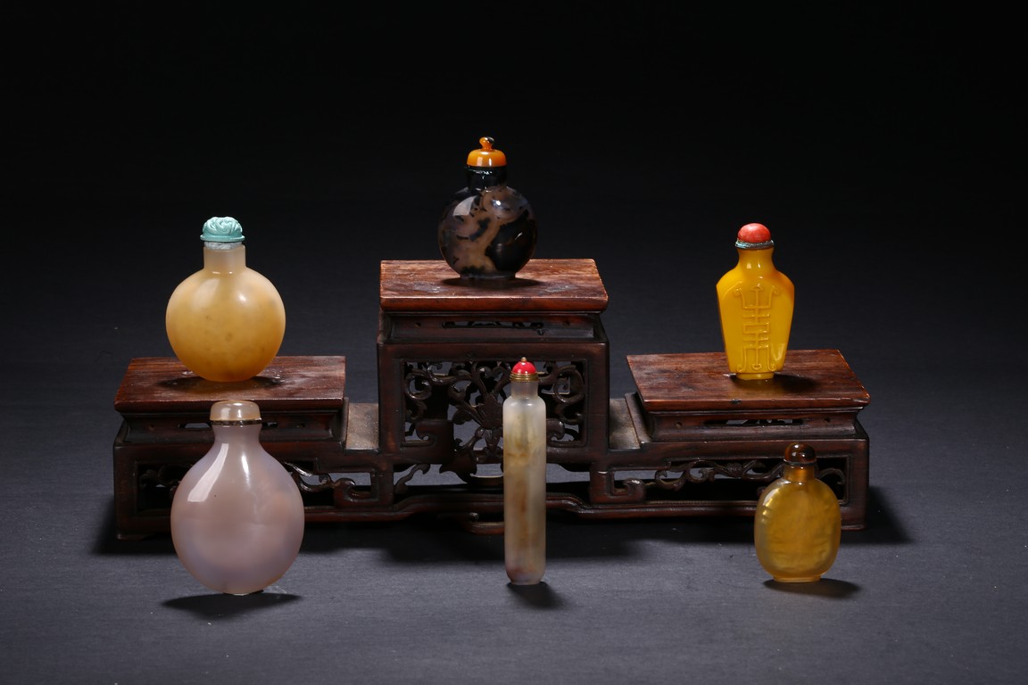 Including of a shadow agate snuff bottle; a yellow glass ‘shou’ snuff bottle; an agate cylindrical snuff bottle; an agate lavender tone snuff bottle; a yellow agate snuff bottle; a translucent yellow tone agate snuff bottle.Qing Dynasty period.