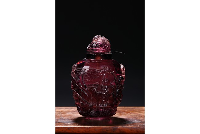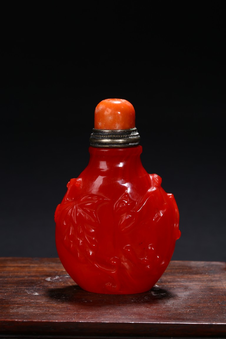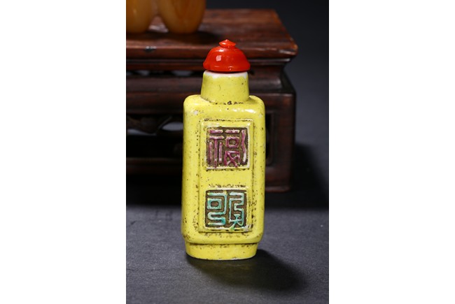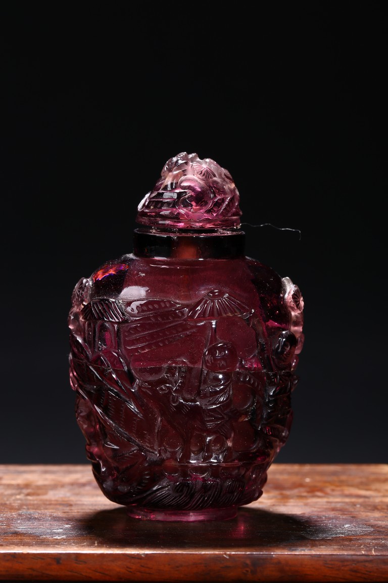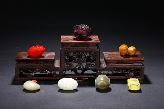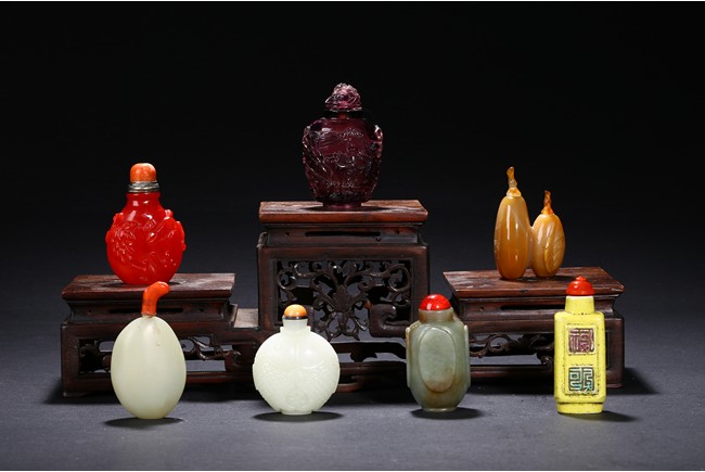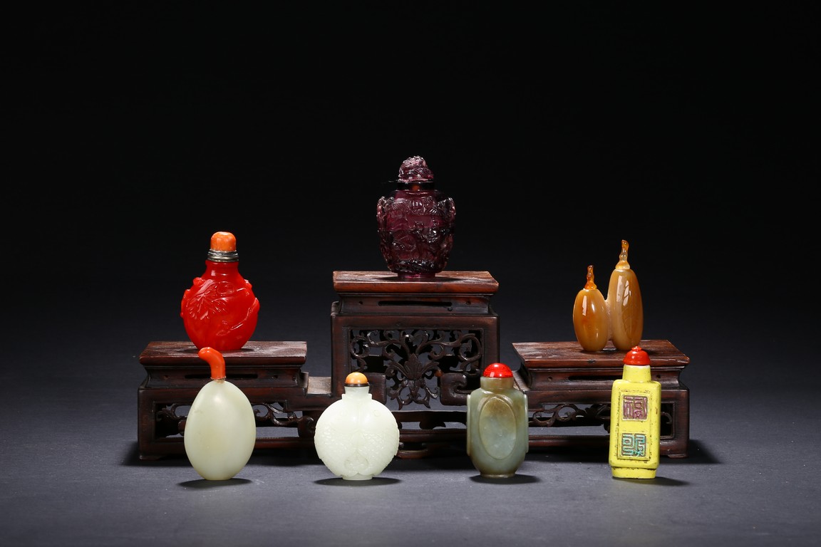 Including of a purple color carved glass snuff bottle; a chinese yellow glazed snuff bottle; a red carved snuff bottle; a celadon jadeite snuff bottle; a pale white carved snuff bottle; a brown color snuff bottle; a white egg shaped snuff bottle.Qing Dynasty period.