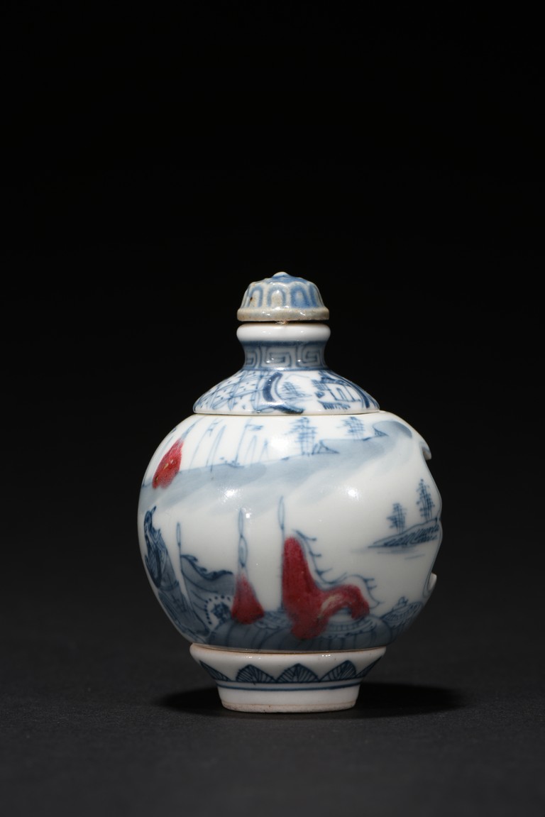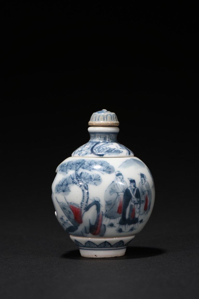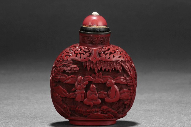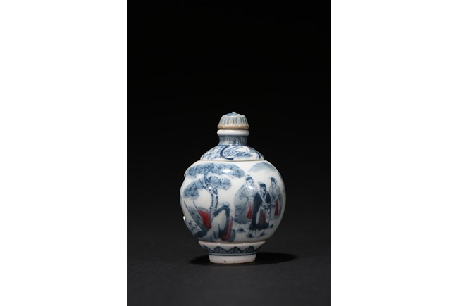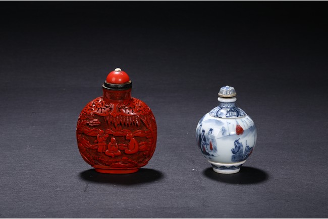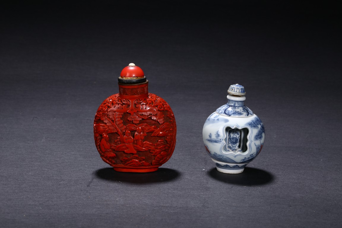 Including a white and blue revolving figures snuff bottle and a carved cinnabar lacquer snuff bottle.Qing Dynasty period.