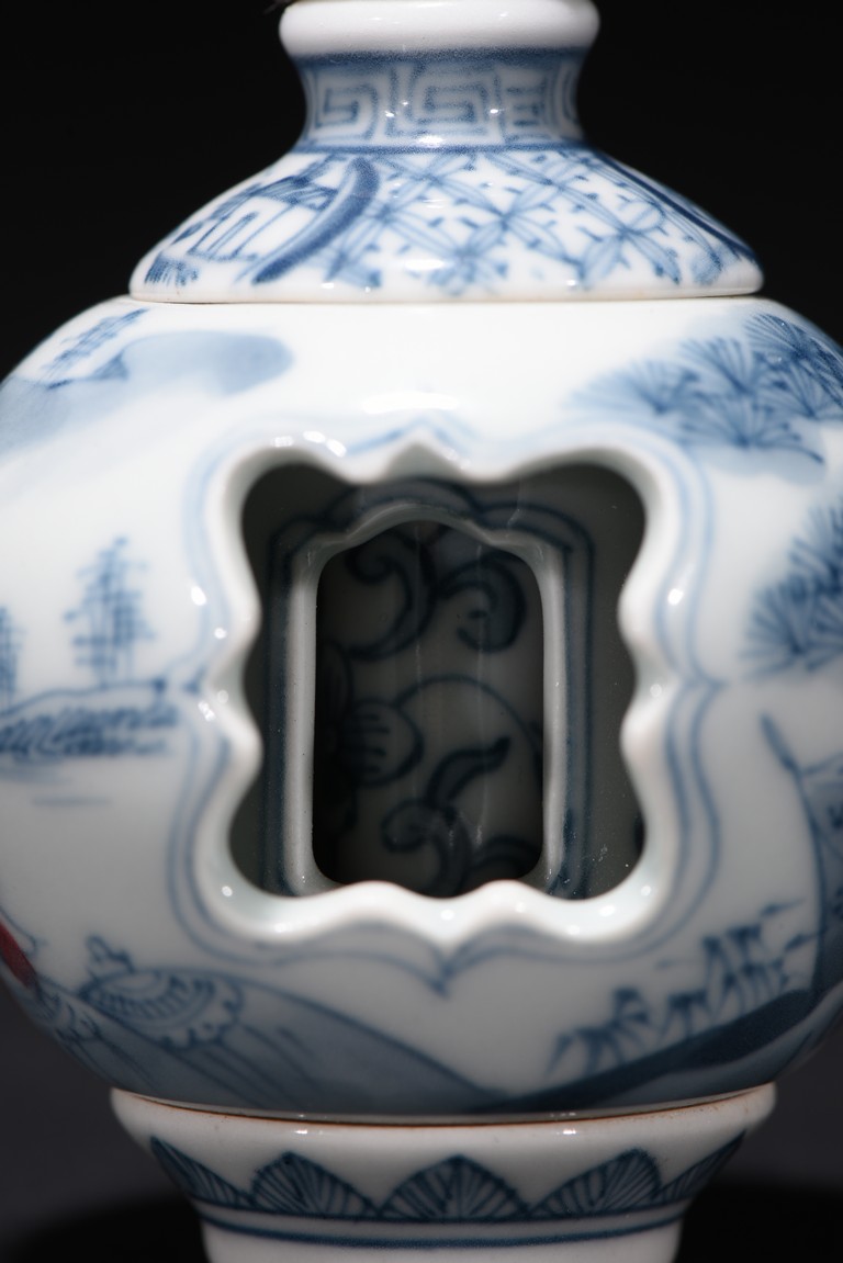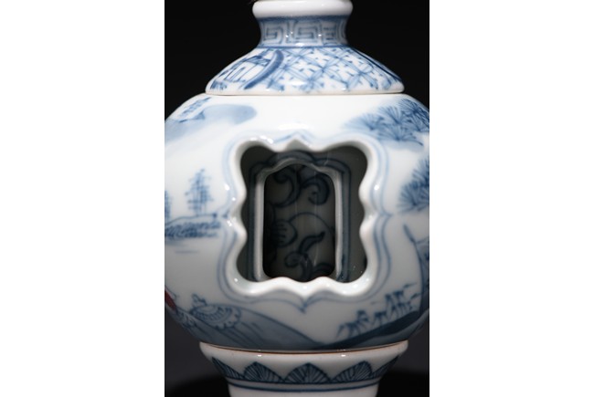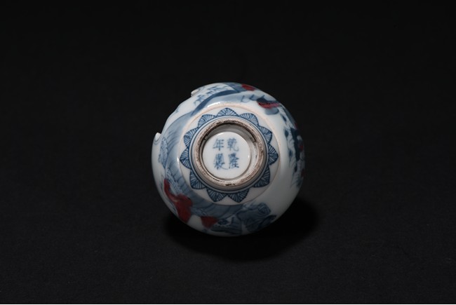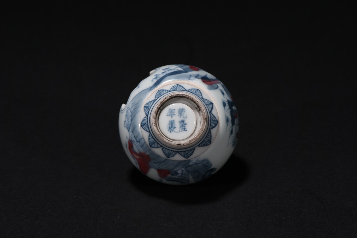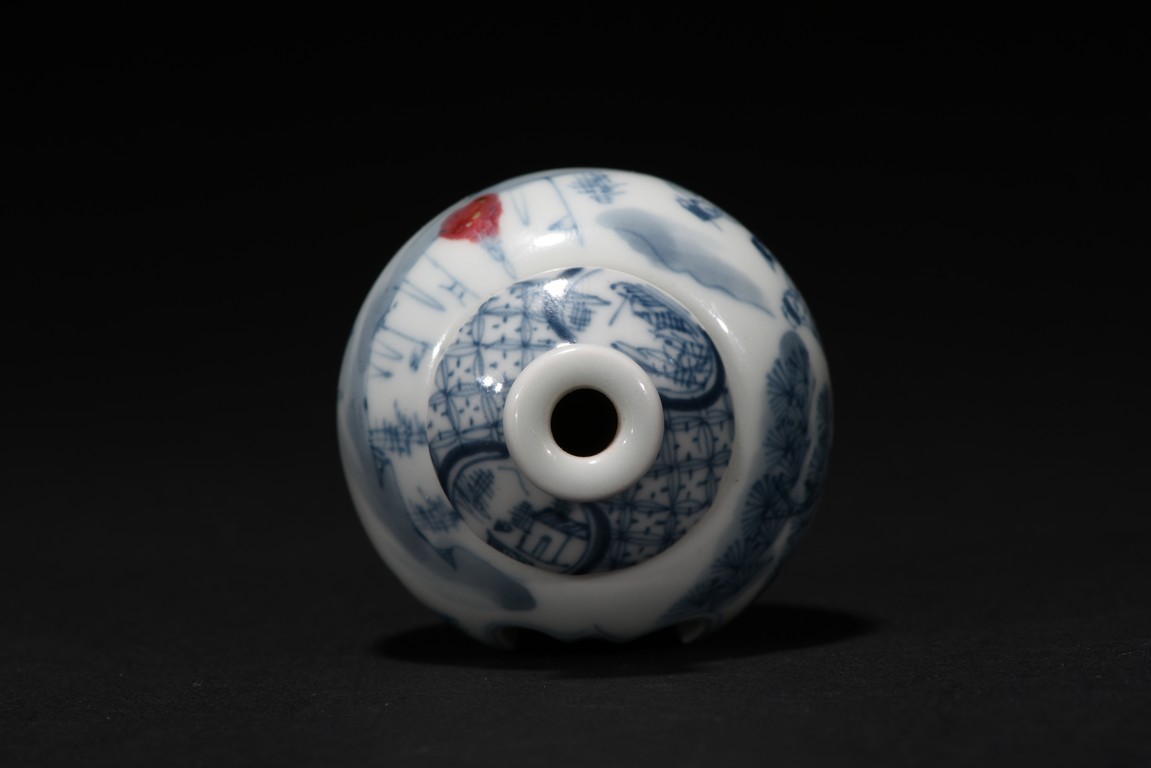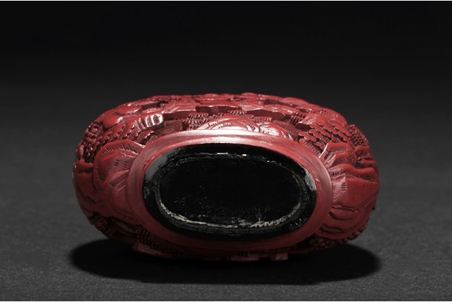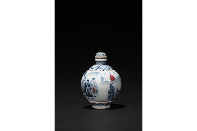 Including a white and blue revolving figures snuff bottle and a carved cinnabar lacquer snuff bottle.Qing Dynasty period.