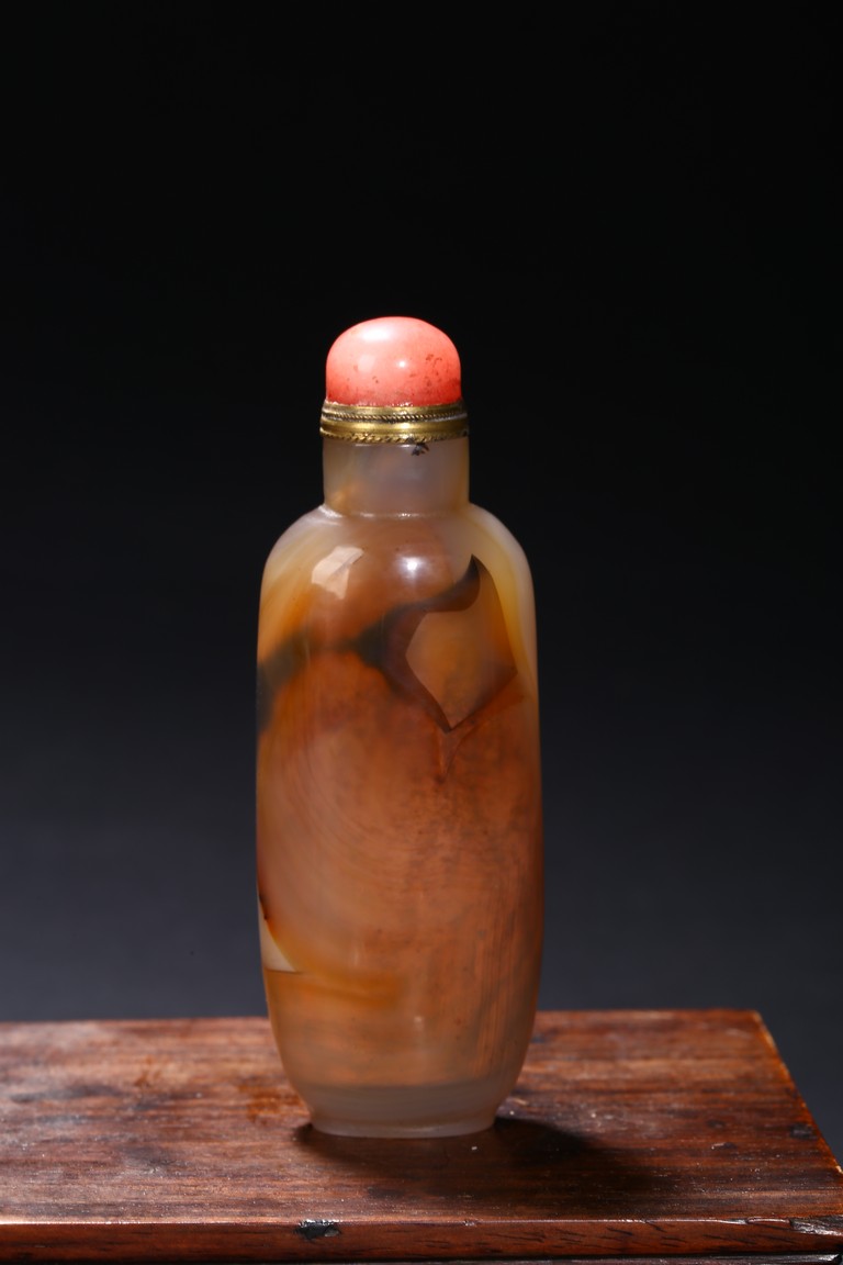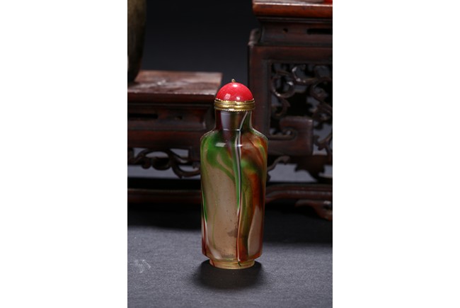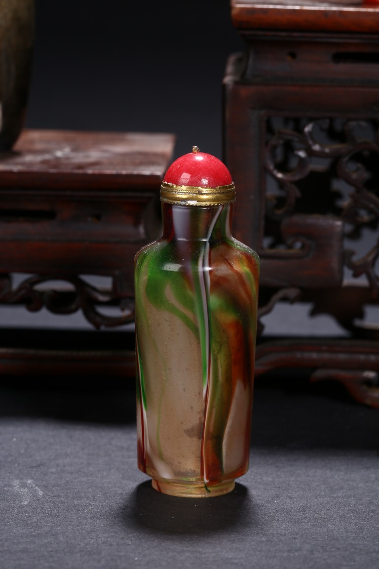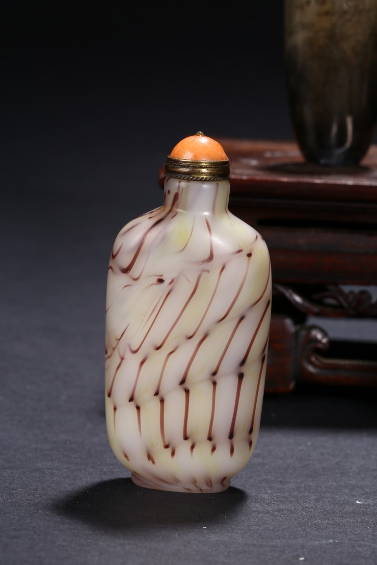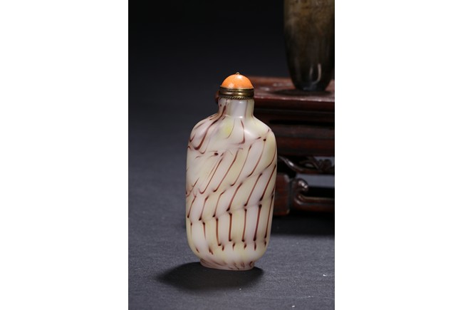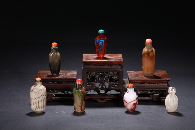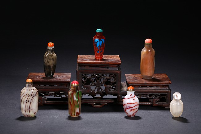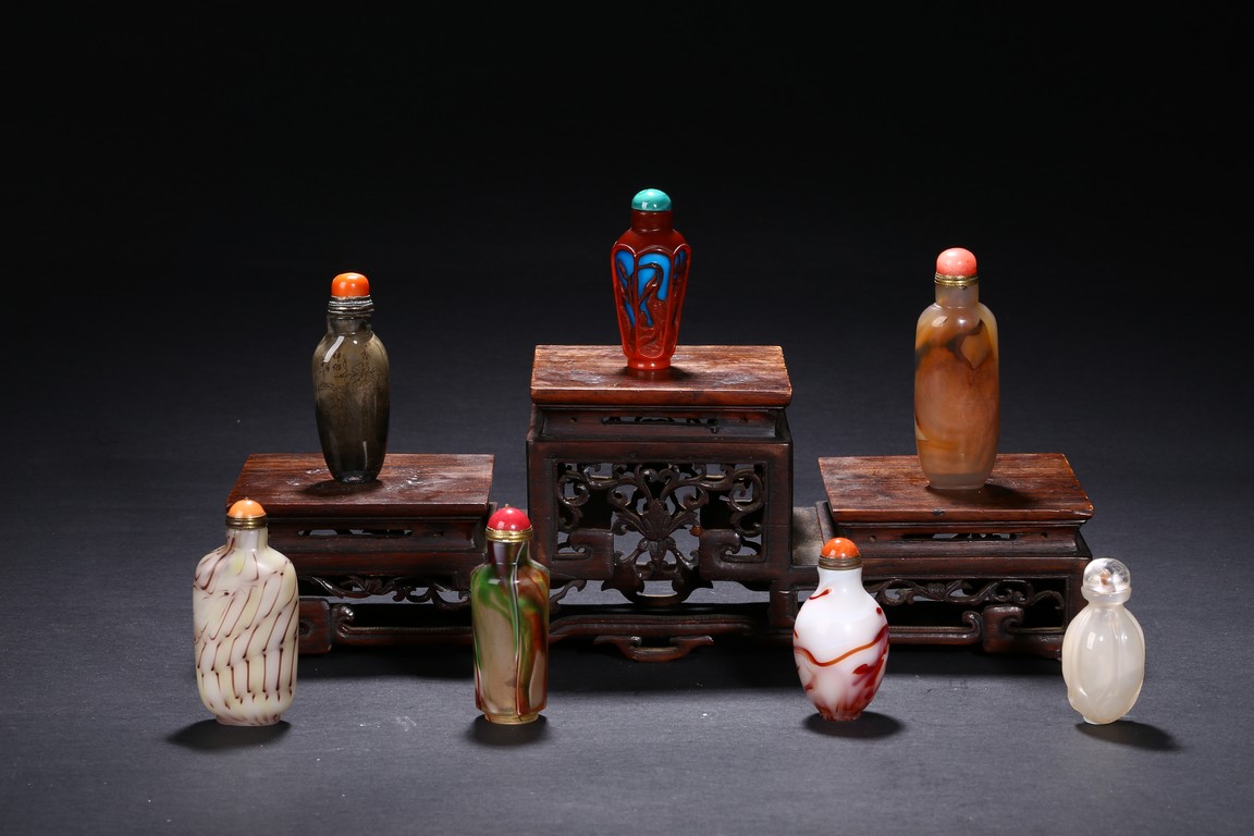 Including three swirl glass snuff bottles; three agate snuff bottles; and one red and blue overlay glass snuff bottle.Qing Dynasty period.