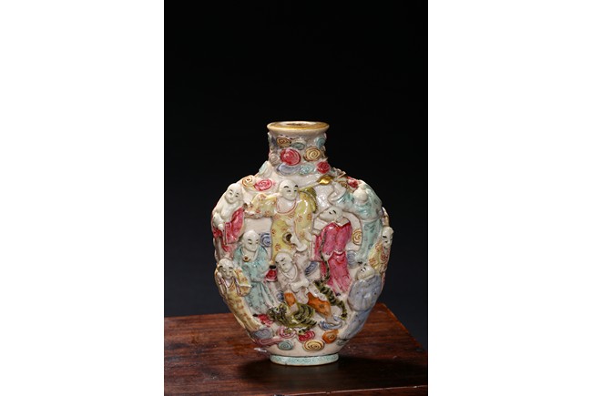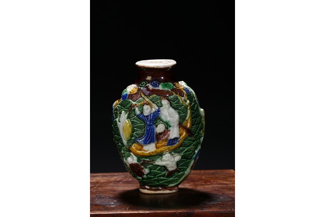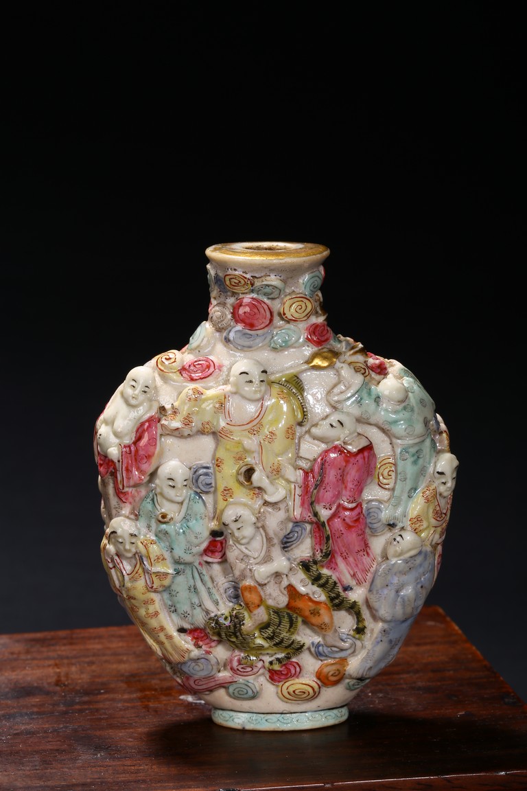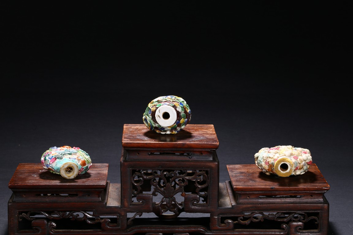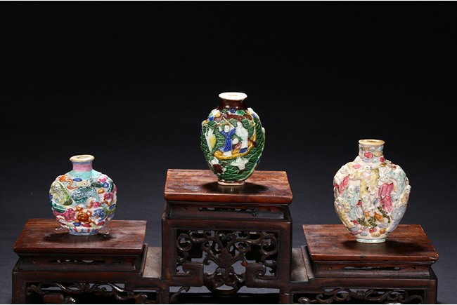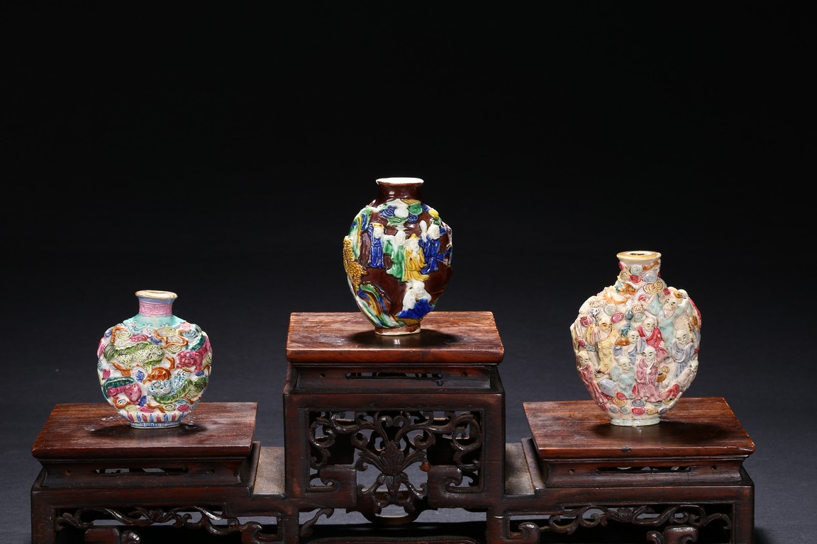 Including three carved famille rose snuff bottles depicting figures and landscape. Qing Dynasty period.