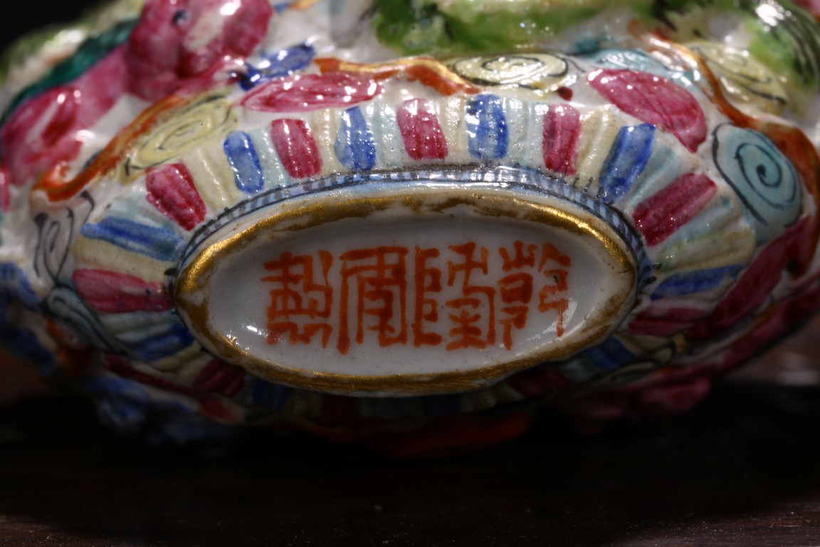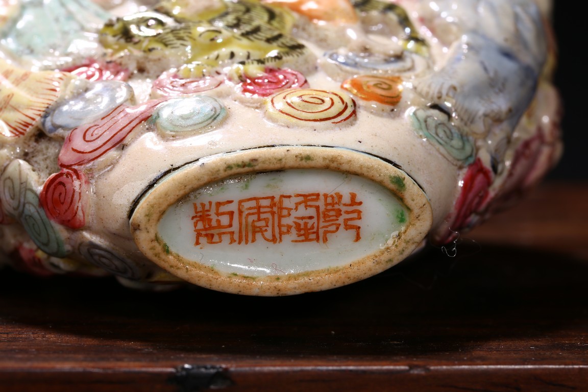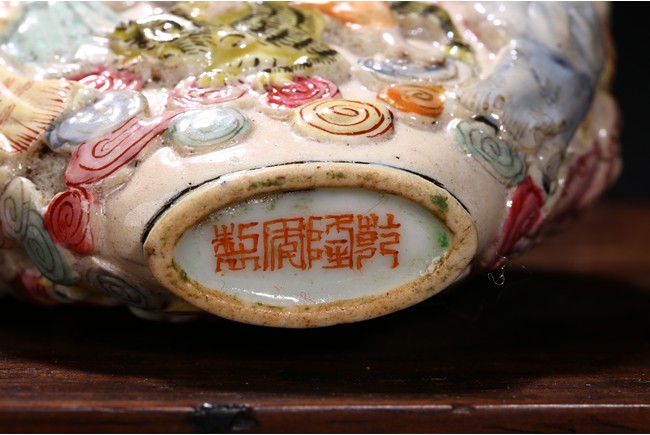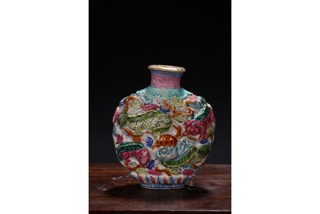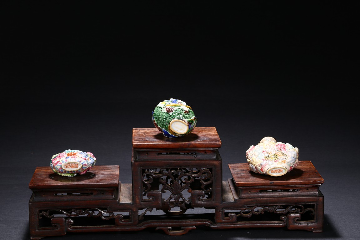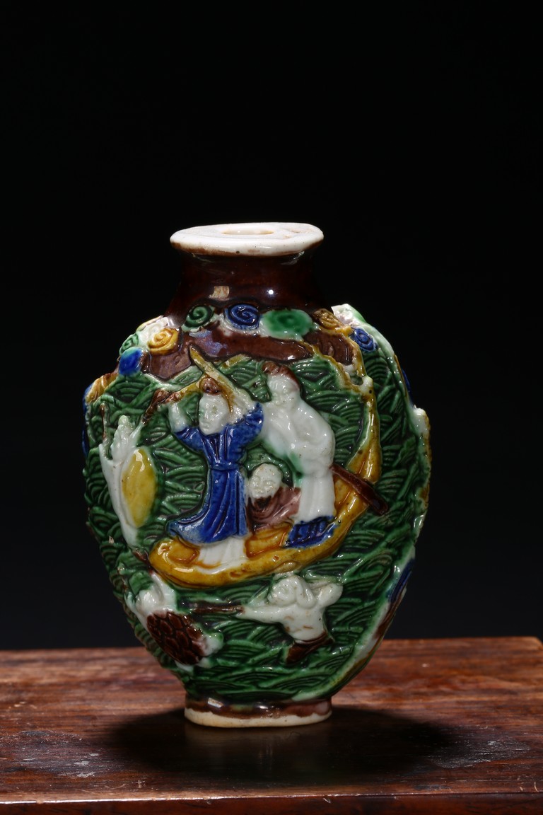 Including three carved famille rose snuff bottles depicting figures and landscape. Qing Dynasty period.