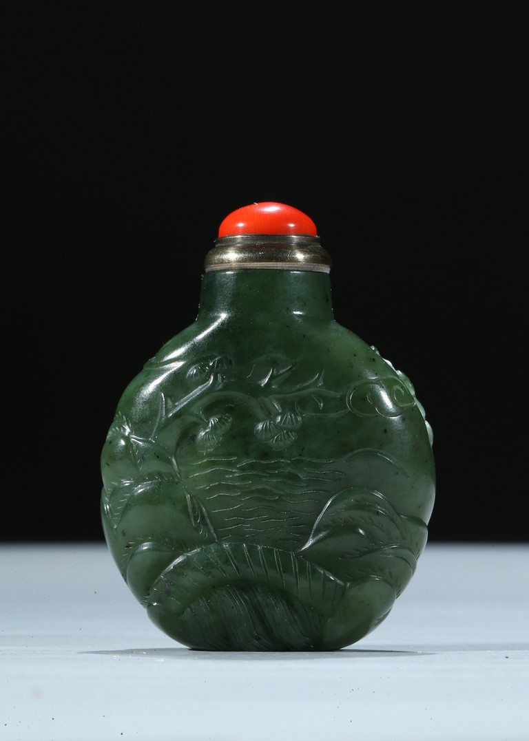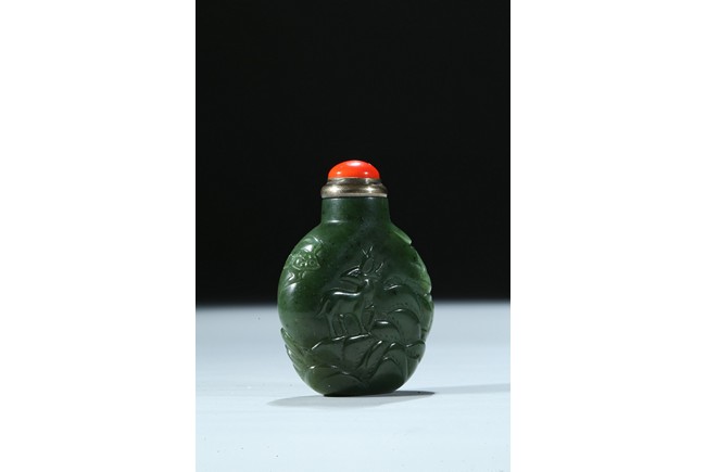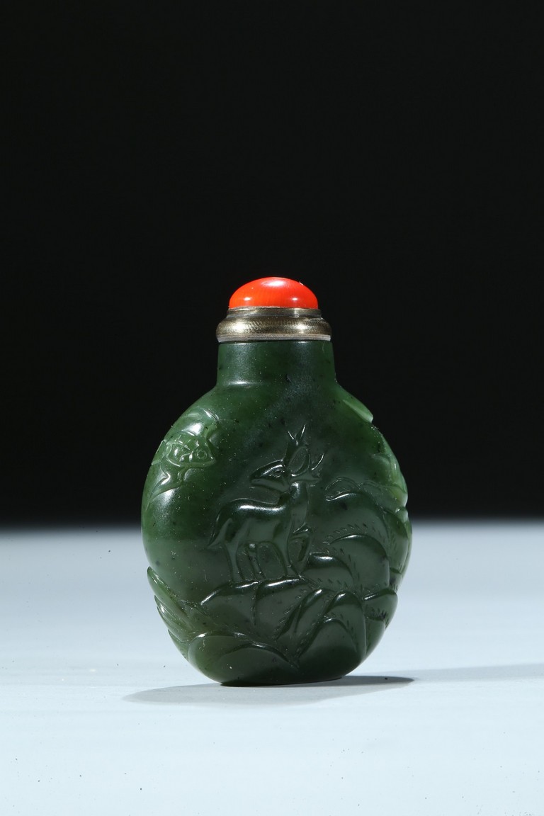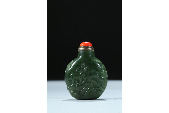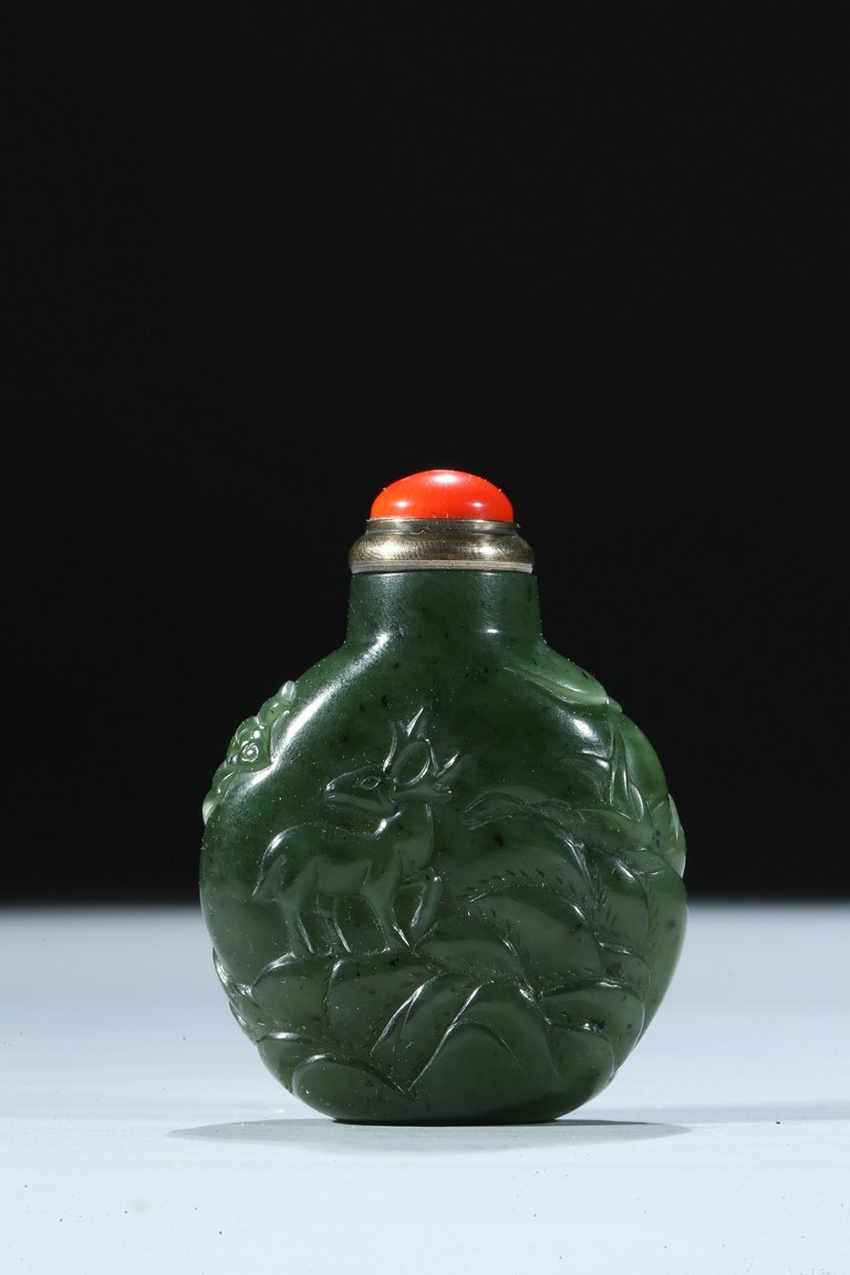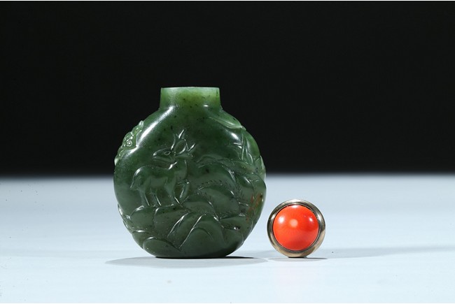 Of rounded form, the well hollowed snuff bottle carved with a continuous scene of a deer and a bat in a lake and bridge landscape. Qing Dynasty period.