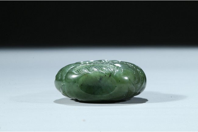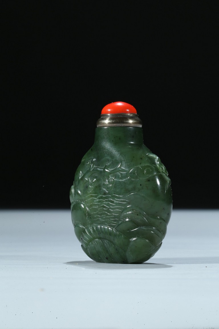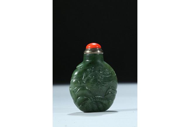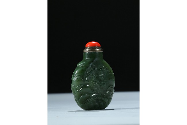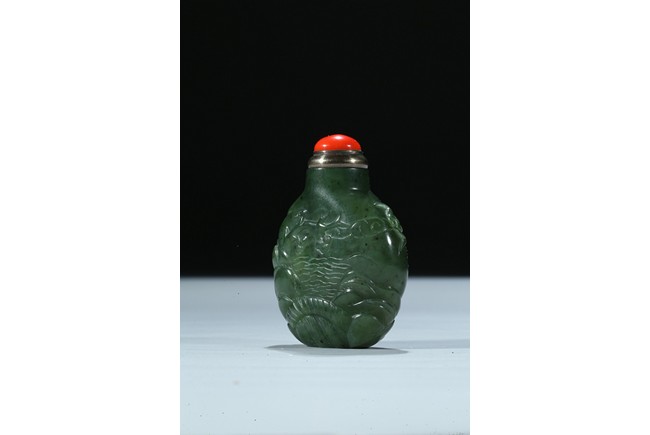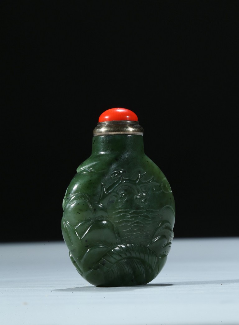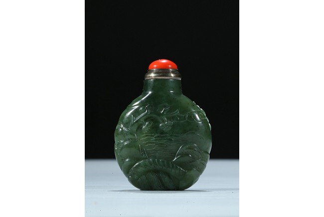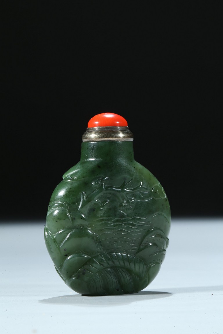 Of rounded form, the well hollowed snuff bottle carved with a continuous scene of a deer and a bat in a lake and bridge landscape. Qing Dynasty period.
