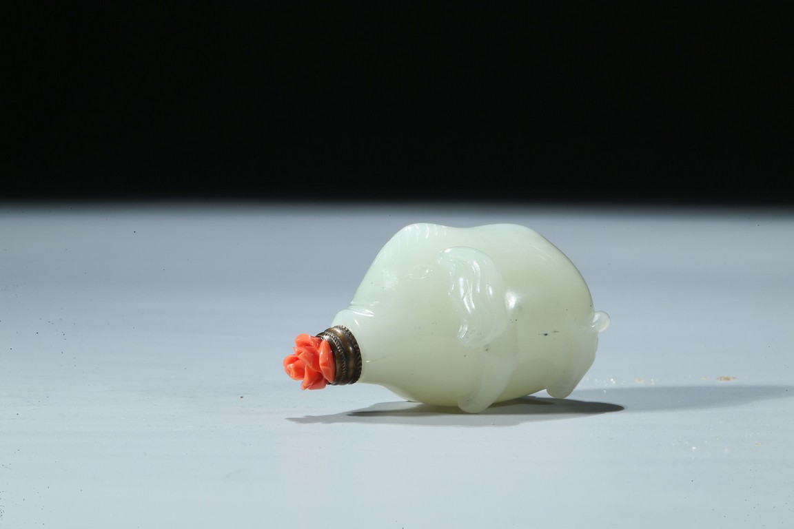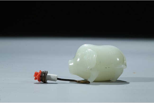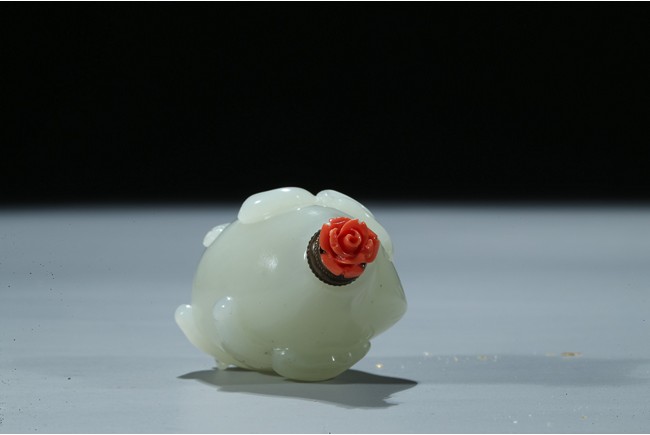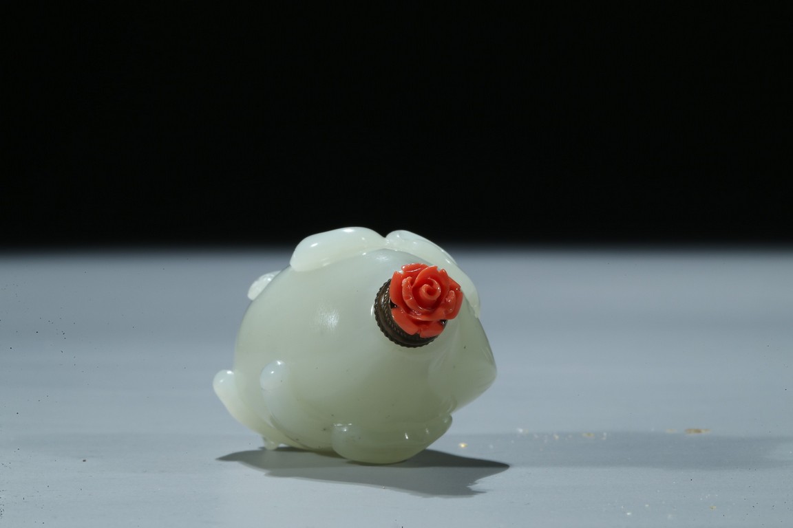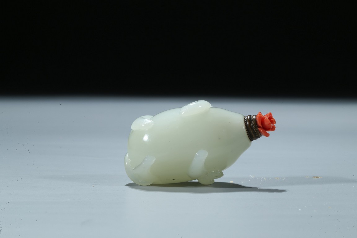 Carved in the form of a recumbent pig, the stone is of even white tone. Coral stopper. Qing Dynasty period.