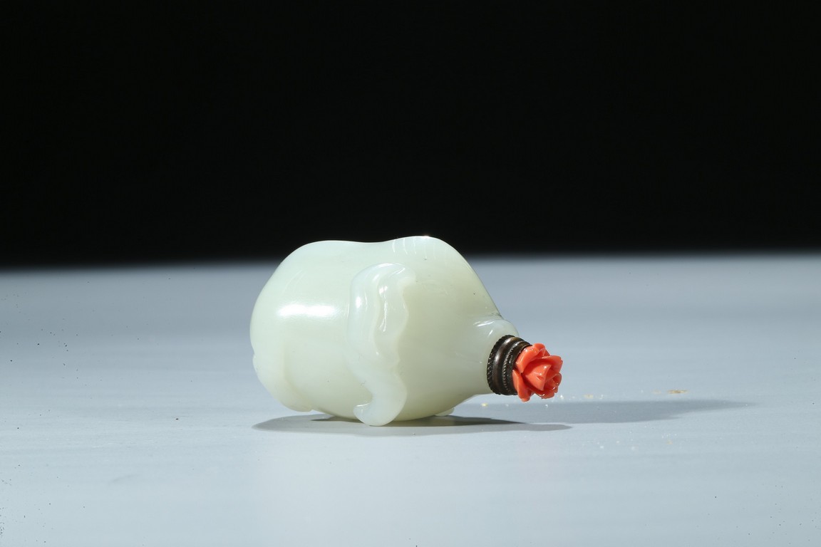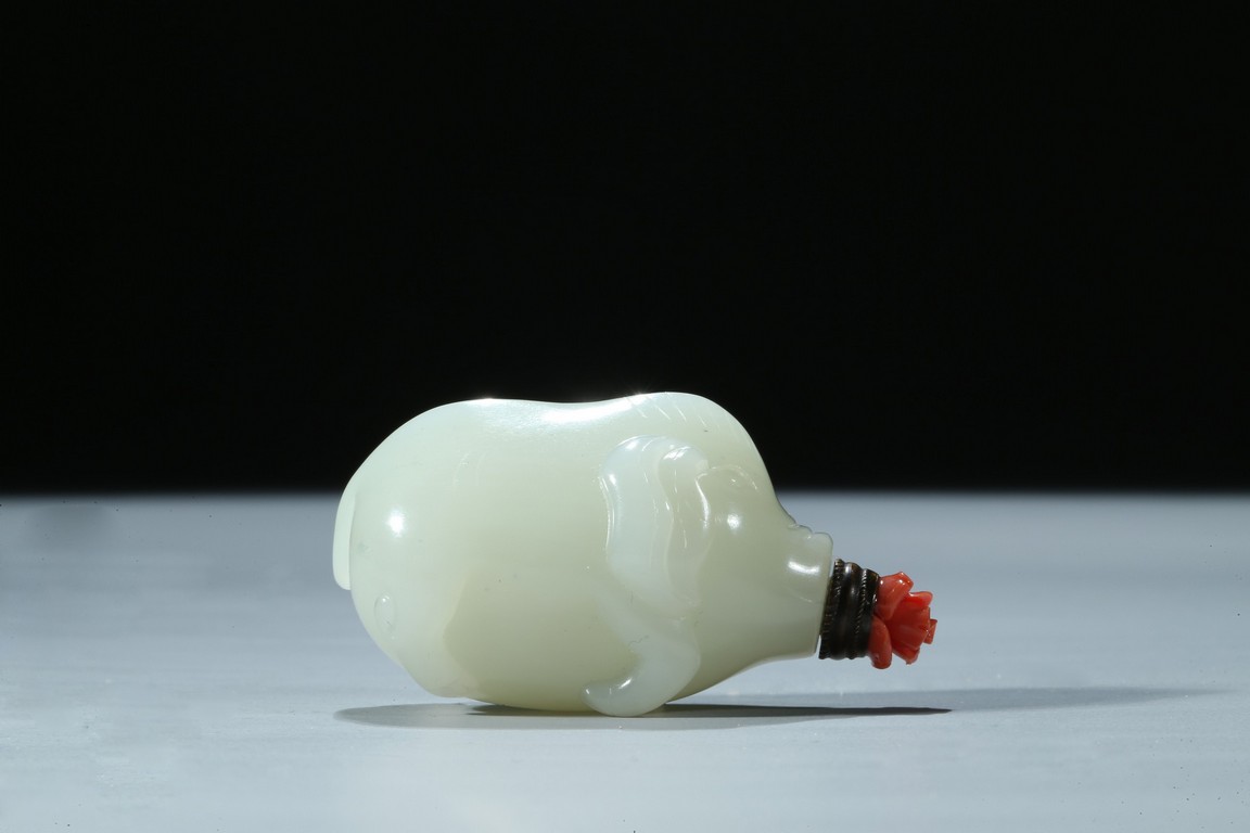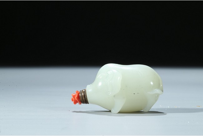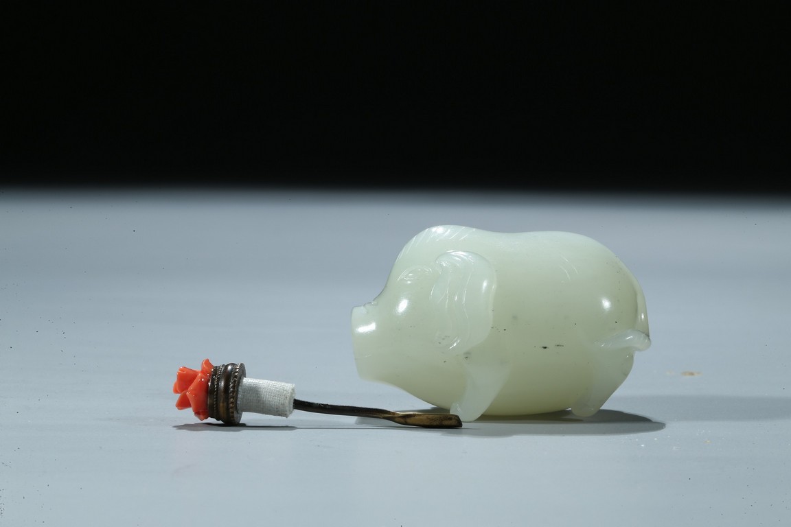 Carved in the form of a recumbent pig, the stone is of even white tone. Coral stopper. Qing Dynasty period.