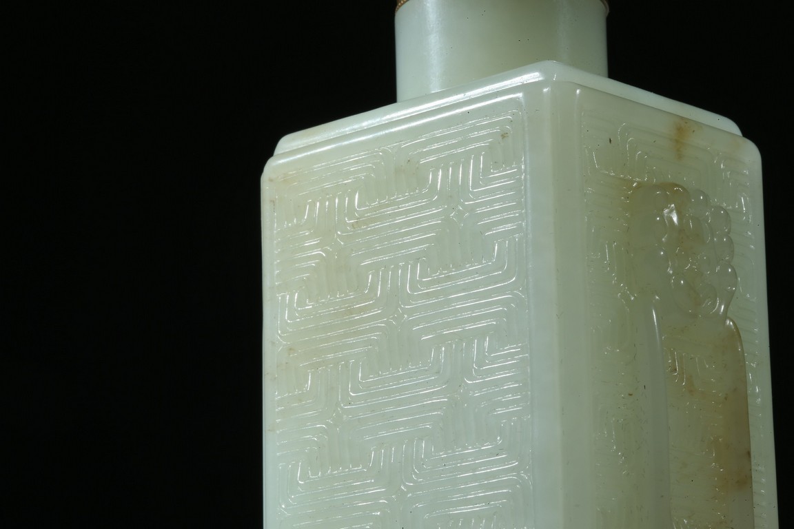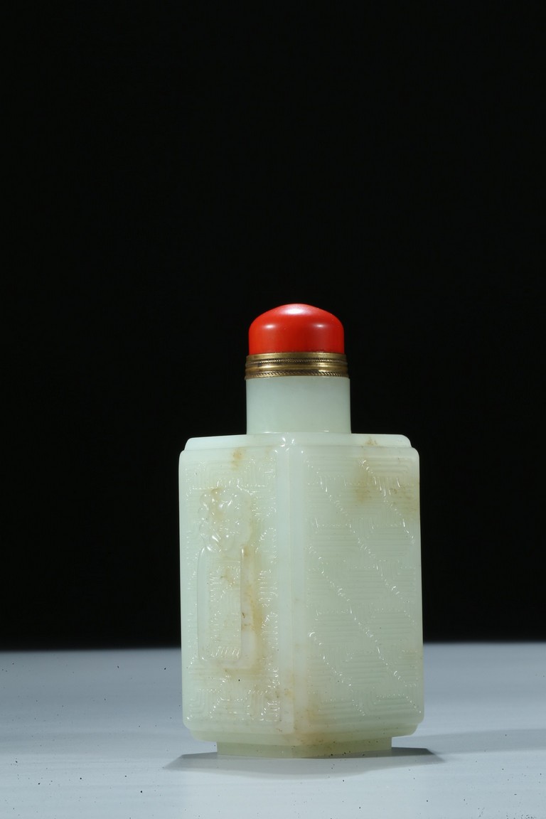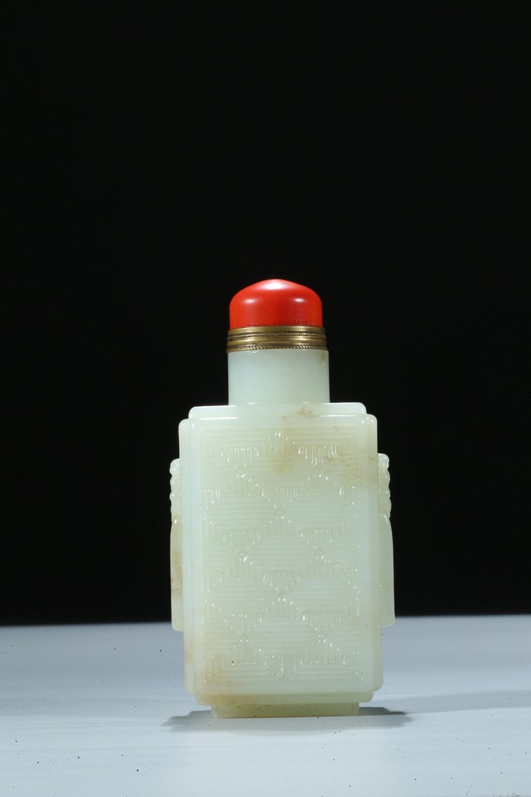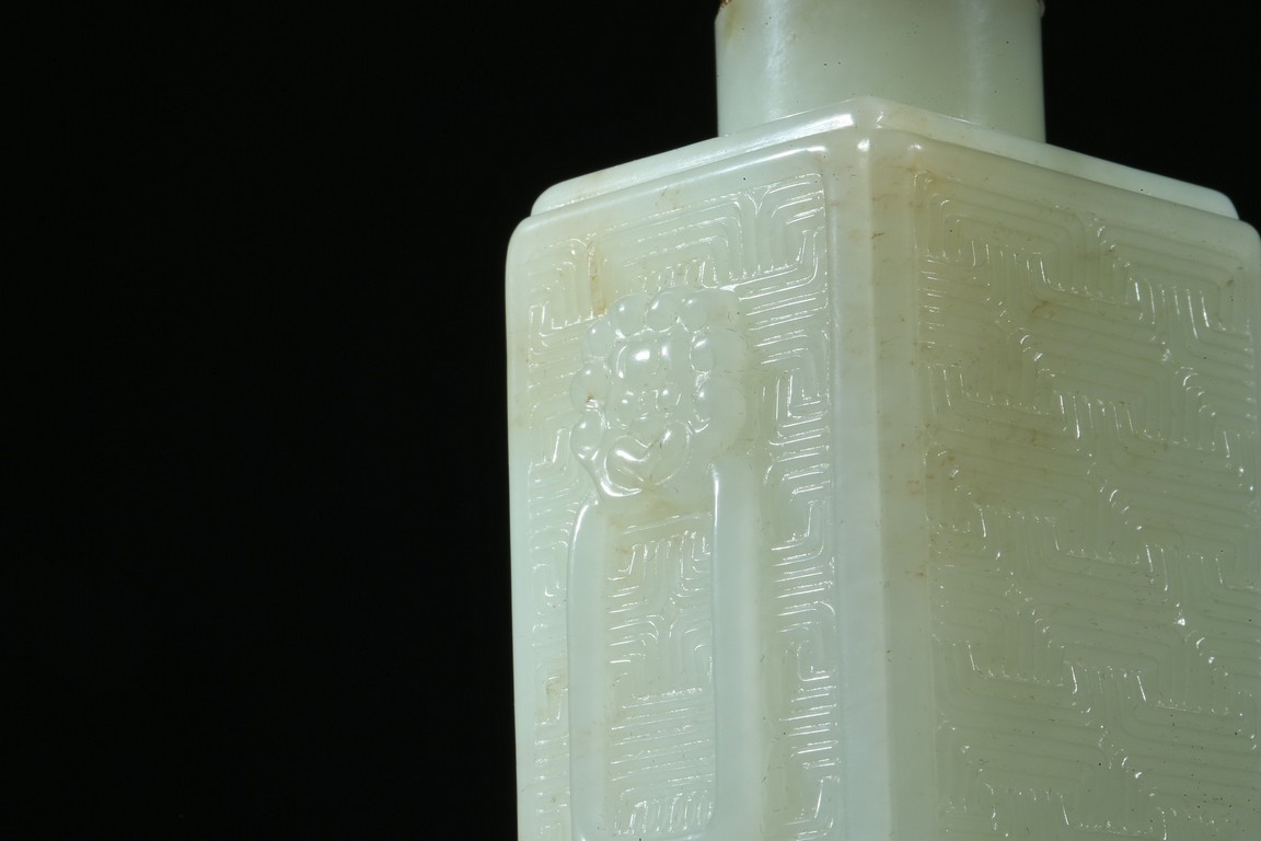 Well-hollowed, the flattened rectangular bottle with cusped corners, standing on a conforming foot ring, with a cylindrical neck, the narrower sides with raised mask-and-ring handles, each side carved with geometric pattern as background. The stone is of white tone with slight russet inclusions, domed coral stopper. Qing Dynasty period.