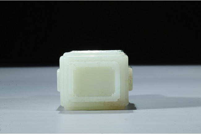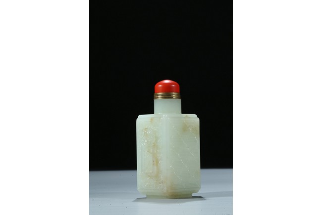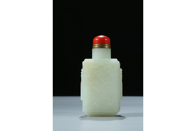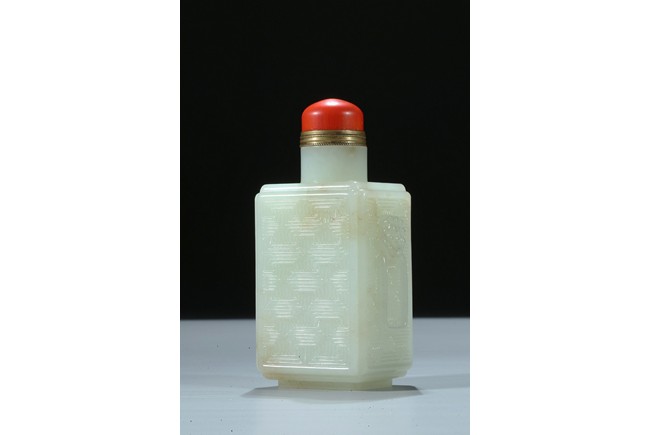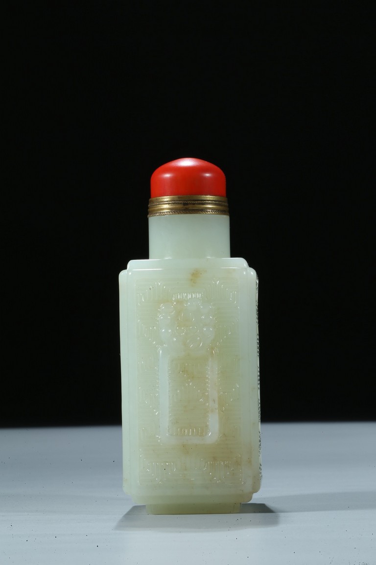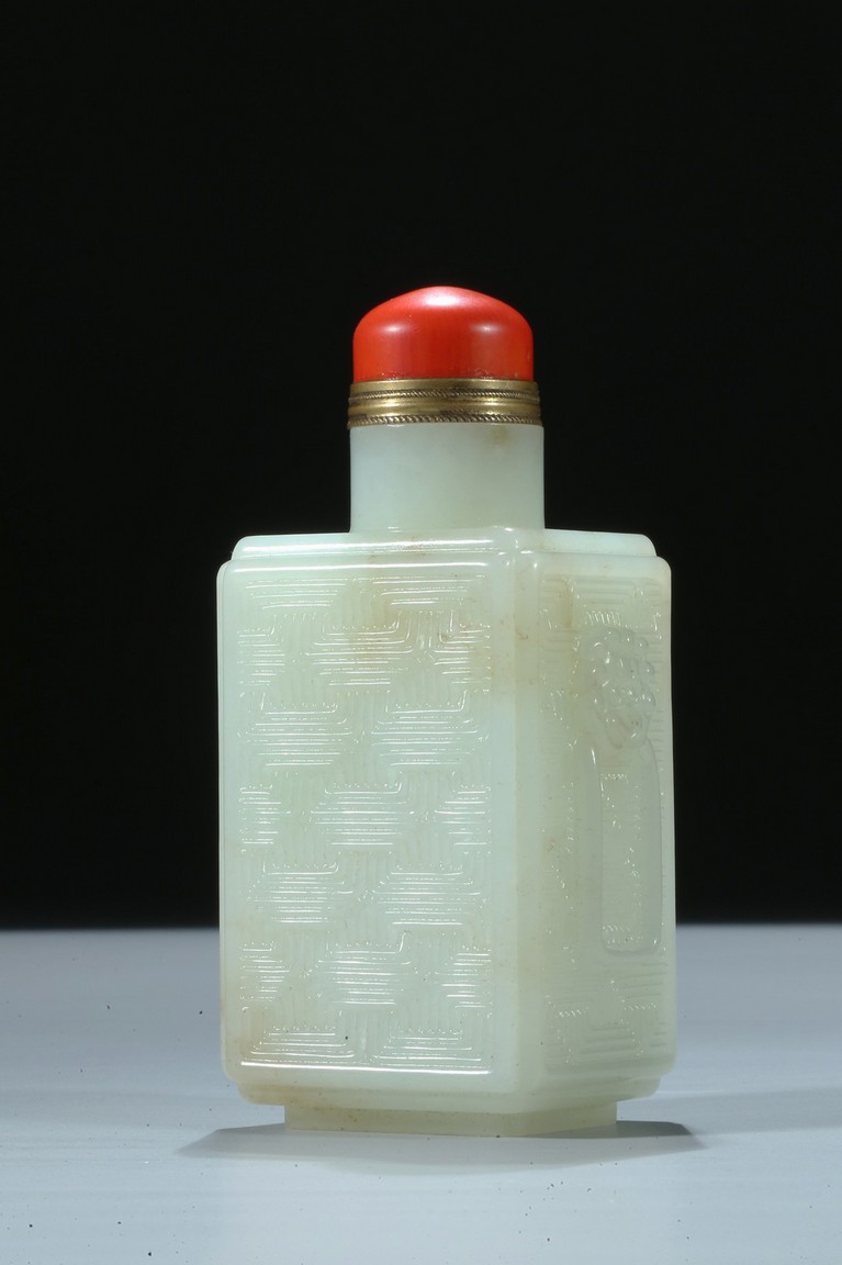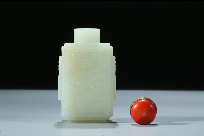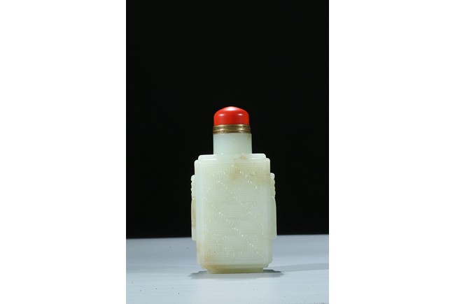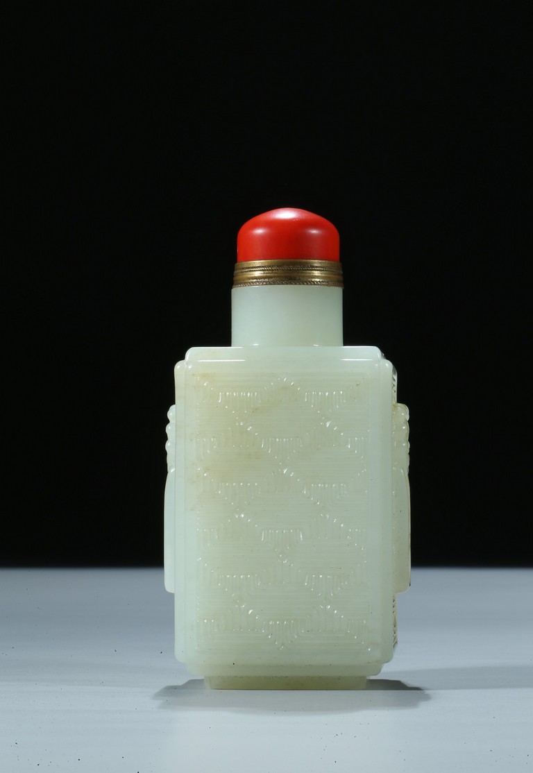 Well-hollowed, the flattened rectangular bottle with cusped corners, standing on a conforming foot ring, with a cylindrical neck, the narrower sides with raised mask-and-ring handles, each side carved with geometric pattern as background. The stone is of white tone with slight russet inclusions, domed coral stopper. Qing Dynasty period.