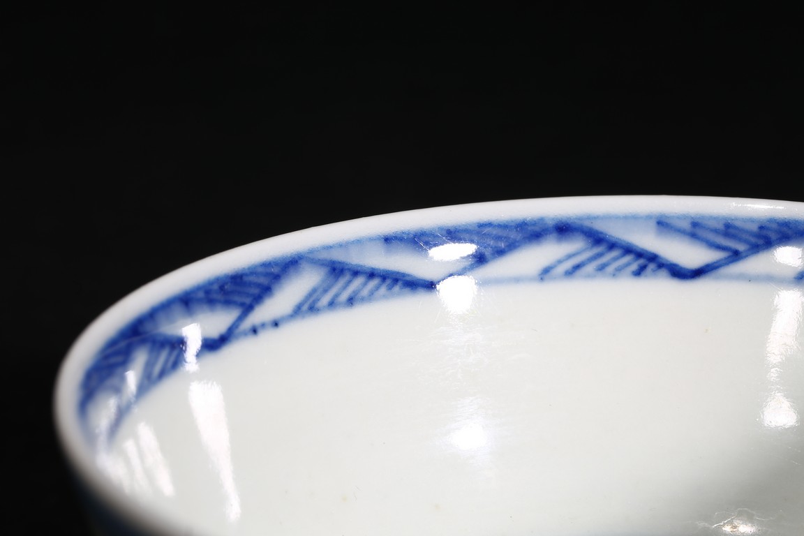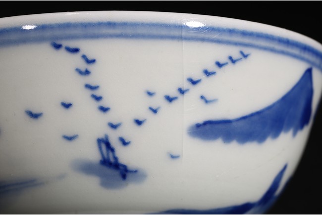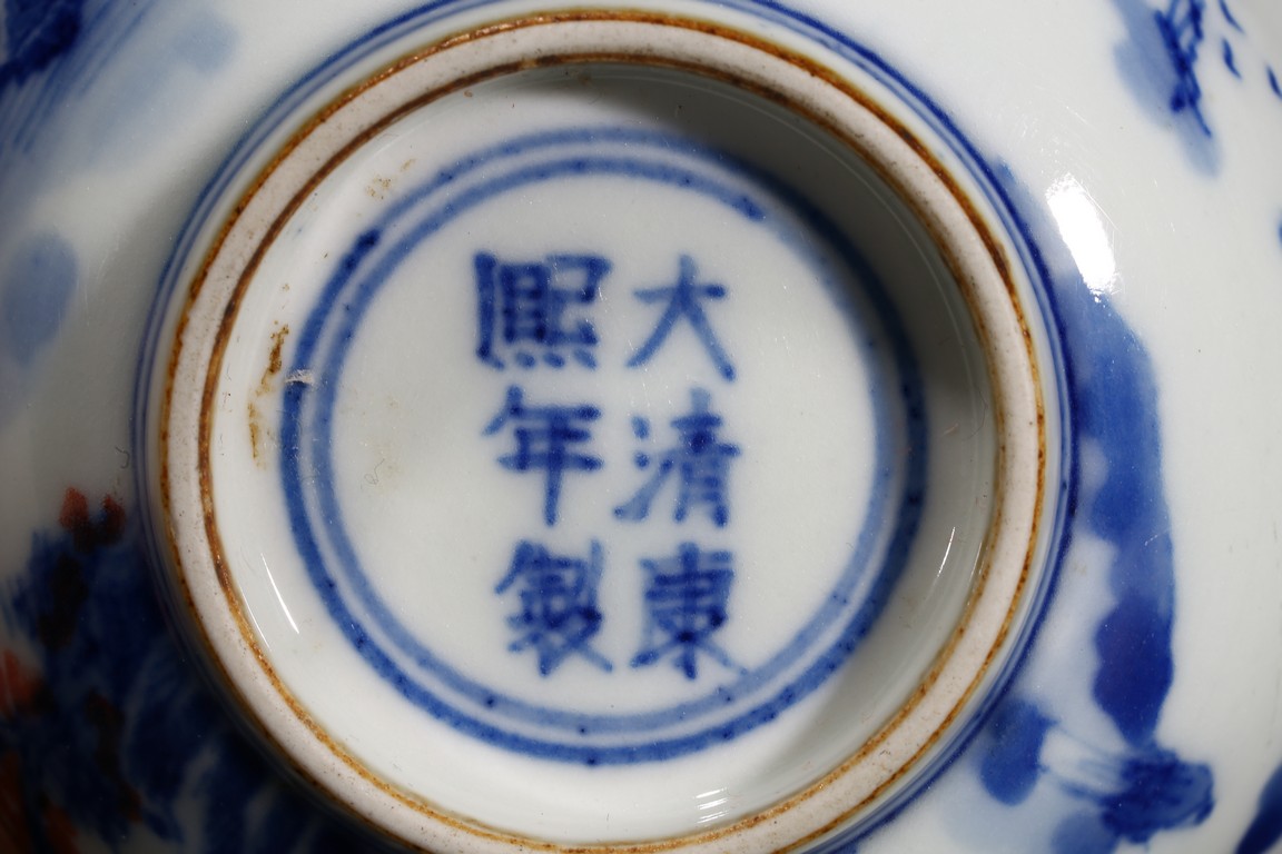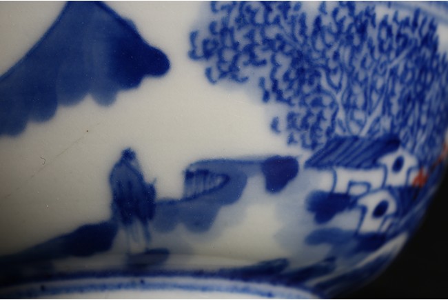 Of rounded sides, the body decorated with a landscape scene depicting village, mountains, and trees around the exterior, the interior painted with similar design within a double line roundel. Qing Dynasty period.