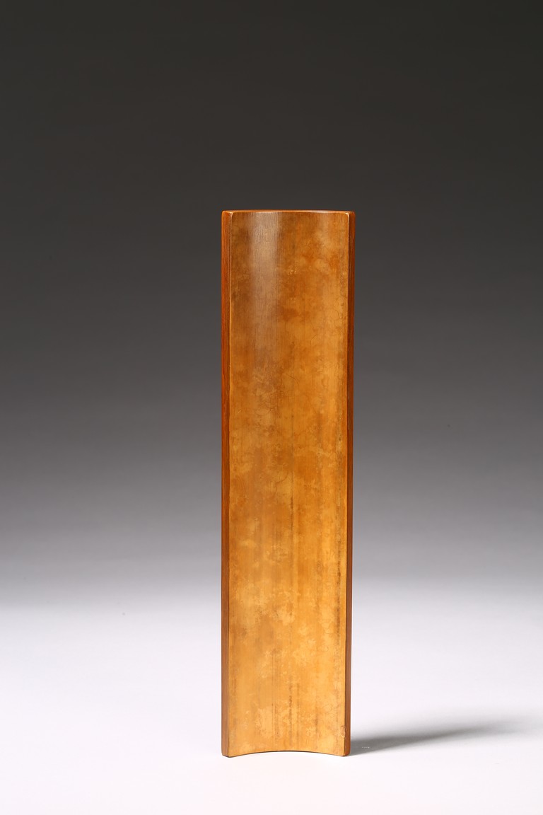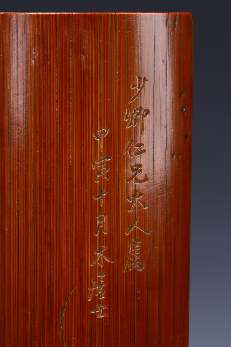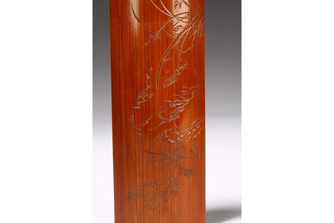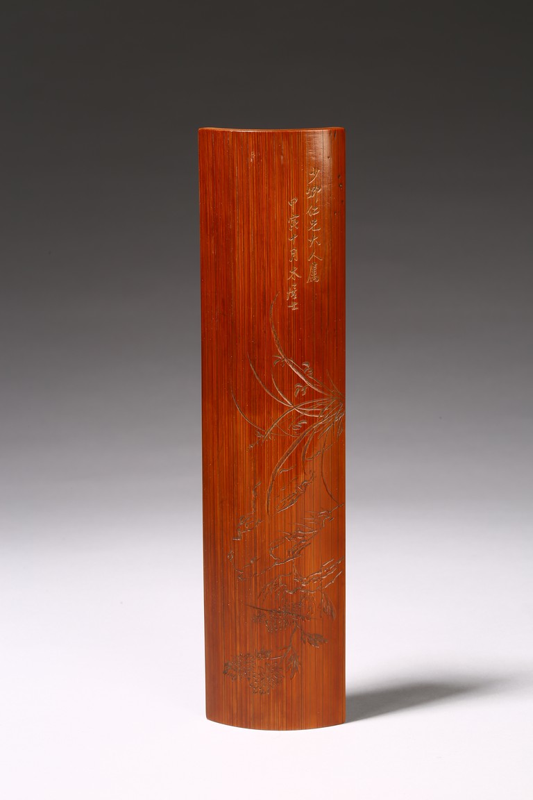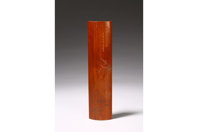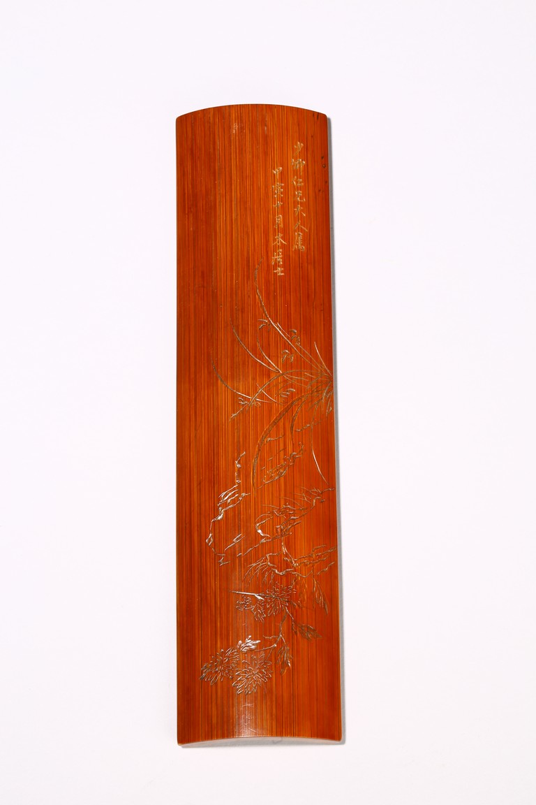 The convex surface carved with orchids and chrysanthemum growing from rockworks, the top right inscribed with inscription dedicated to Shao Qing and signed Mu Ju Shi, the bamboo patinated to a reddish-brown color. Qing Dynasty period.