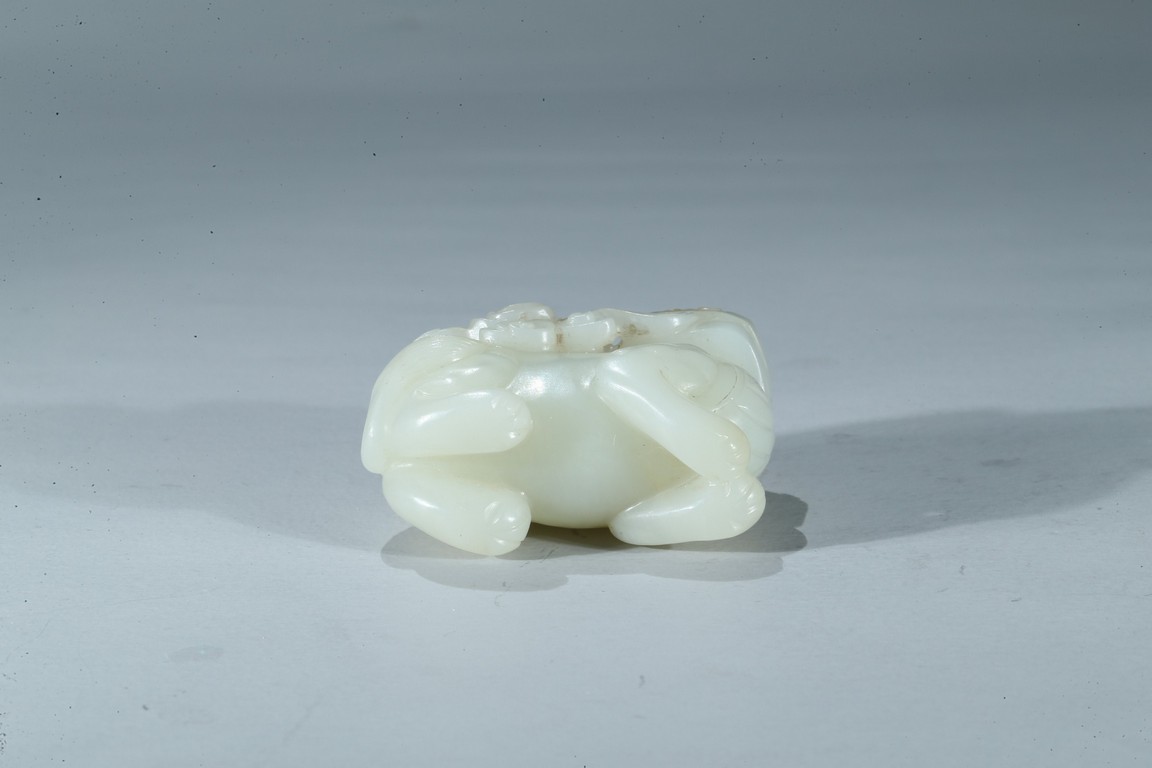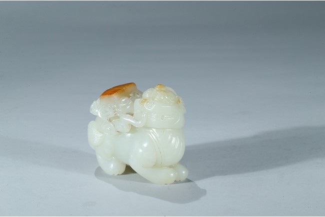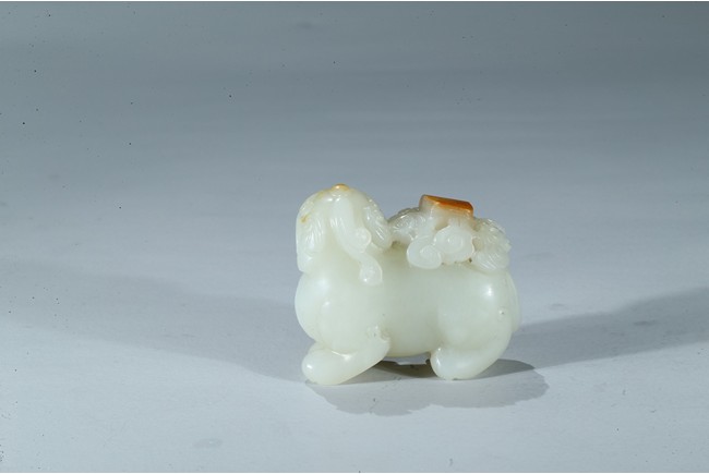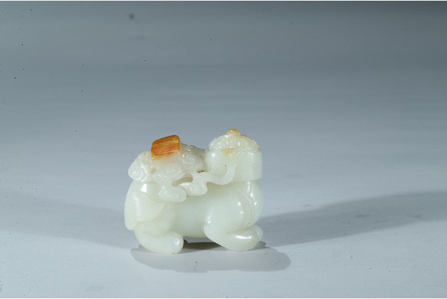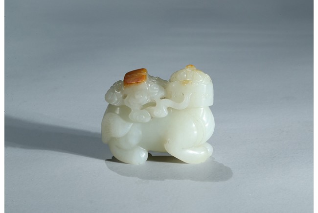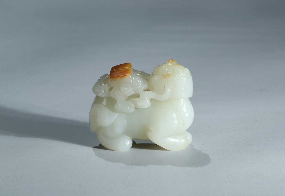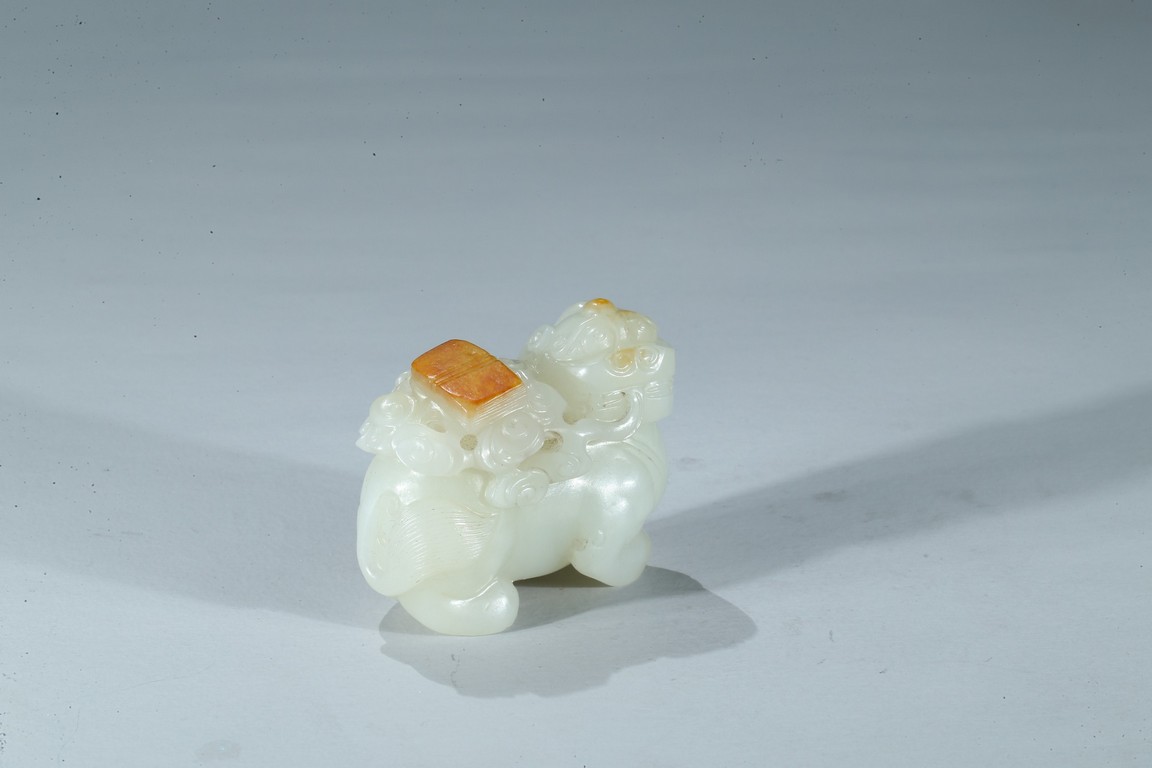 The mythical beast carved standing foursquare, with head turned to the side and smoke issuing from its mouth supporting a book with russet skin. Qing Dynasty period.