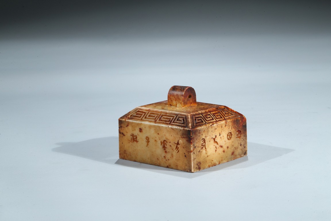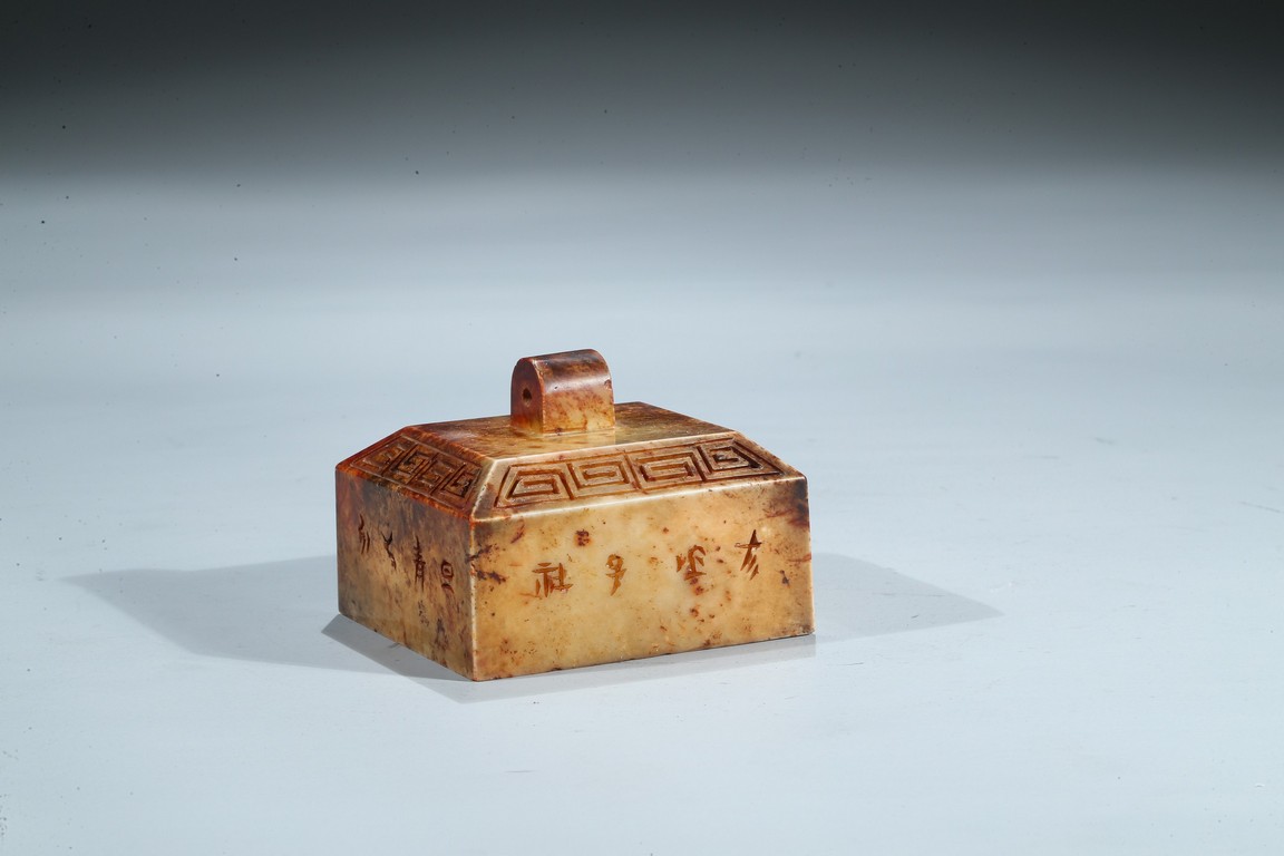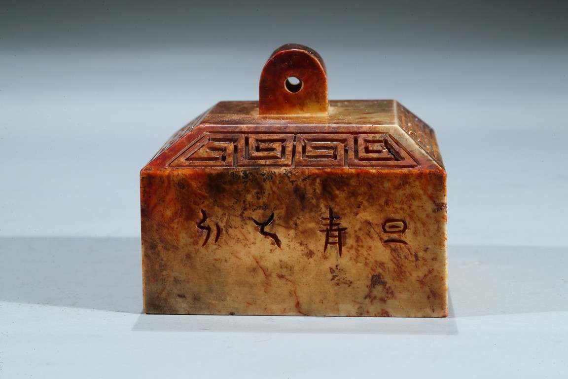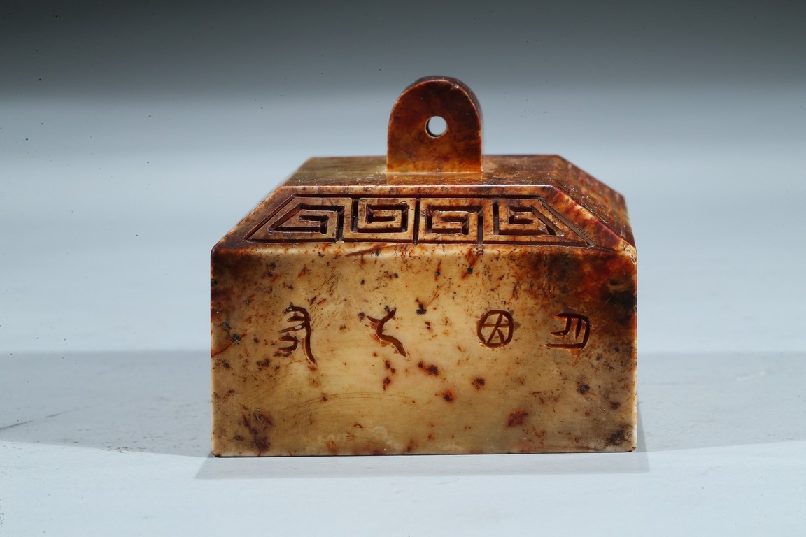 Of square form, each side incised with seal script inscription, top with an arched finial, seal face inscribed with nine characters. Ming Dynasty period.