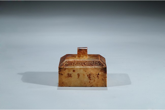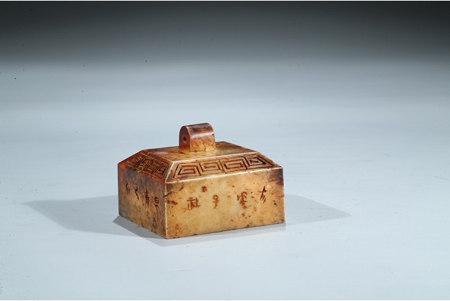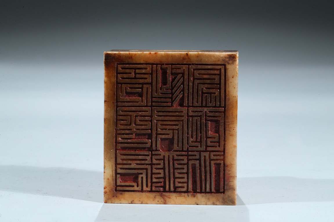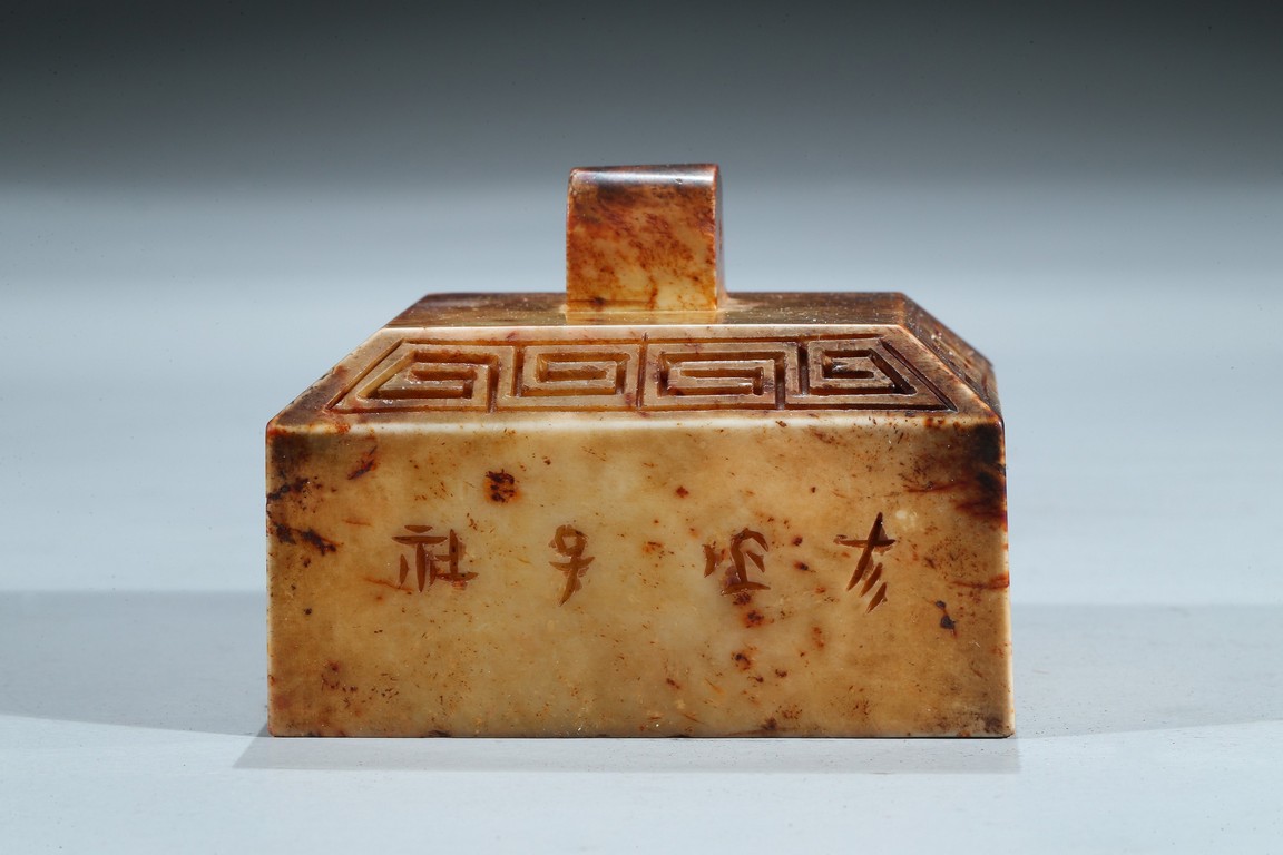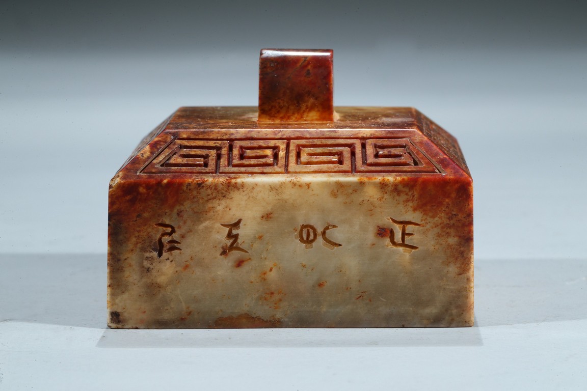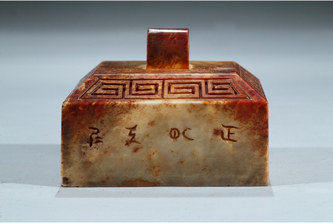 Of square form, each side incised with seal script inscription, top with an arched finial, seal face inscribed with nine characters. Ming Dynasty period.