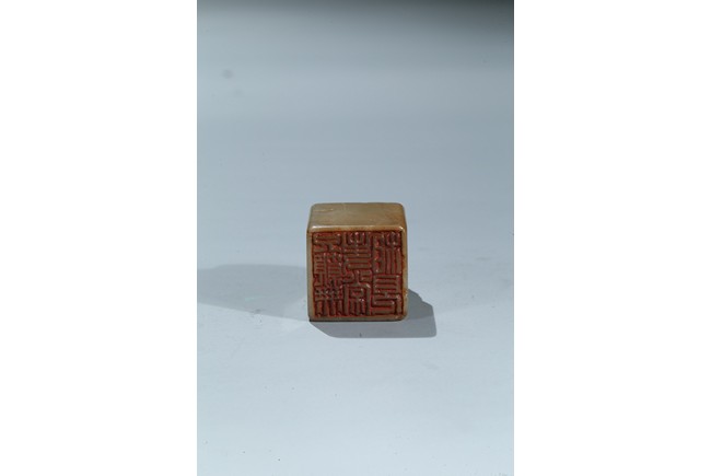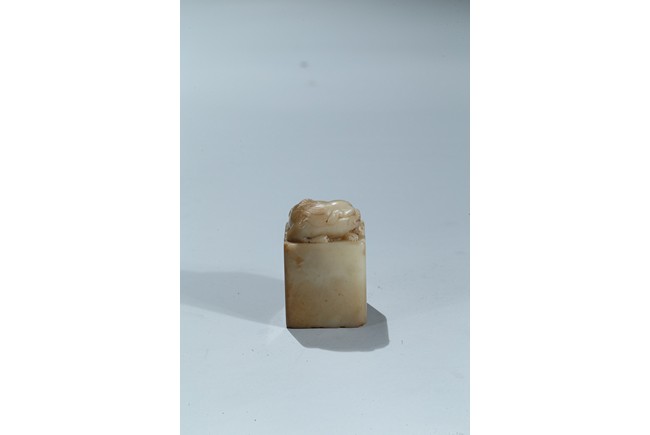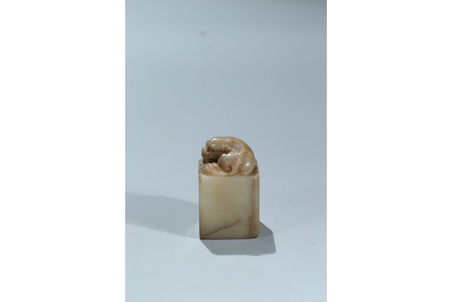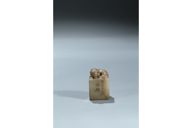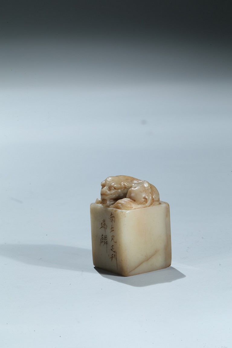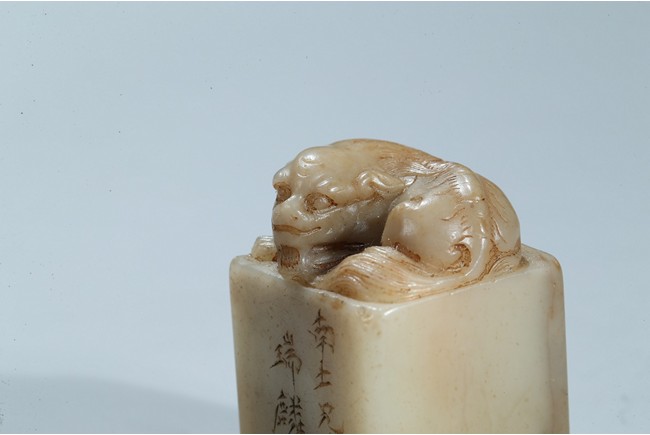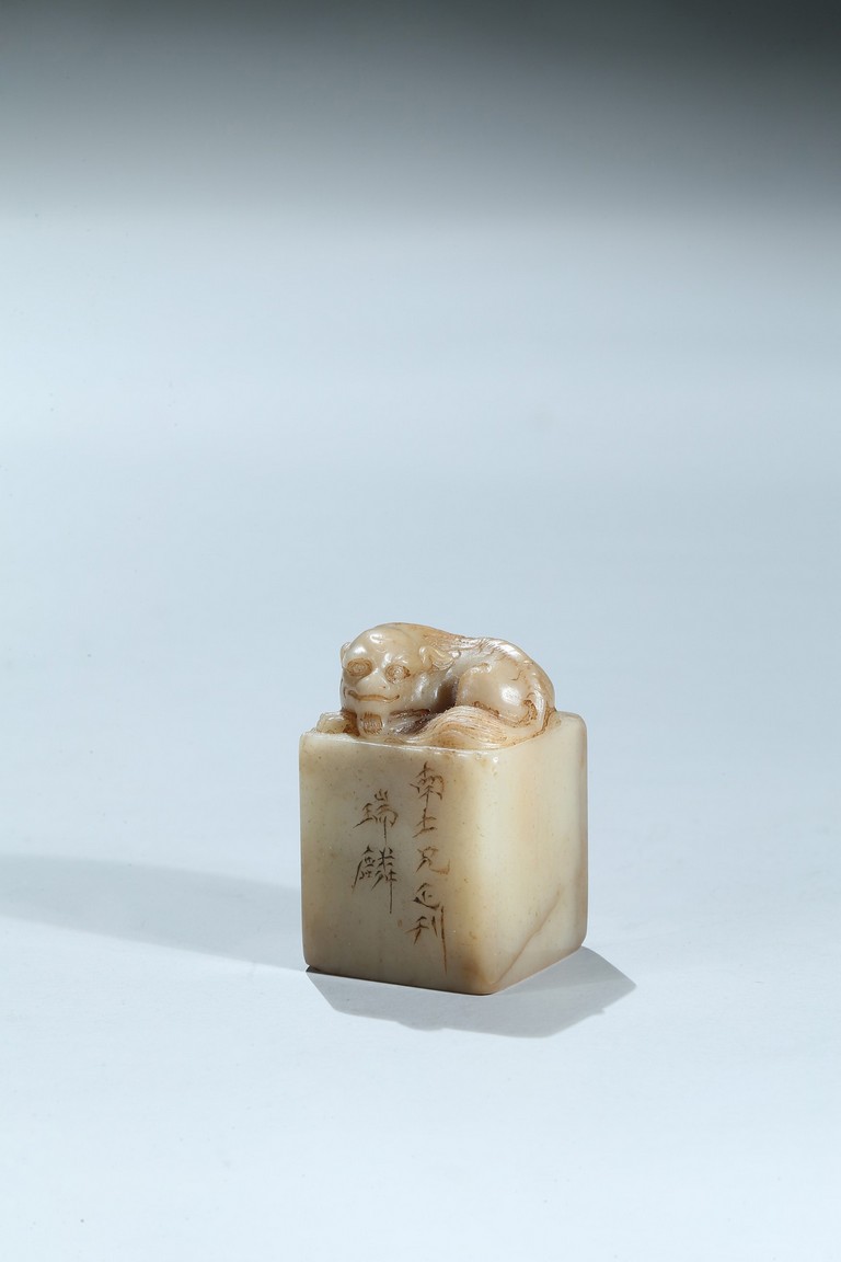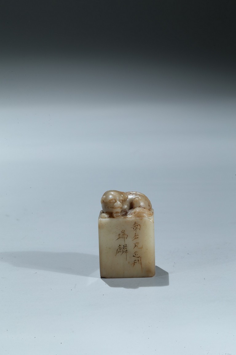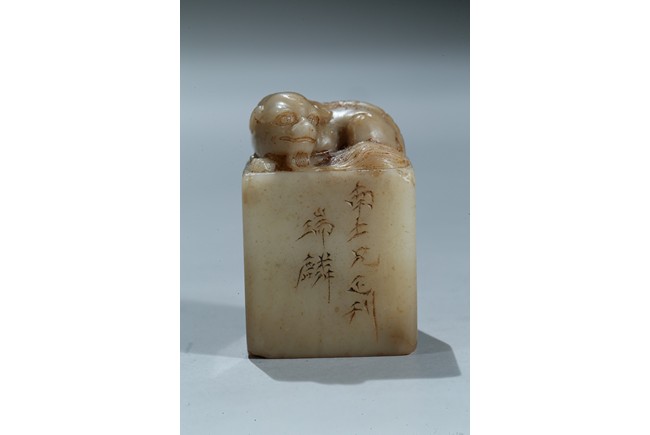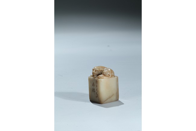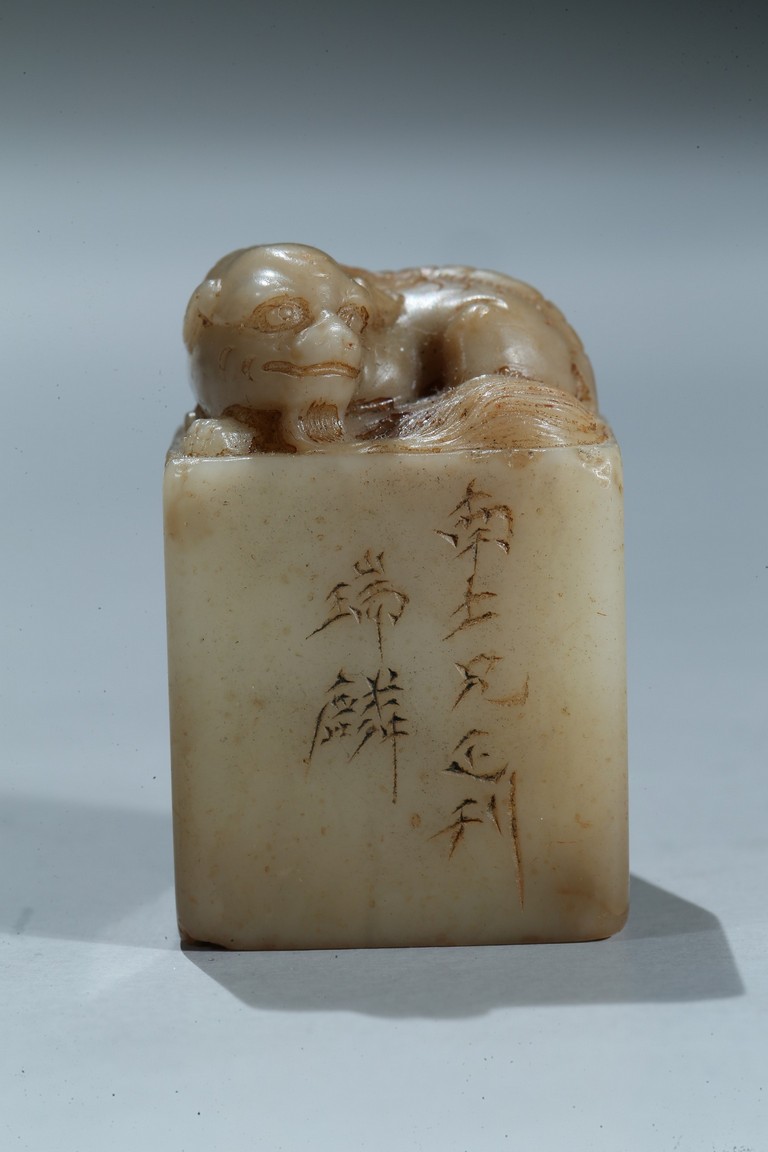 The rectangular seal surmounted with a recumbent mythical beast, with head turned to one side, wide mouth and bulging eyes, mane and tail highly detailed with incised lines, inscription on one side, the base carved with seven characters.Republic period.