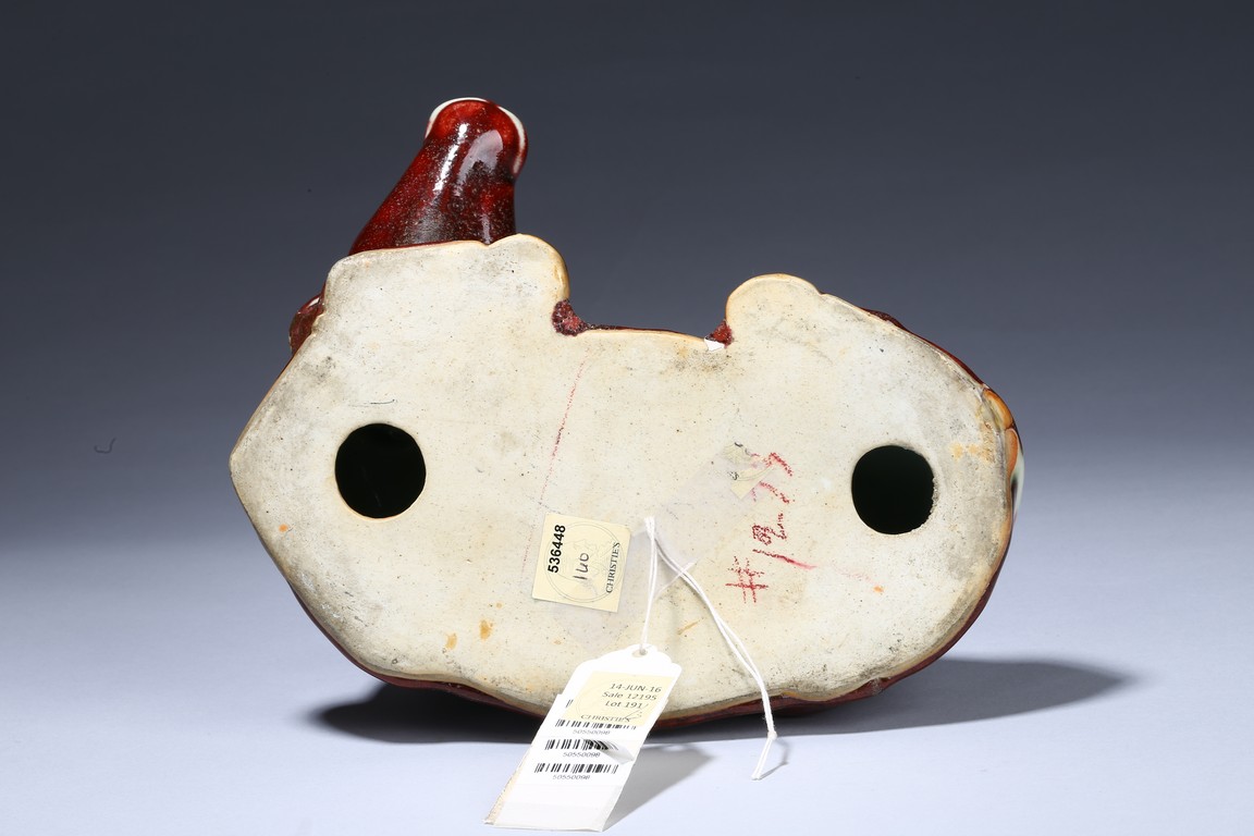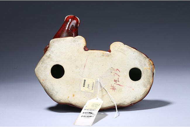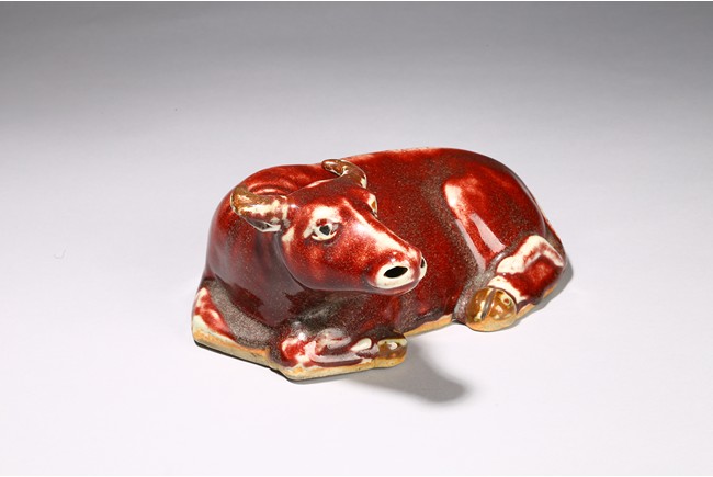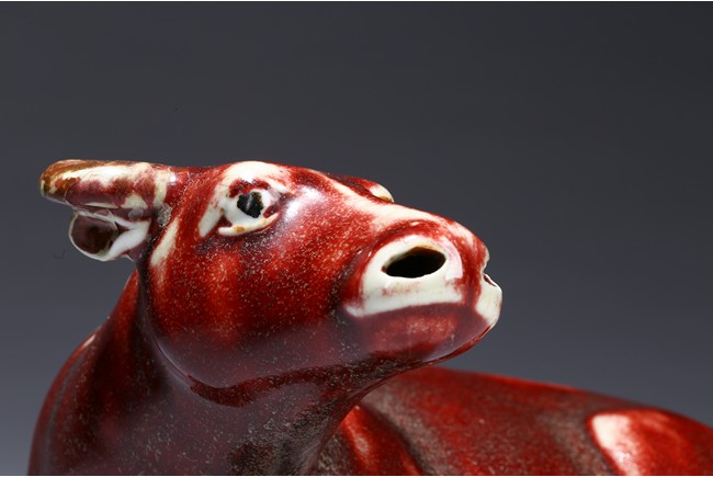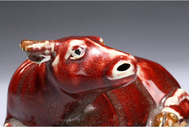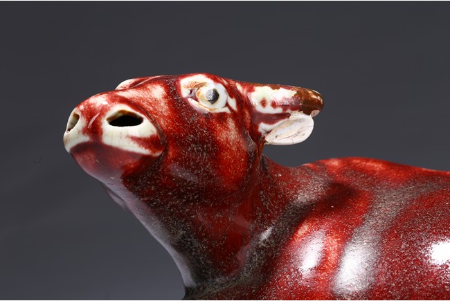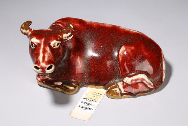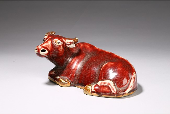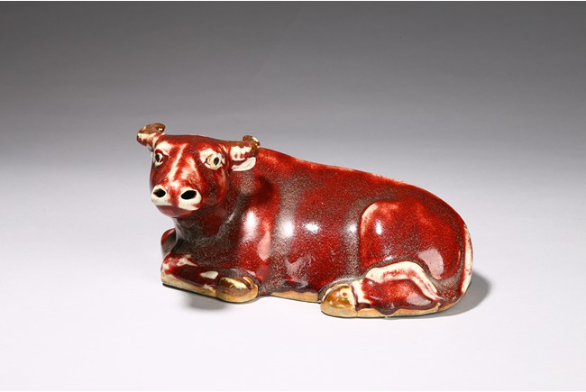 Of recumbent bull with its legs bent to one side,bulging eyes and powerful nose,its tail curled alongside its left haunch. The body applied with flambe glaze,in some creamy-white inclusions. Qing Dynasty period.