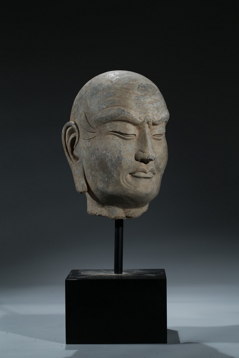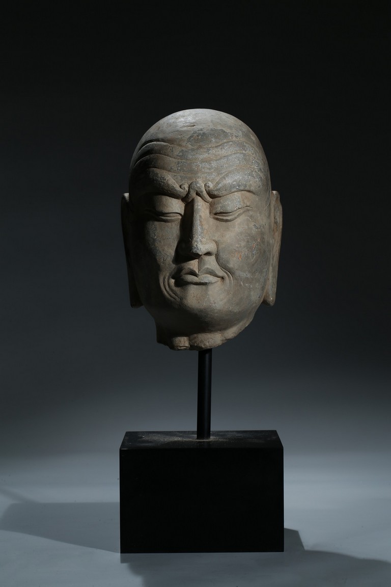 Delicately carved as the head of a luohan, the figure depicted with a stern expression, the face framed by a deeply lined forehead and prominently rendered arched brows above downcast eyes, with rounded cheeks above a pursed mouth flanked by deep wrinkles, all between two long pendulous earlobes. Northern Qi Dynasty period.