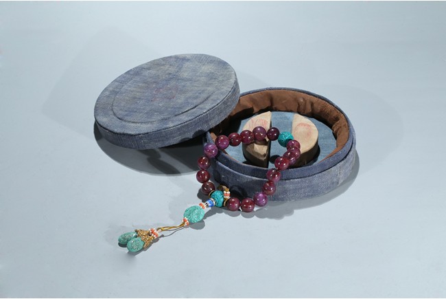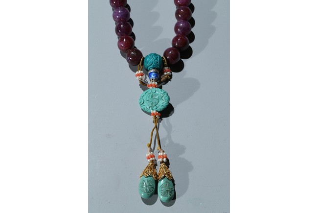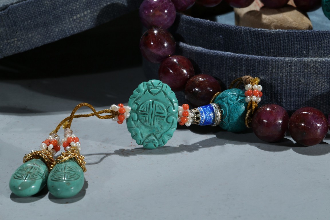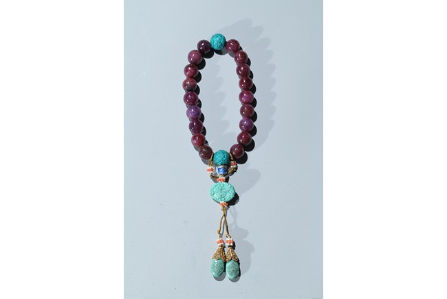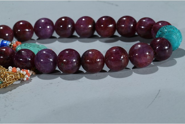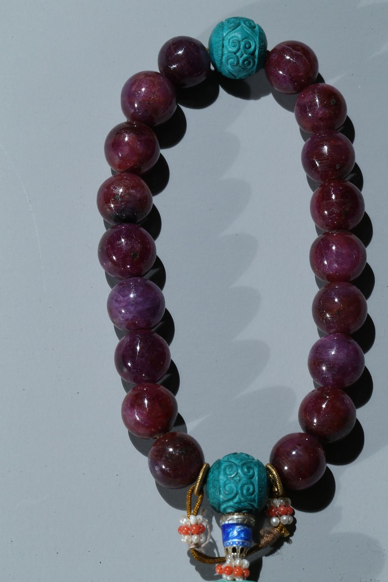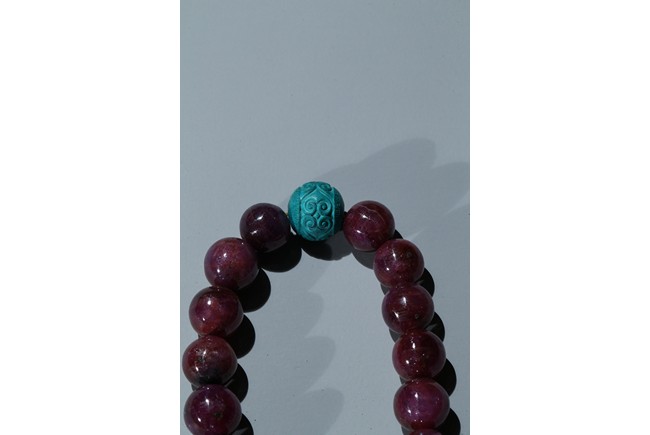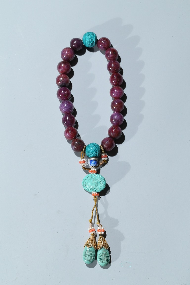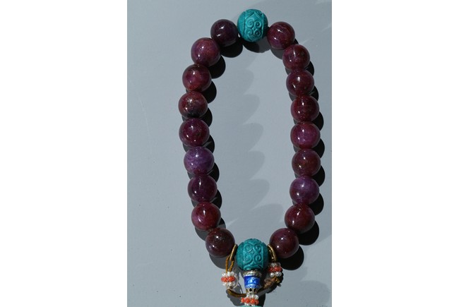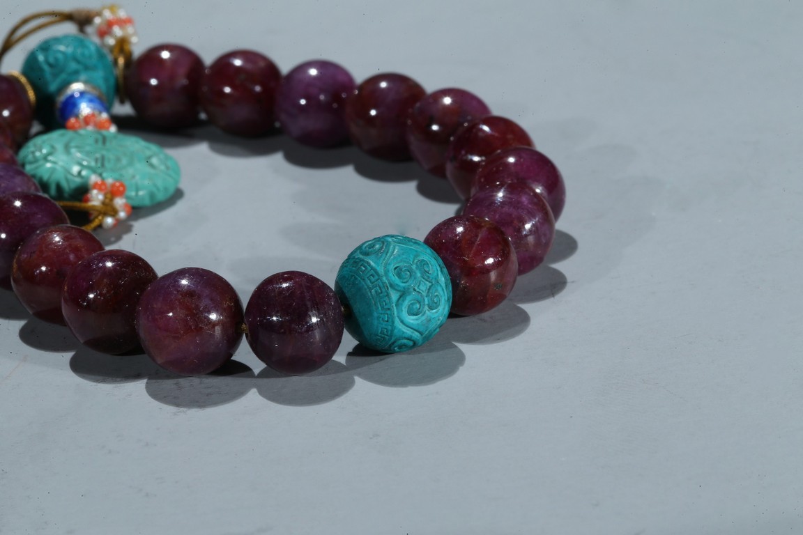 The bracelet comprises eighteen red gem beads, evenly divided by two carved turquoise beads suspending an flat toggle and terminating in two smaller turquoise beads.
