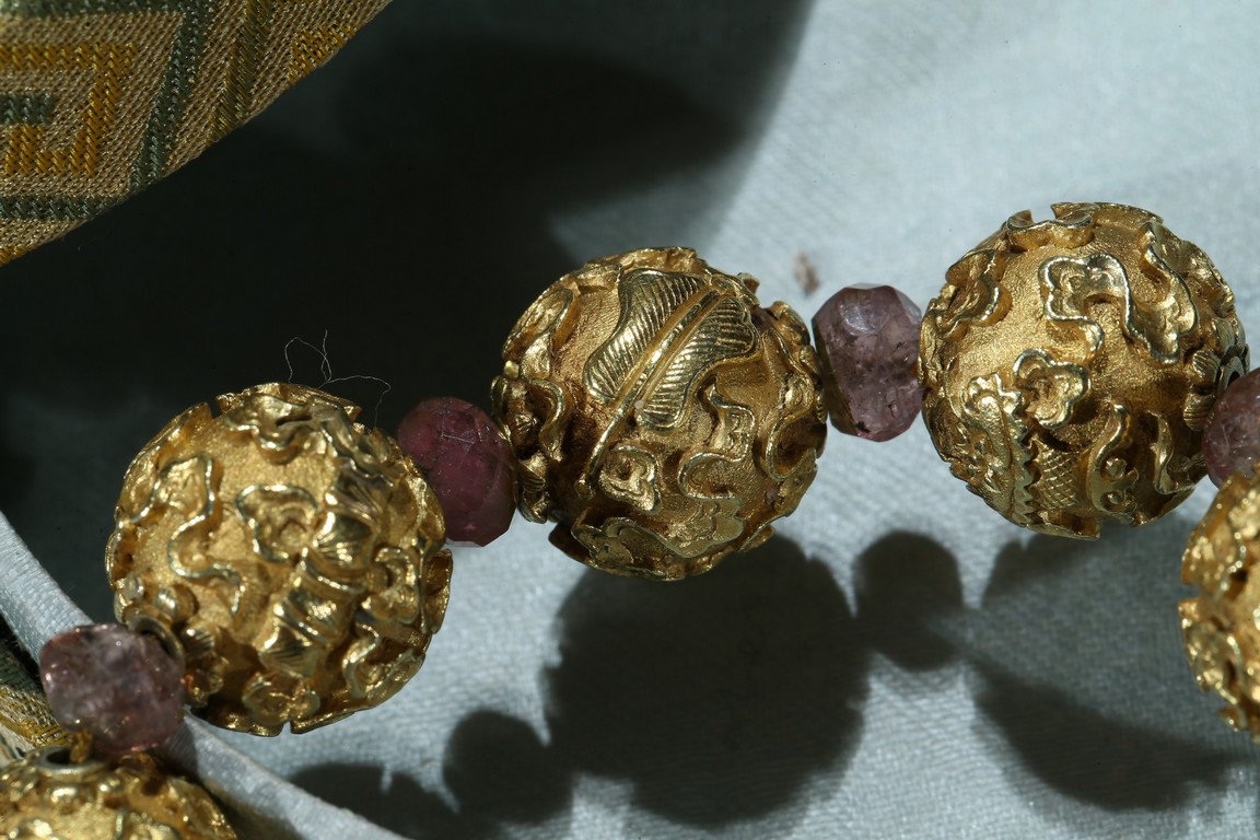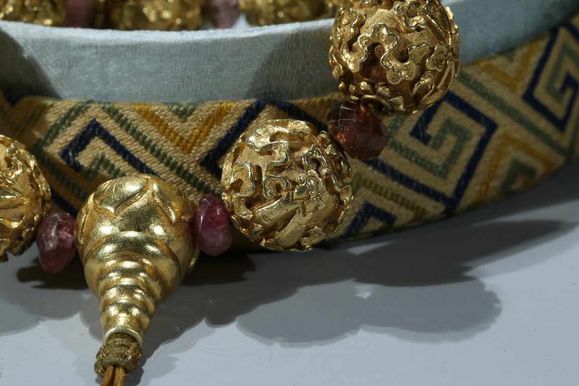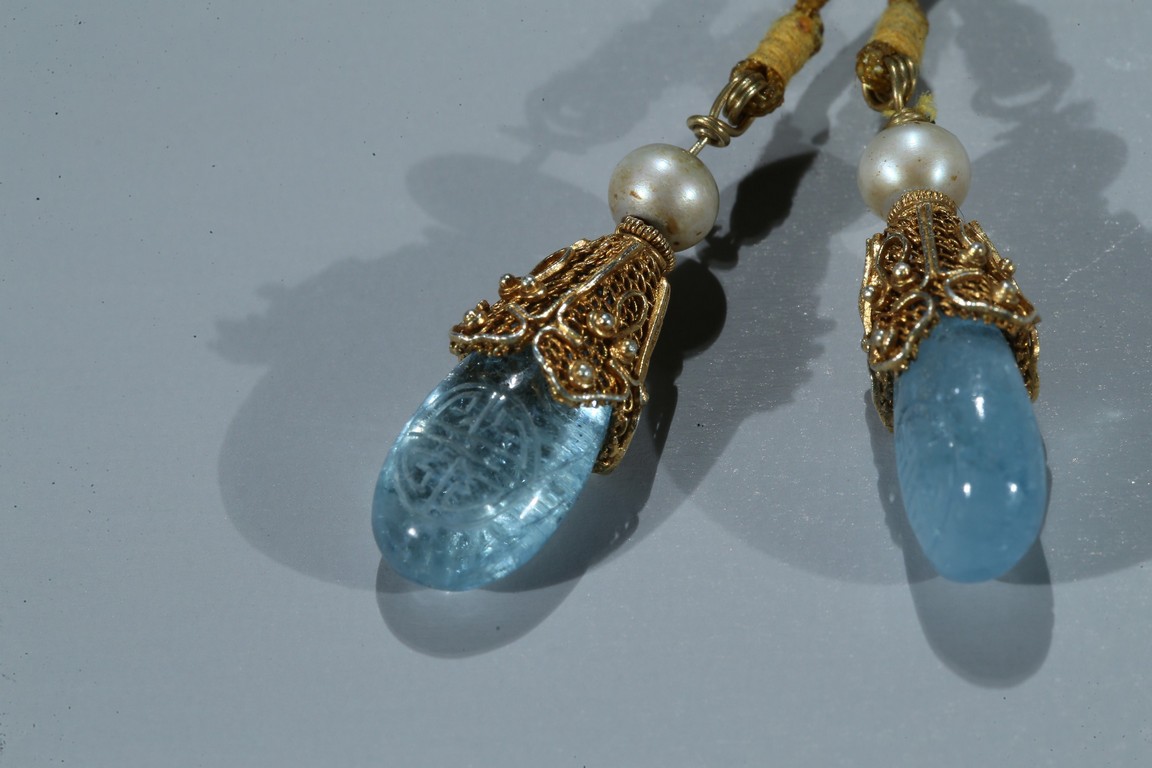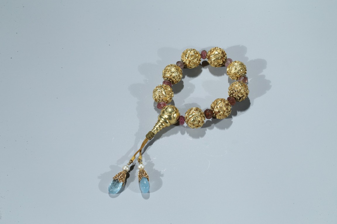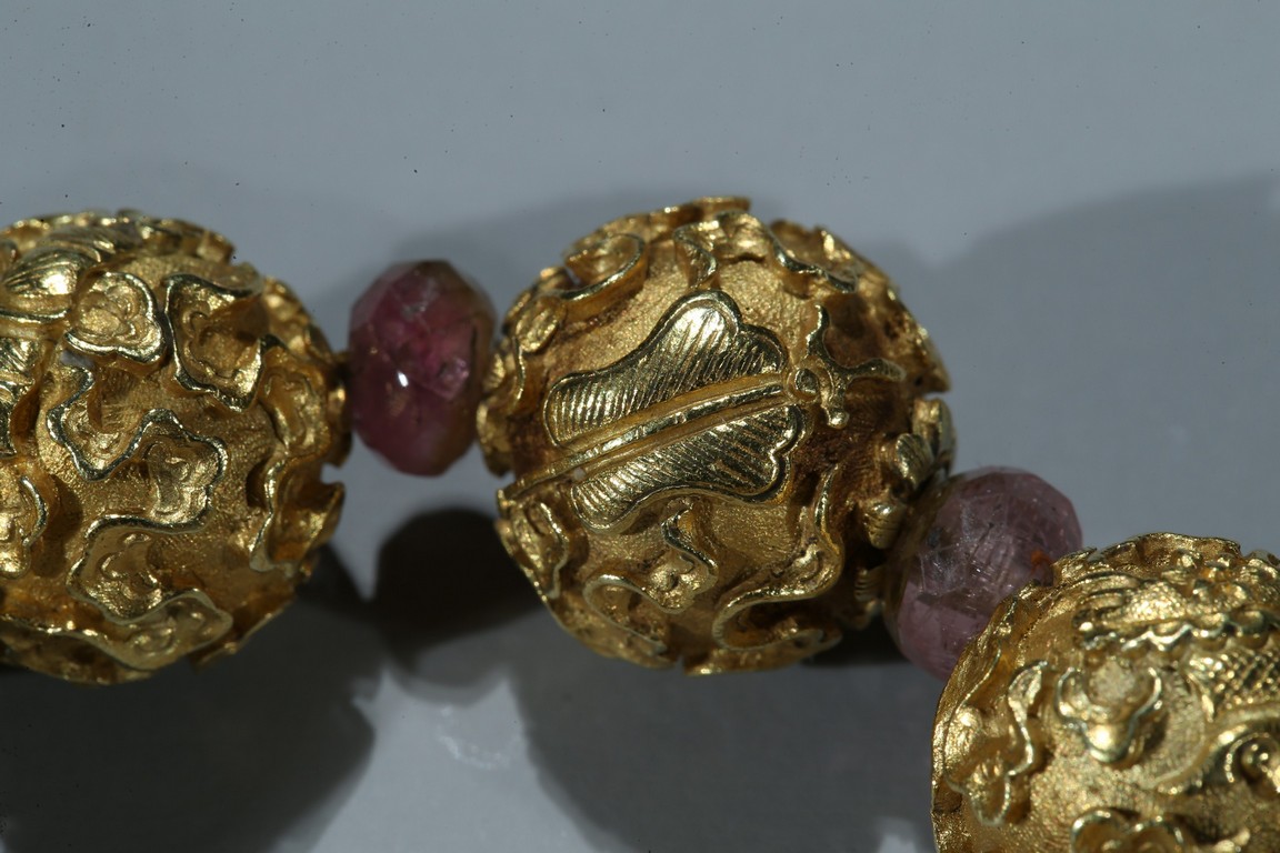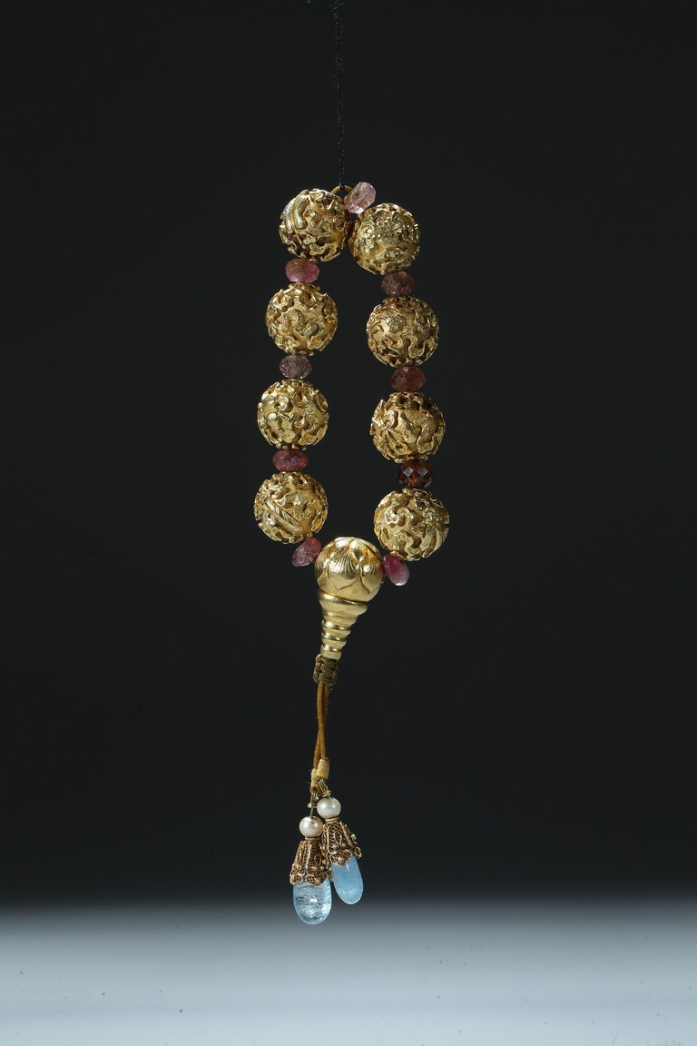 Comprising of twelve gold beads, each cast with one of the eight auspicious motif in relief and spaced by a smaller irregular tourmaline bead, suspending two aquamarine drop shaped beads.Qing Dynasty period.