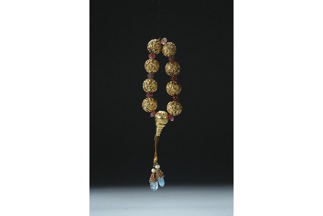 八吉祥亦稱八寶,是佛教中的八種吉祥寶物,分別為寶輪、寶螺、勝利幢、傘蓋、蓮花、寶瓶、雙魚和吉祥結。寶輪象征佛法;勝利幢象征佛法戰勝一切邪魔外道,解除一切煩惱;傘蓋象征佛法張馳自如,遍覆眾生;蓮花象征跳脫一切煩惱和罪惡,升華至潔凈澄明之境地;寶瓶插花或承凈水以供養神佛;雙魚代表豐收富足;吉祥結象征佛法連環貫徹永無止盡。此手串使用了純金圓珠共九顆,其中八顆分別鏨刻八吉祥紋飾,八吉祥簡稱輪、螺、傘、蓋、花、罐、魚、長。 其中每顆金珠之間又以上等碧璽做隔珠,中間為純金佛頭,佛頭下連接純金鑲嵌碧璽、碧璽淺刻團壽紋飾,此八吉祥鏨刻圖案規整、字體清晰有力。寓意吉祥,制作一絲不茍,獨具匠心,純金的古樸靜雅與碧璽的富麗華貴相結合,達到了天衣無縫、交相輝映的藝術效果,應為當時皇室成員祝壽嘉禮。清代皇帝信奉藏傳佛教,不僅在紫禁城中興建大大小小的佛堂,而且大量制作與佛堂供奉相關的器物,念珠也在宮廷造辦處制作器物之列。來源:南加州聖地亞哥家族舊藏 Privenance: Private family collection, San Diego, California