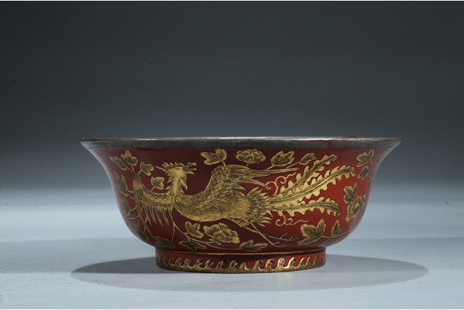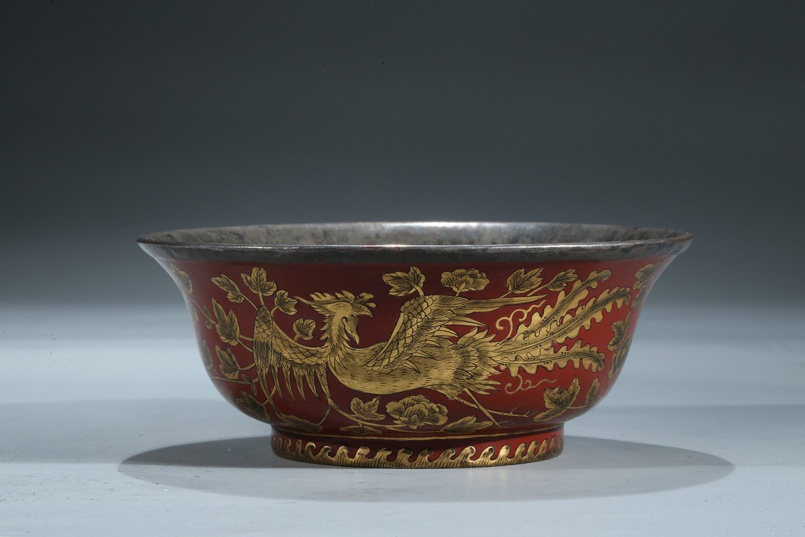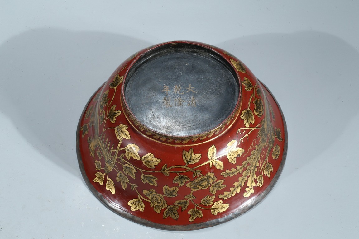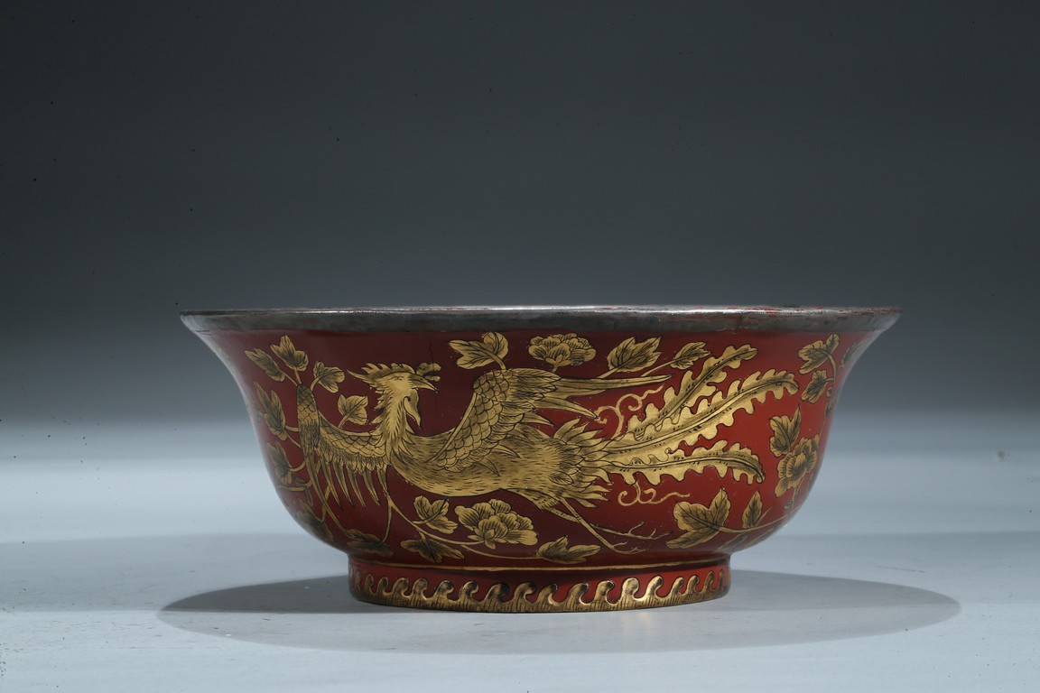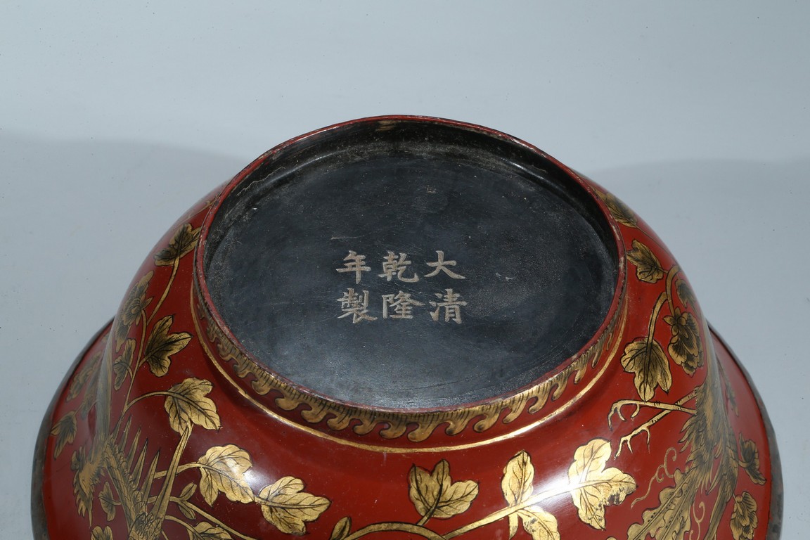 Of rounded sides and rising to everted rim, the exterior delicately painted in gilt to depict phoenix amidst meandering leafy scrolls, all reserved in red lacquer ground, the base inscribed with six character mark. Qing Dynasty period.
